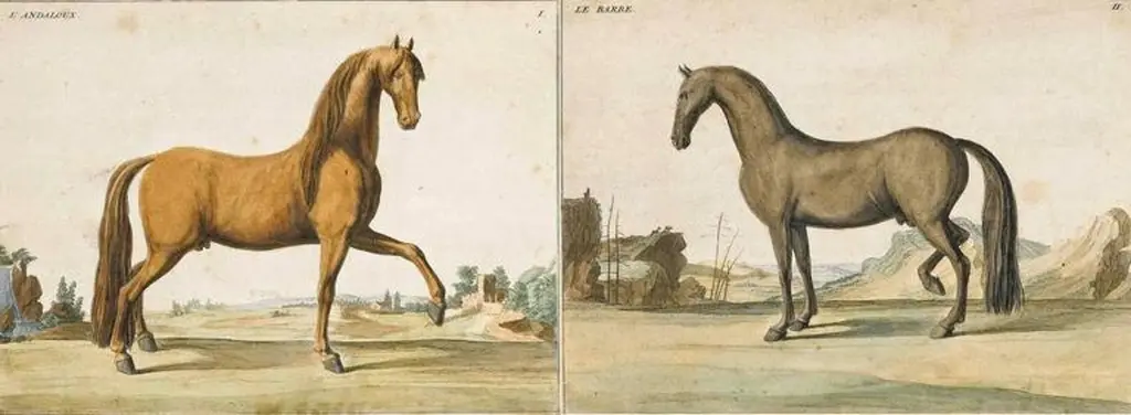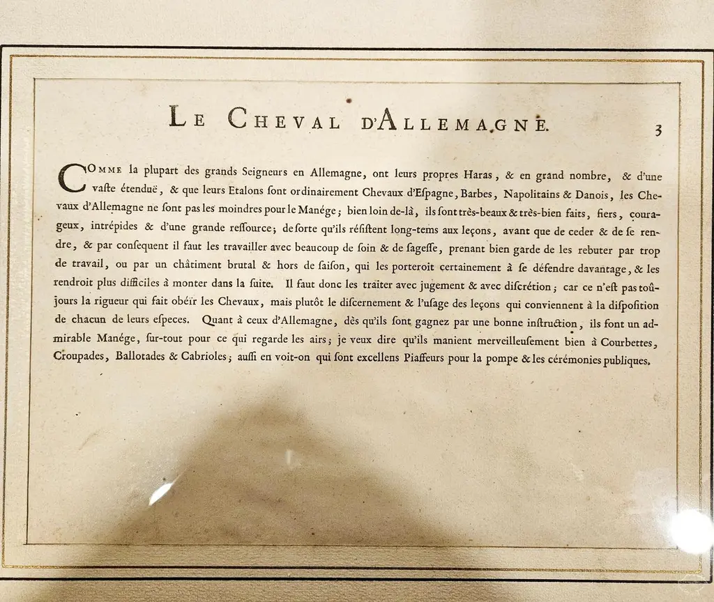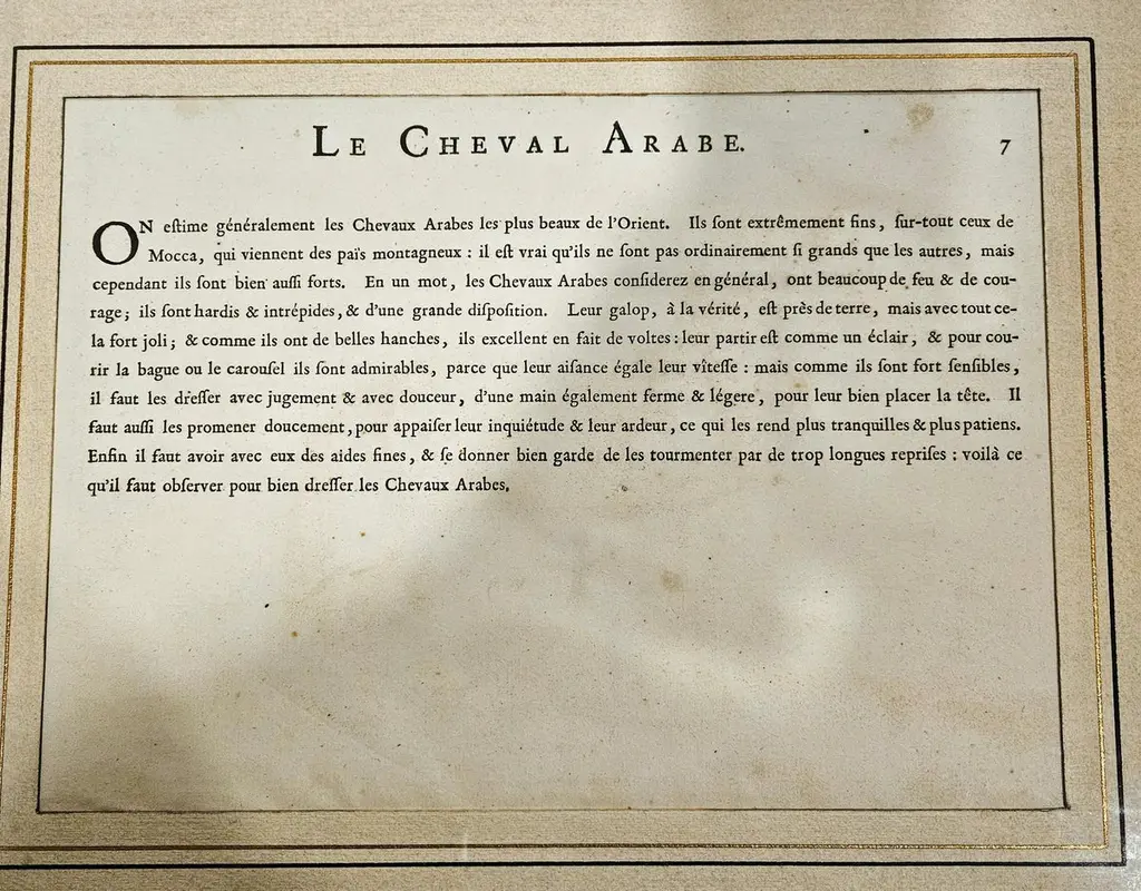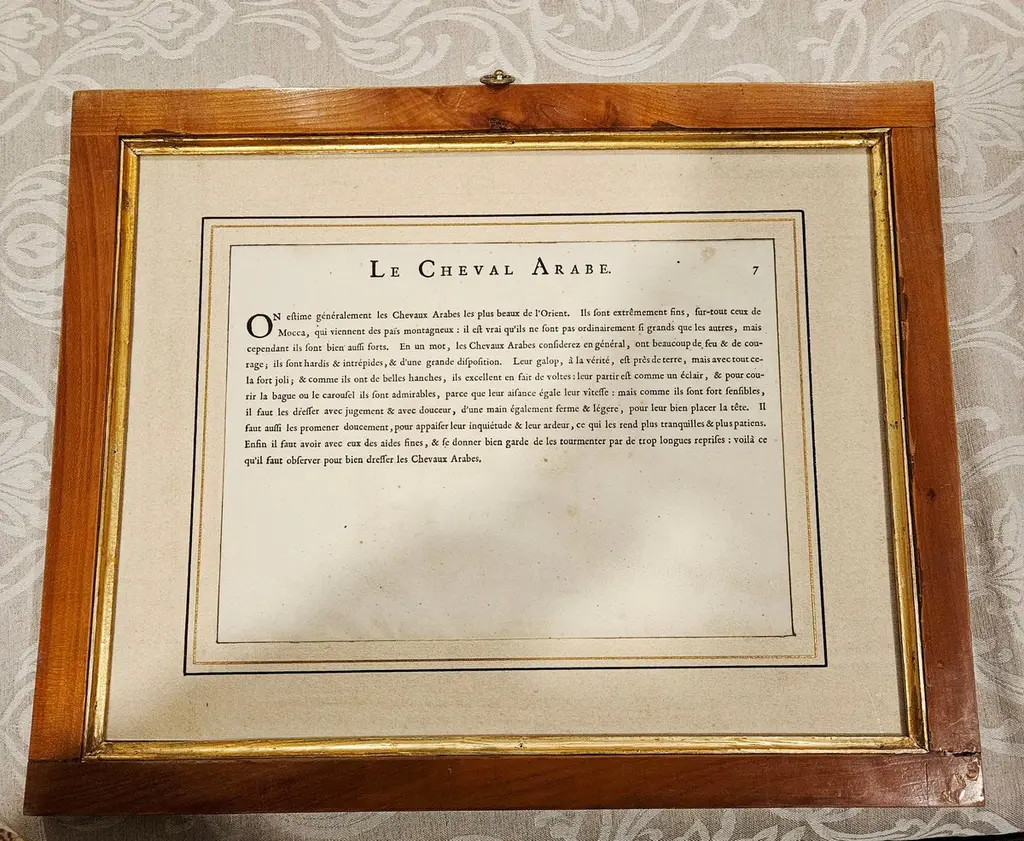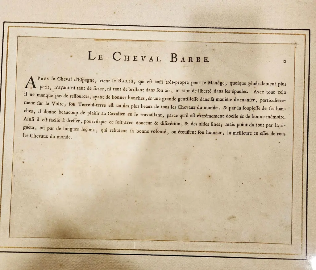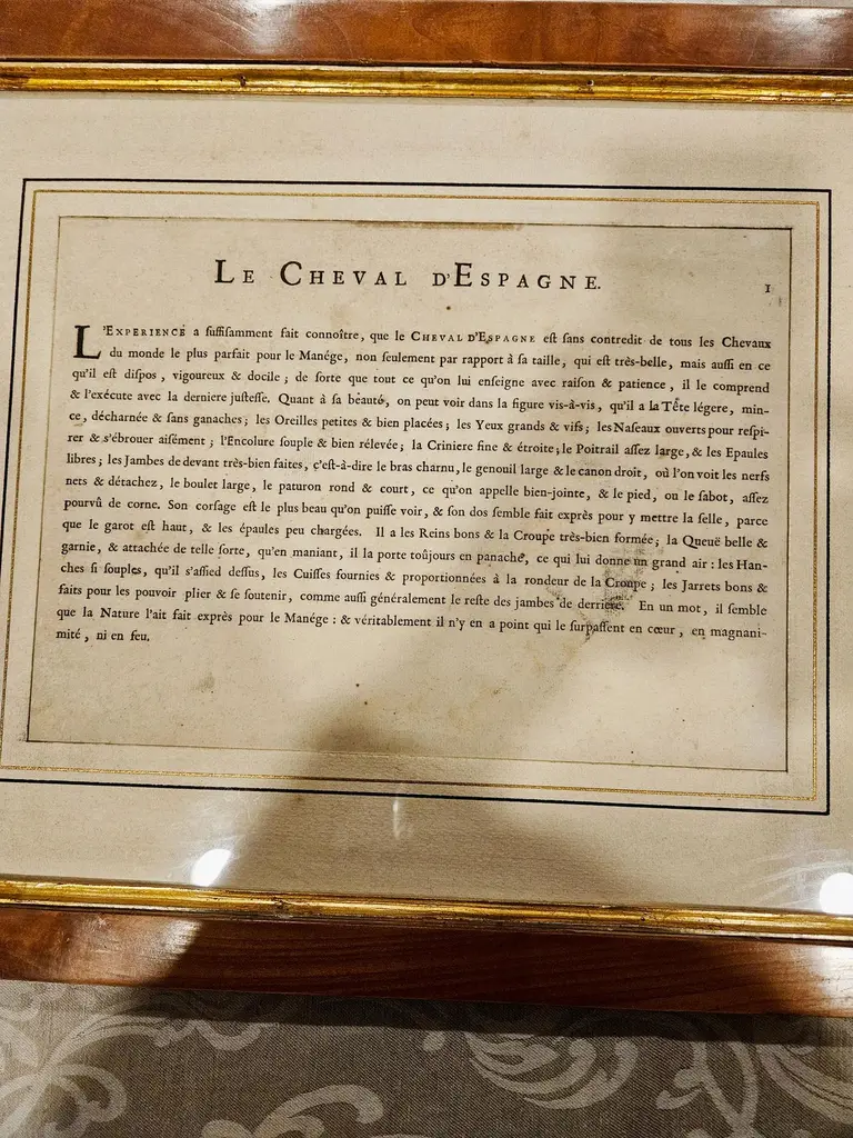 Hand colored prints of horses from "L'art de monter a cheval: ou description du manége moderne, dans sa perfection" by Baron D'Eisenberg, Published in 1747.Each print is mounted in a cherrywood parcel-gilt frame, with a glazed reverse depicting the corresponding text sheet and can be sold as pairs.The following subjects are depicted:1. L'Andaloux, Le Cheval d'Espagne, Plate I; 2. Le Barbe, Le Cheval Barbe, Plate II, 3. L'Allemand, Le Cheval d'Allemagne, Plate III;4. L'Arabe, Le Cheval Arabe, Plate VII, Reference: These prints were originally part of an illustrated book Baron d'Eisenberg made describing the art of the cavaliers and depicting the different breeds of horses-L'art de monter a cheval: ou Description du manége moderne, dans sa perfection. The author, a German horseman, and artist, spent some of his youth at the manège of Saxe-Weimar before entering into the service of the Emperor. He then spent six years in Naples as the Master of Horse of the Viceroy before returning to Vienna where he studied under M. de Regenthal, the imperial Master of Horse. He participated in the coronation of Emperor Charles V at Frankfurt in 1711, then spent some time in England, but was back in Germany before 1753. He probably died in Tuscany where he was Director and Master of the Horse at the Academy in Pisa. Brunet II, 957; Mennessier de la Lance I, p. 438.