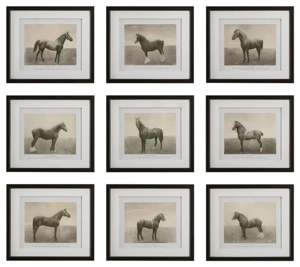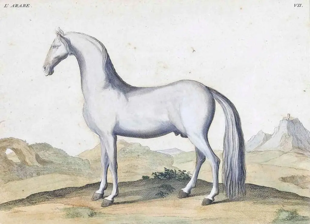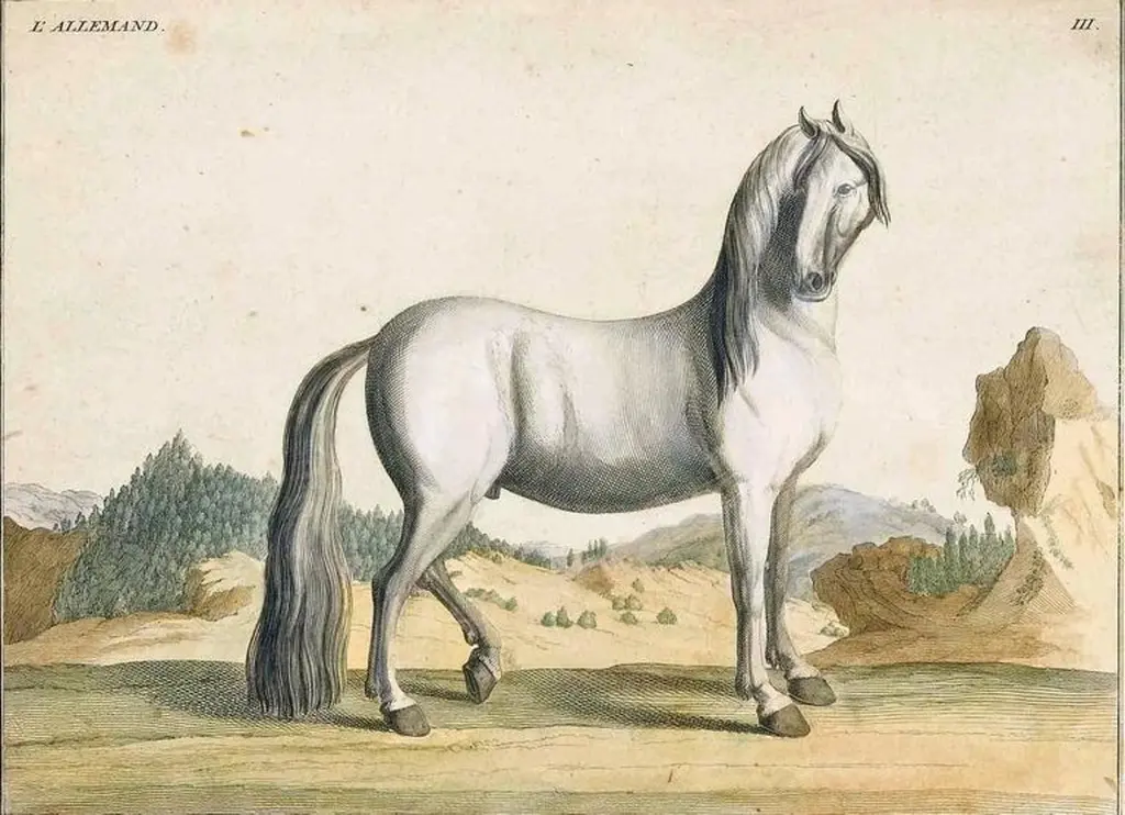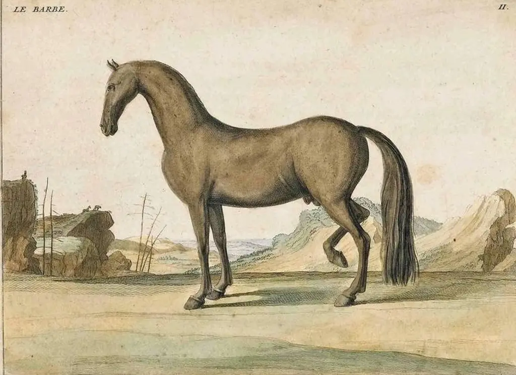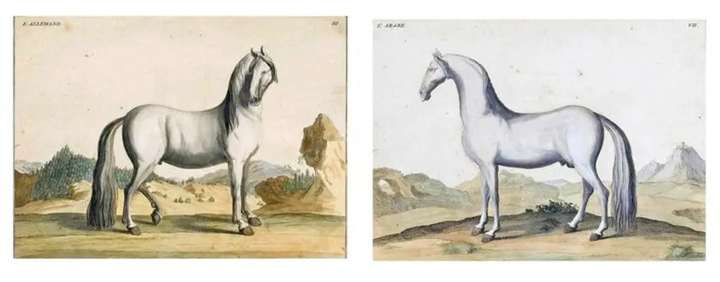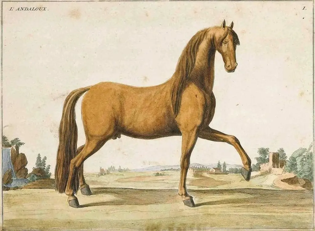 Hand colored prints of horses from "L'art de monter a cheval: ou description du manége moderne, dans sa perfection" by Baron D'Eisenberg, Published in 1747.Each print is mounted in a cherrywood parcel-gilt frame, with a glazed reverse depicting the corresponding text sheet and can be sold as pairs.The following subjects are depicted:1. L'Andaloux, Le Cheval d'Espagne, Plate I; 2. Le Barbe, Le Cheval Barbe, Plate II, 3. L'Allemand, Le Cheval d'Allemagne, Plate III;4. L'Arabe, Le Cheval Arabe, Plate VII, Reference: These prints were originally part of an illustrated book Baron d'Eisenberg made describing the art of the cavaliers and depicting the different breeds of horses-L'art de monter a cheval: ou Description du manége moderne, dans sa perfection. The author, a German horseman, and artist, spent some of his youth at the manège of Saxe-Weimar before entering into the service of the Emperor. He then spent six years in Naples as the Master of Horse of the Viceroy before returning to Vienna where he studied under M. de Regenthal, the imperial Master of Horse. He participated in the coronation of Emperor Charles V at Frankfurt in 1711, then spent some time in England, but was back in Germany before 1753. He probably died in Tuscany where he was Director and Master of the Horse at the Academy in Pisa. Brunet II, 957; Mennessier de la Lance I, p. 438.