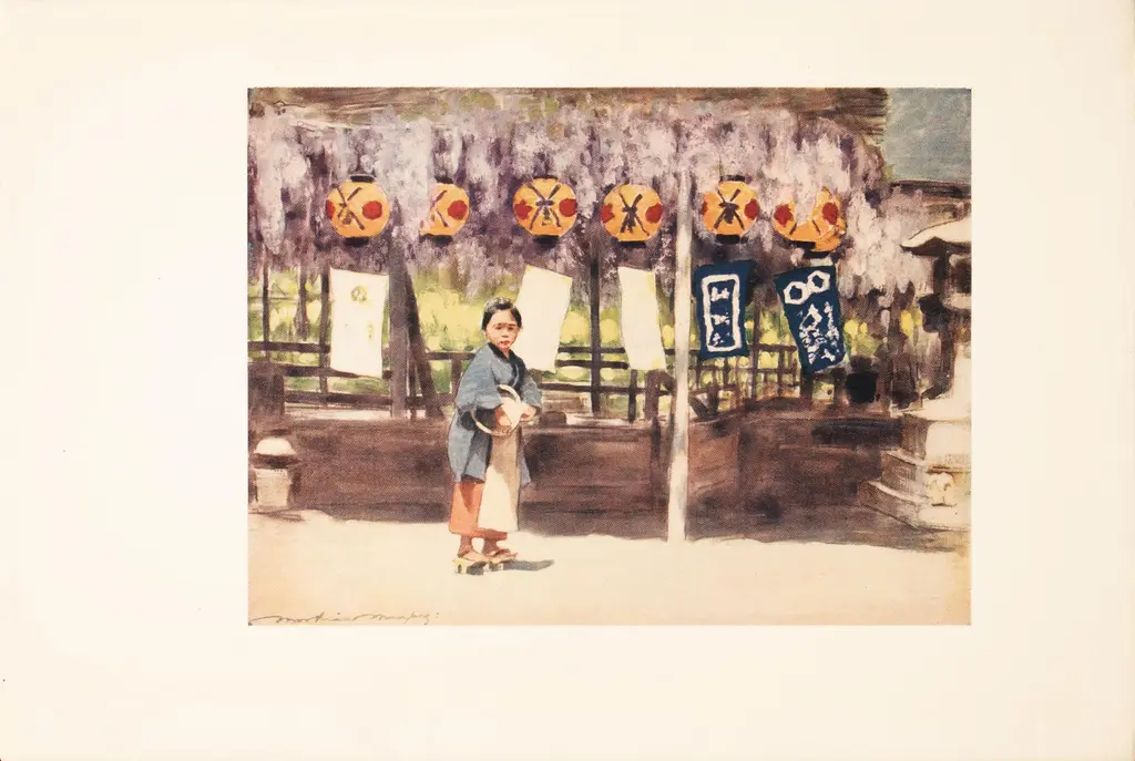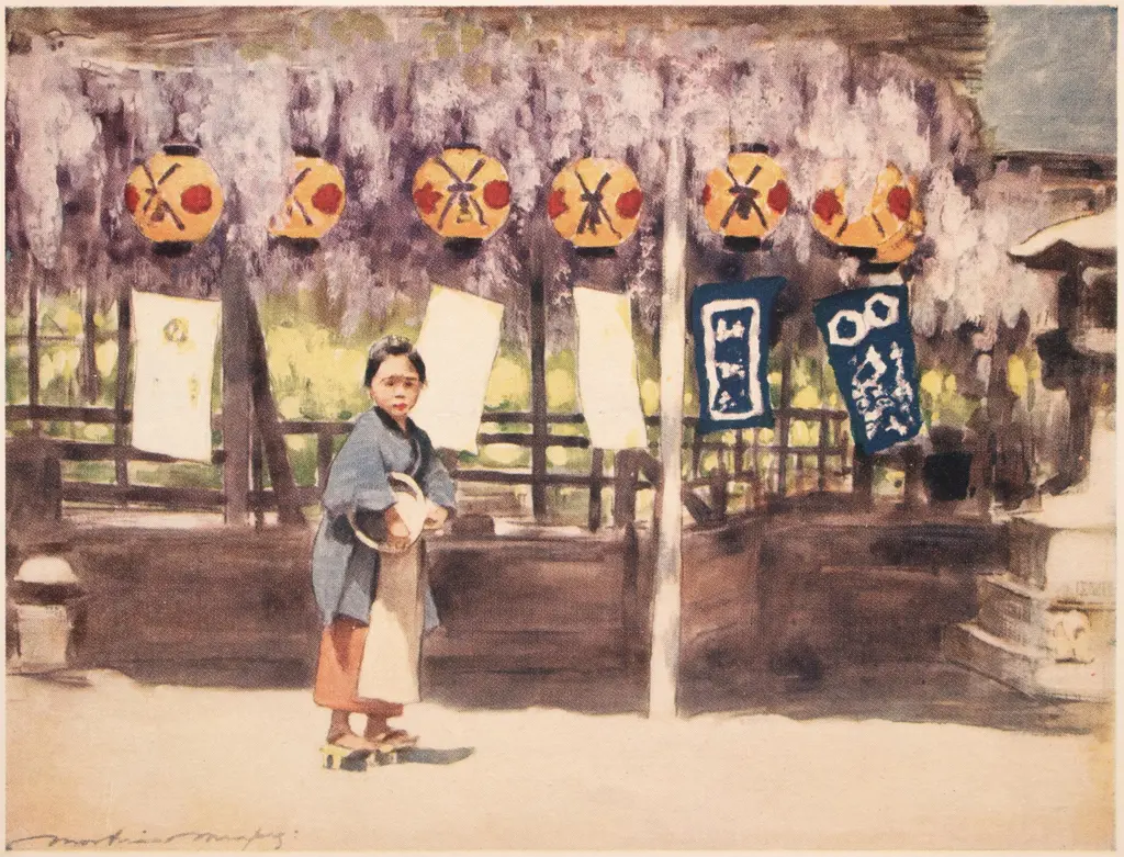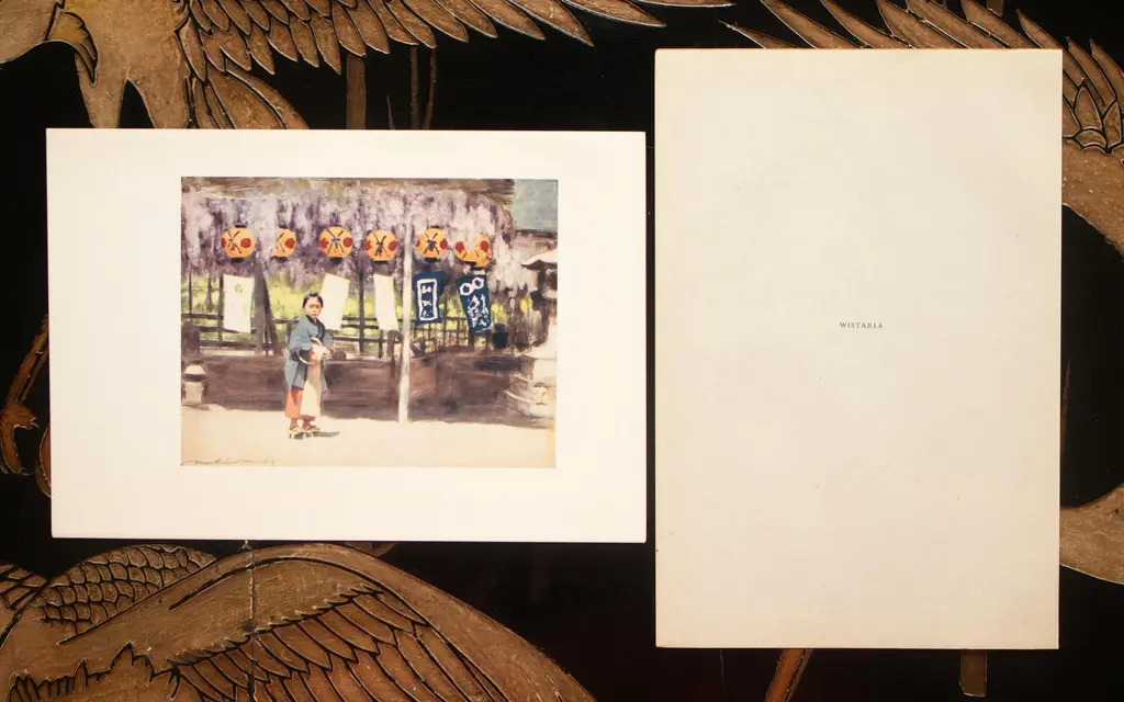 A stunning original period small antique full-color print of Japan "Wistaria" by Mortimer Menpes (1855-1938) after watercolor painting by Mortimer Menpes. Gold leafed top edge. Published in December 1901 in London. Comes with original title page. Excellent condition - minor edge wear, never framed. Second copy comes without title page. Overall 8.75"W x 5.95"H Image 5.5"W x 4.25"H Mortimer Luddington Menpes was an Australian-born English artist, author, printmaker, illustrator, member of the Royal Society of Painter-Etchers & Engravers, Royal Society of British Artists, Royal Institute of Painters in Water Colours, and Royal Institute of Oil Painters.