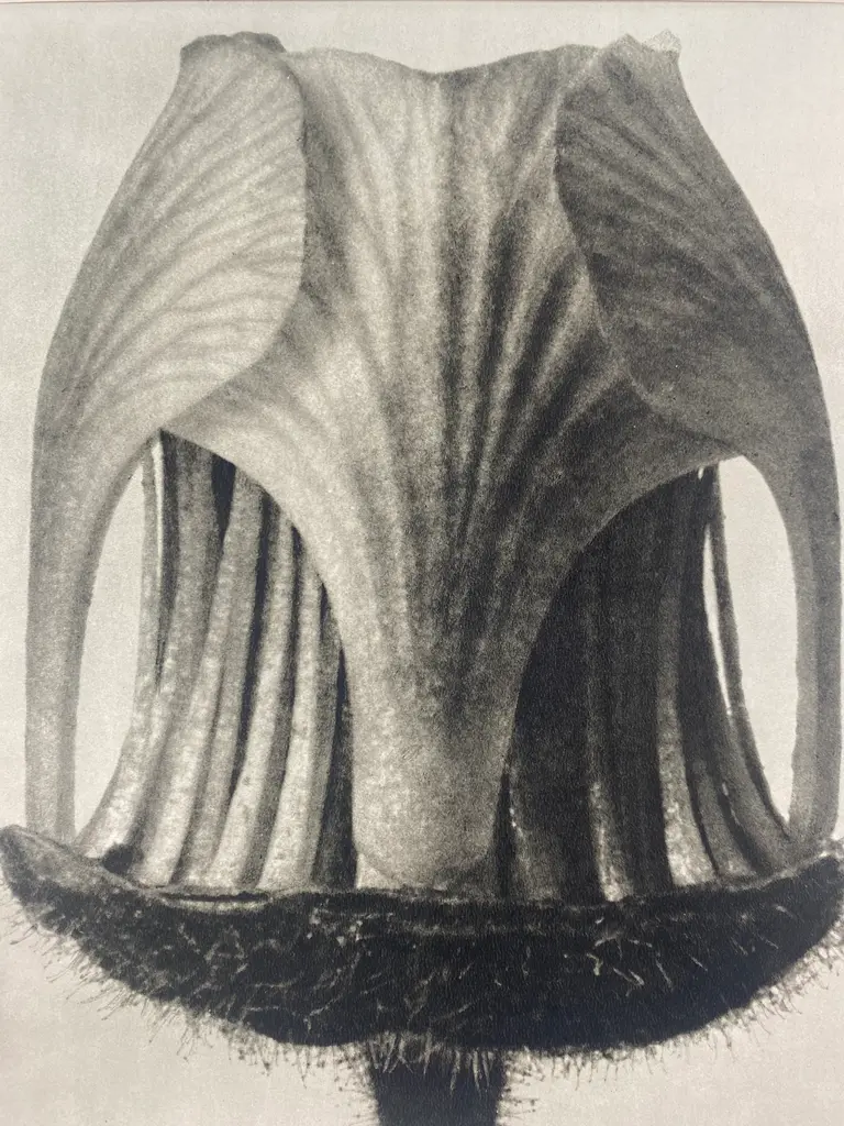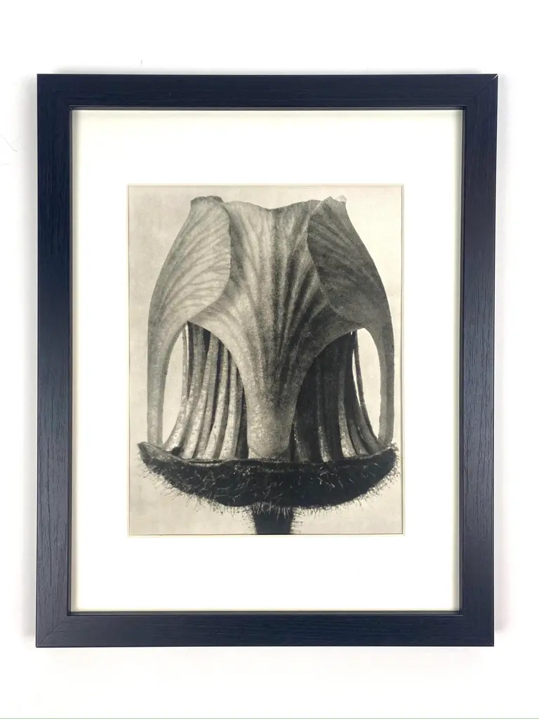 Exquisite Botanical photogravure from famed Urformen Der Kunst portfolio by Blossfeldt . Karl Blossfeldt (1865 - 1932) was a German professor of sculpture, artist and photographer. His images were some of the most innovative photographic work of the time. He is best known for his magnified photographs of plants. Blossfeldt actually made his own camera that could magnify up to thirty times. He revealed extraordinary shapes in plants. This particular botanical image is No. 72 - Water Avens. Enlarged 8X. The frame is wooden, painted black, with glass