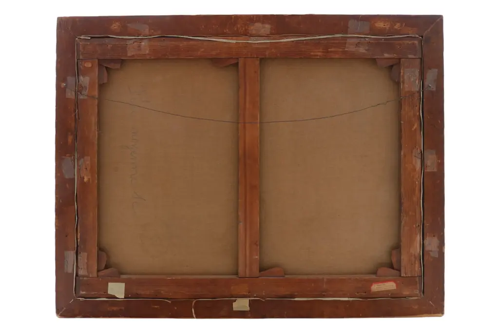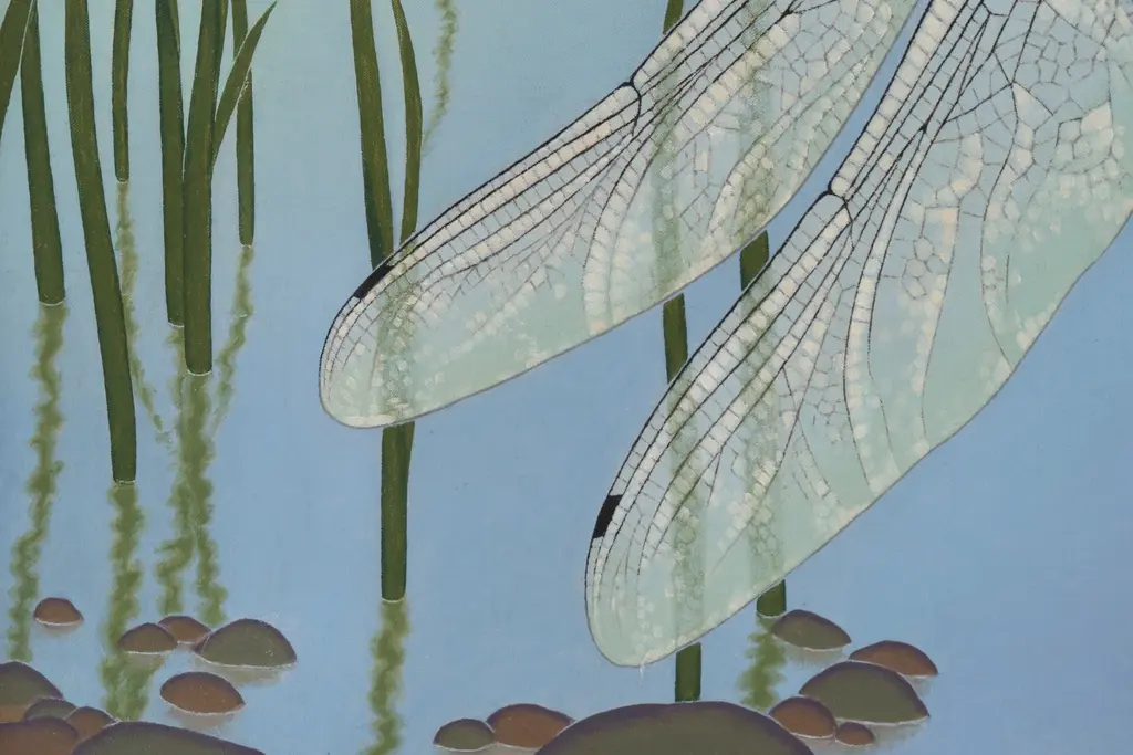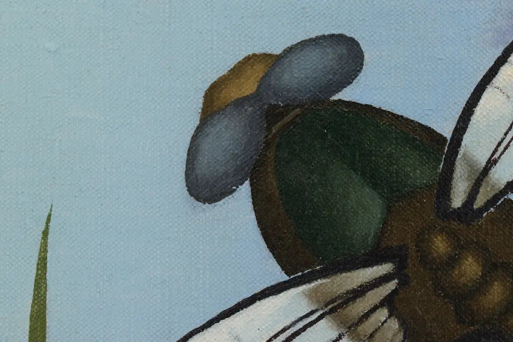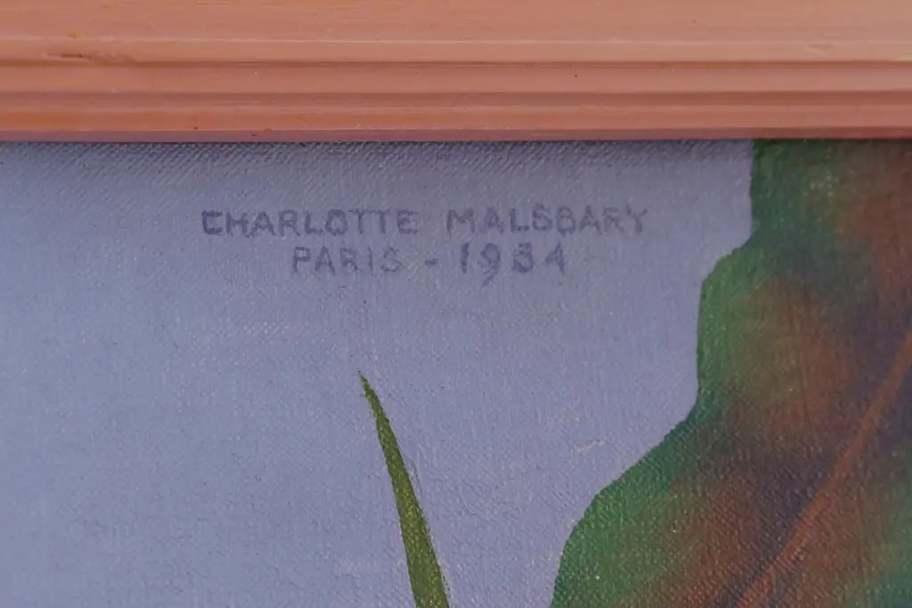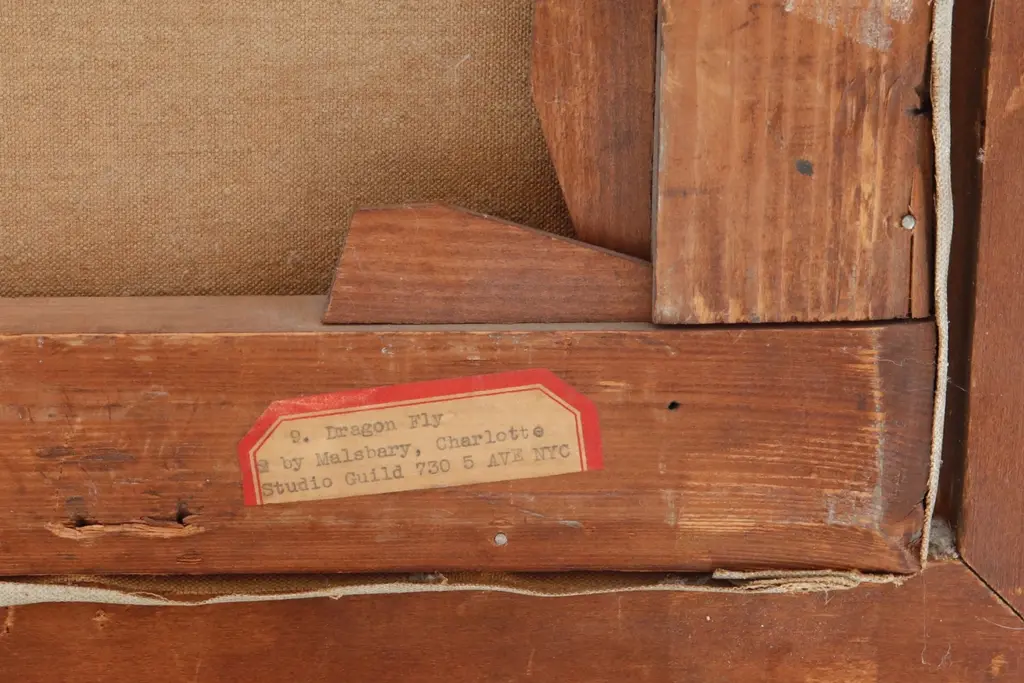 A serene oil on canvas signed at the center top ��Charlotte Malsbary’, and dated 1934. The scene depicts a dragonfly with delicate wings, set against a pebbled shore with blooming purple irises. The water reflects soft clouds in an evening sky. Set in a coral-colored frame. In the back to the right is a label that reads “ 9. Dragon Fly by Malsbary, Charlotte Studio Guild 750 5 Ave NYC”, to the left in pencil reads “Fine Moyenne”.
