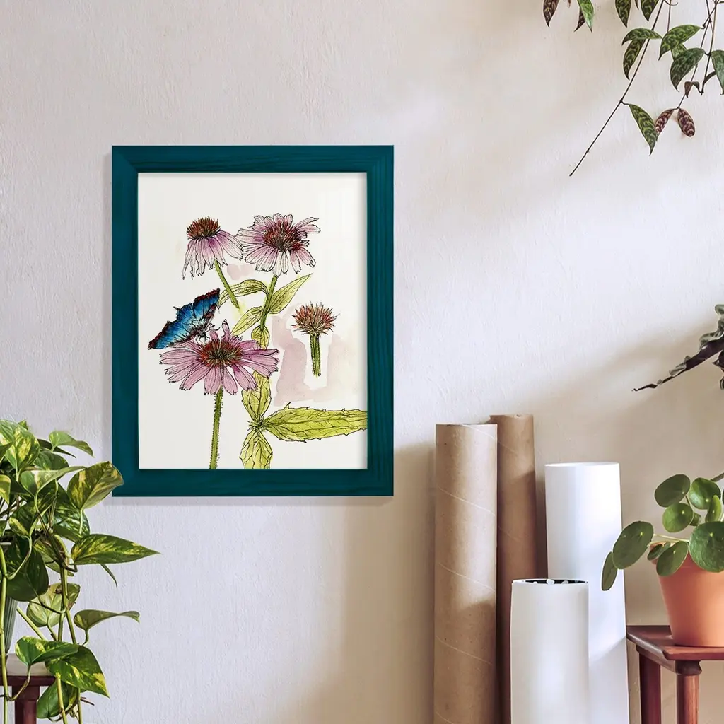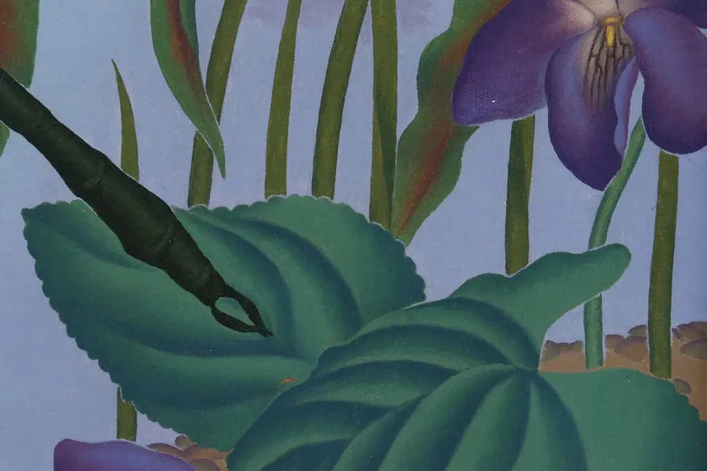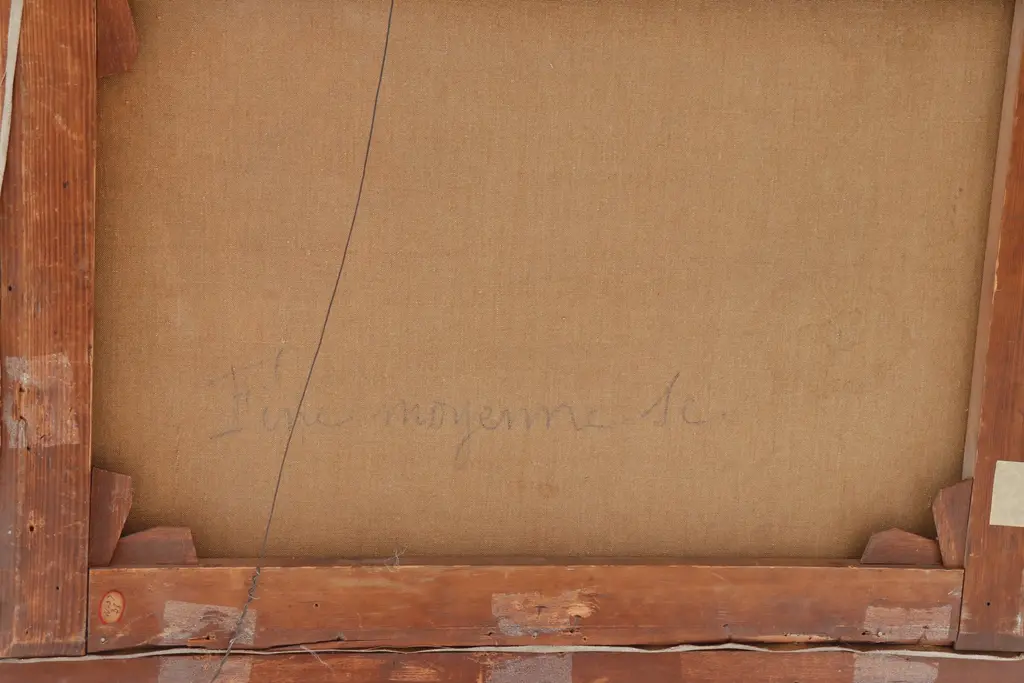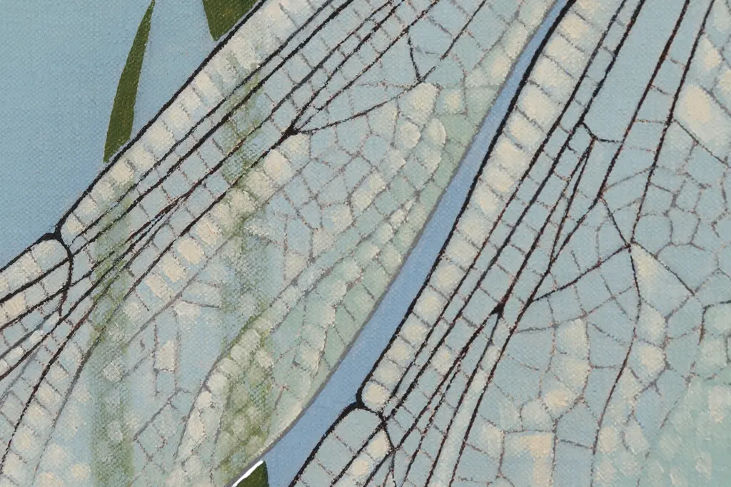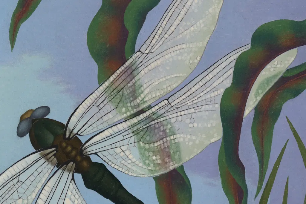 A serene oil on canvas signed at the center top ��Charlotte Malsbary’, and dated 1934. The scene depicts a dragonfly with delicate wings, set against a pebbled shore with blooming purple irises. The water reflects soft clouds in an evening sky. Set in a coral-colored frame. In the back to the right is a label that reads “ 9. Dragon Fly by Malsbary, Charlotte Studio Guild 750 5 Ave NYC”, to the left in pencil reads “Fine Moyenne”.