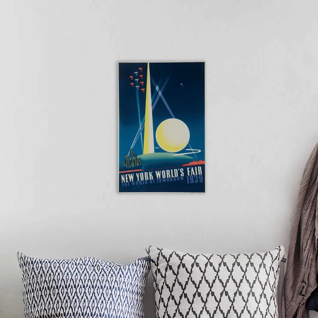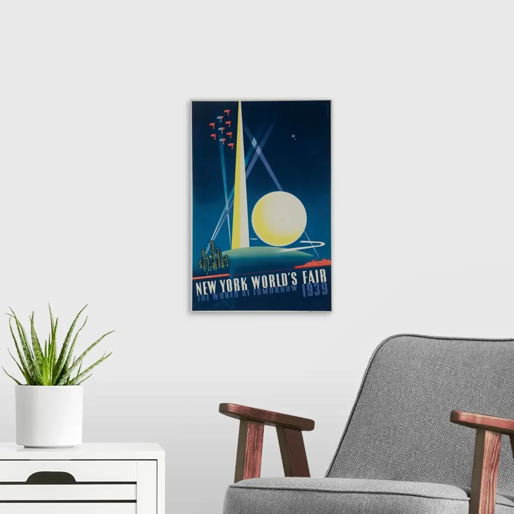1939 New York World's Fair poster showing spotlit Trylon and Perisphere with air show and city skyscrapers. illustrated by Joseph Binder.