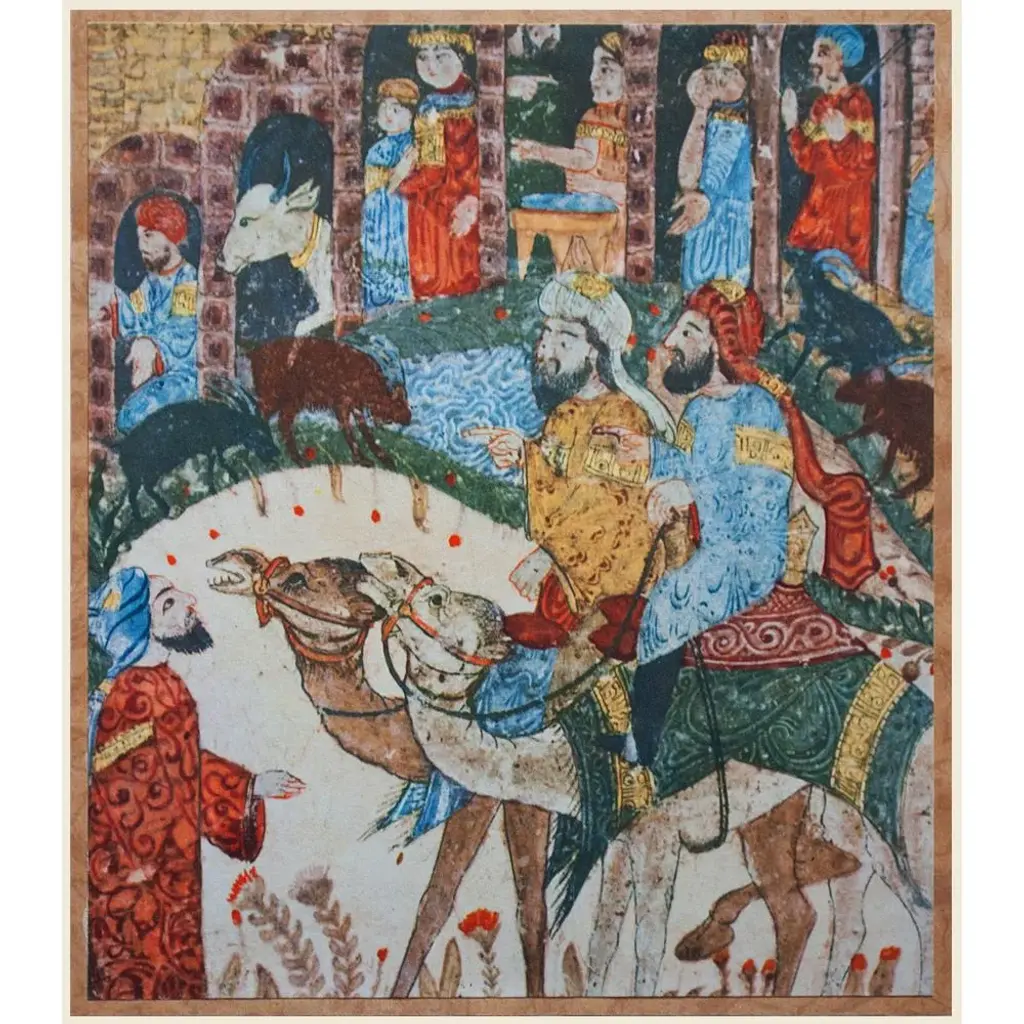 An excellent vintage First Edition offset lithograph, print, of Persian painting "Abu Zayad and Al-Haris Questioning a Villager", as a fragment, from a rare First Limited Edition art folio published in Switzerland in 1940. Printed on one side of heavy paper. Mounted on a large sheet of vintage paper. Detailed. Excellent condition - minor age wear on the board, never framed. This 78 years old print in full color. Overall 11"W x 15"H Image 7.05"W x 8.15"H The original artwork comes from a manuscript of the MAQAMAT (Assemblies) of Hariri copied and illustrated by Yahya b. Mahmud b. Yahya b. Abi' l-Hasan b Kuwwariha al-Wasiti (of Wasit in Mesopotamia) in 634 H. (A.D. 1237). Abu Zayd, the hero of the book and al-Haris the narrator, are seen mounted on camels in the forebackground. Behind them (i.e. at the top of the piece) is a village in which various shops can be seen while a mosque with minaret rises behind. On the right is a goatherd spinning beside the goats. In the centre is a pool, represented by the swirling convention usually employed for water at this period. The ninety-nine miniatures contained in this manuscript are finest work of the Mesopotamian or Baghdad school of the 13th century.