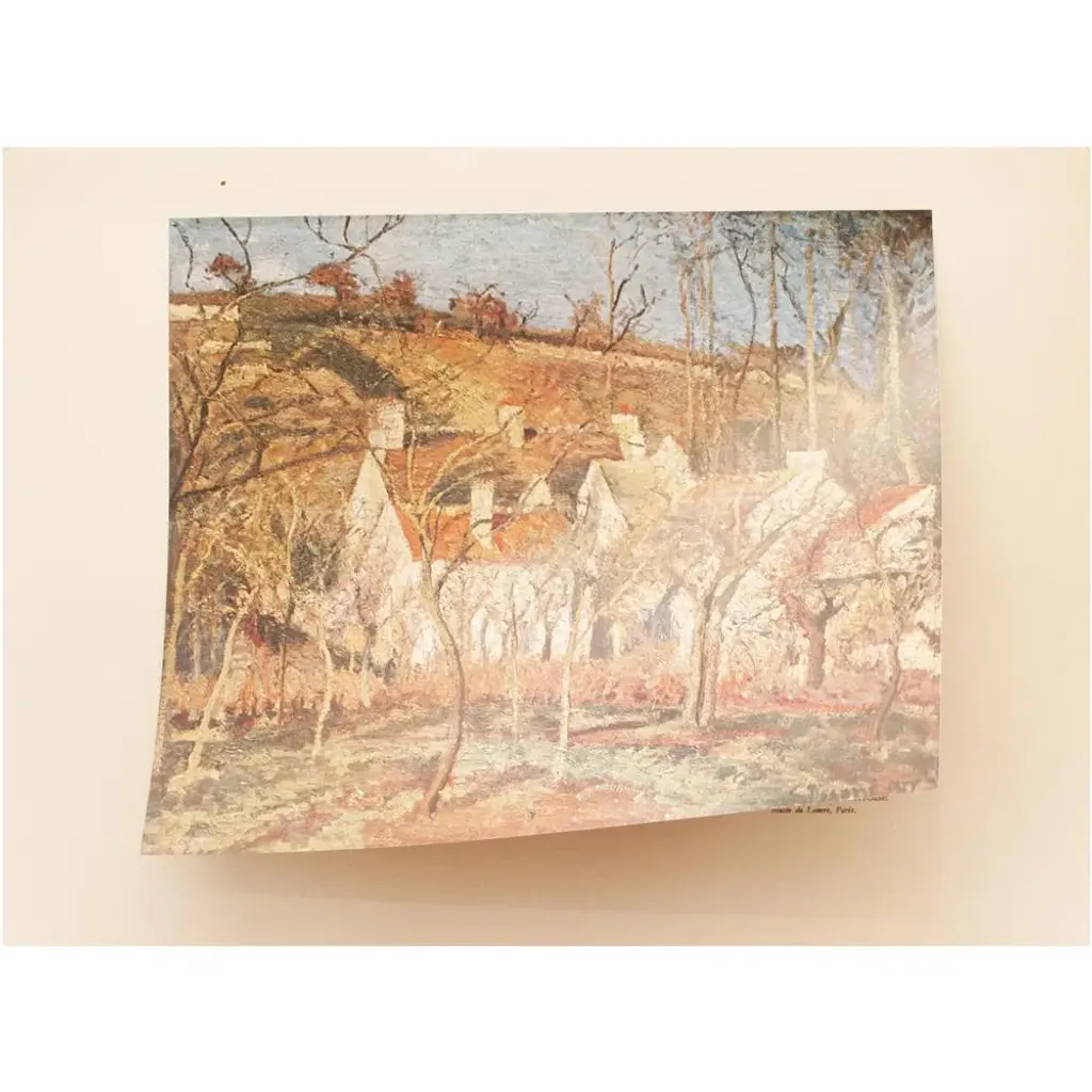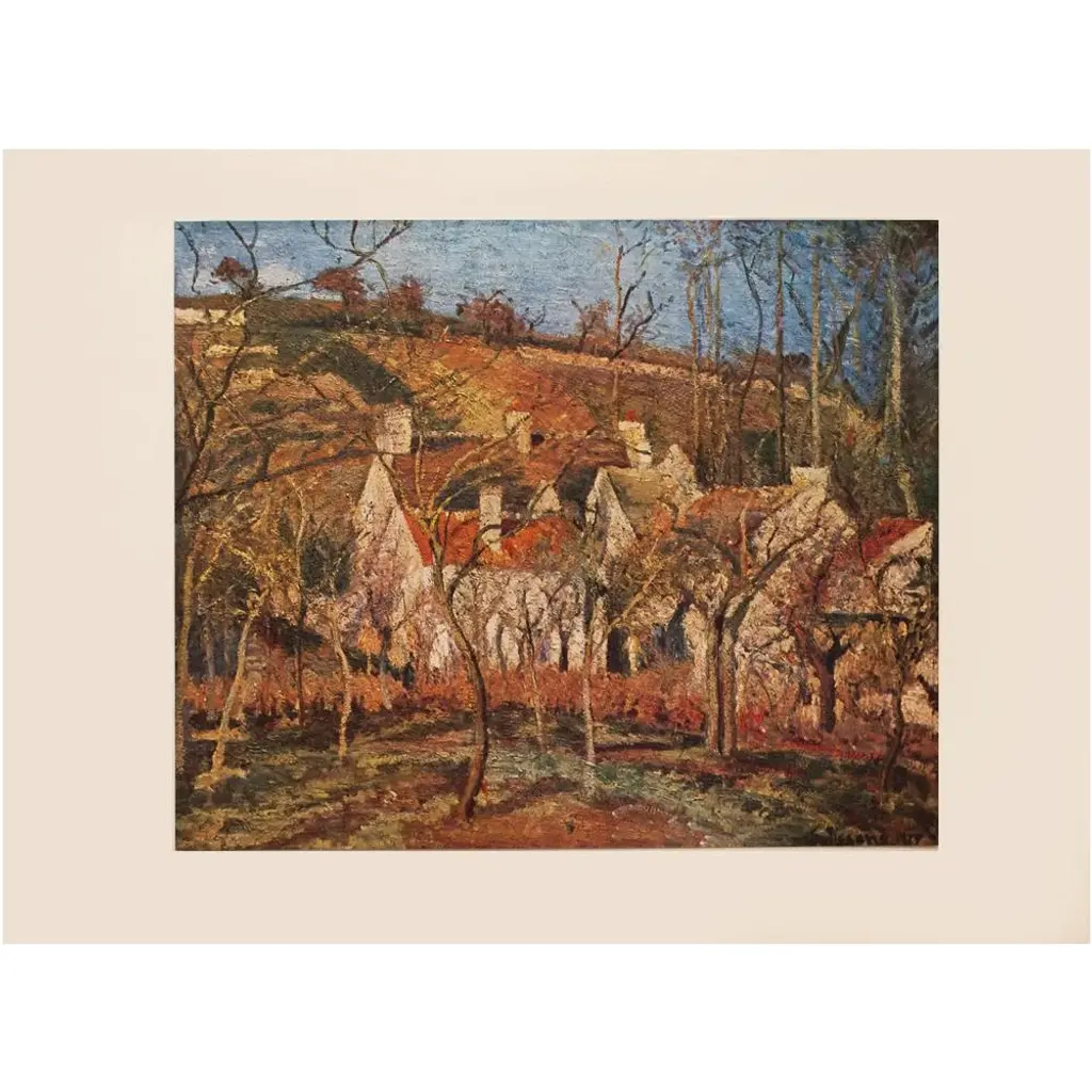 An excellent First Edition full-color print after painting Les Toits Rouges A Pontoise (The Red Roofs in Pontoise) by French painter Camille Pissarro (1830-1903). Comes from a rare First Limited Edition art folio published by Albert Skira in Paris, France, in the 1940s. Signed in the print at the lower right corner: "C. Pissarro 1877". Printed on one side. Hand tipped-in on a board of heavy paper. Information regarding the original artwork will be found by lifting the piece. Excellent condition - minor edge wear on the board, never framed. Overall 15"W x 11"H Image 10.45"W x 8.55"H