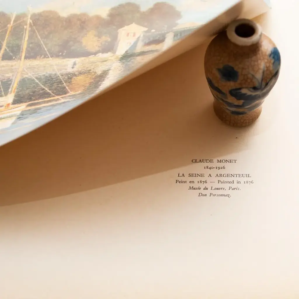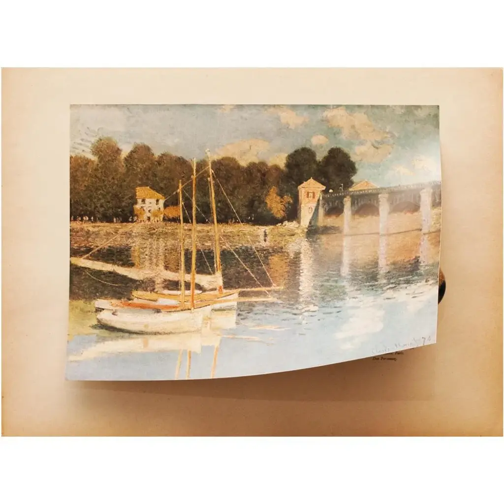 Rare First Edition full-color print of painting "La Seine À Argenteuil" (The Seine at Argenteuil) by French painter Claude Monet (1840-1926). Comes from a rare First Limited Edition art folio published by Albert Skira in France in the 1940s. Signed in the print at the lower right corner: "Claude Monet 71". Printed on one side. Hand tipped-in on a board of heavy paper. Information regarding the original artwork will be found by lifting the plate. High-end quality. Excellent condition - minor edge wear on the board, never framed. Overall 15"W x 11"H Image 10.76"W x 8"H