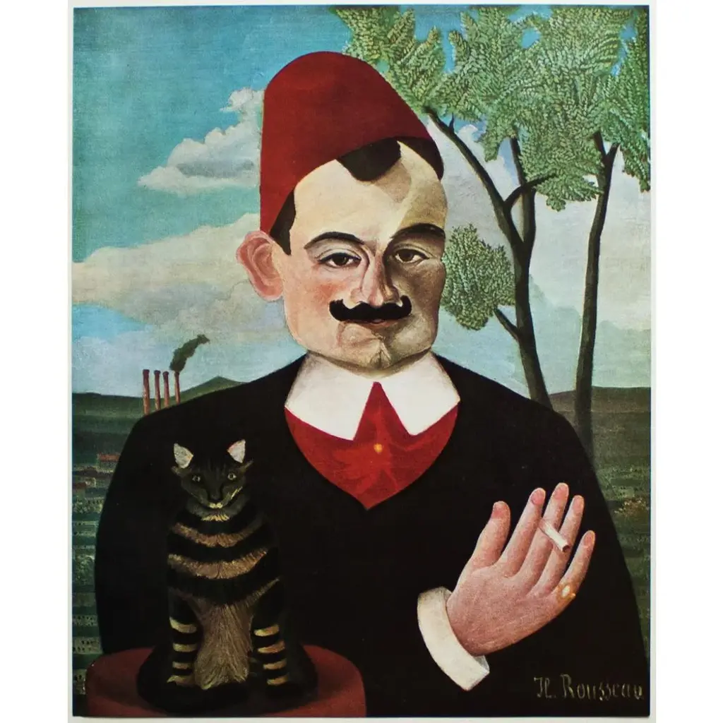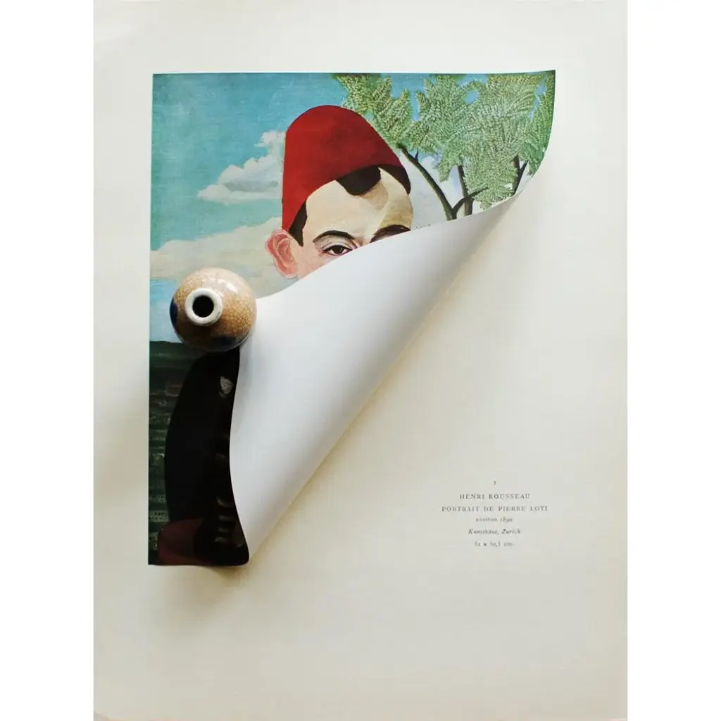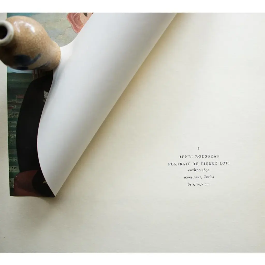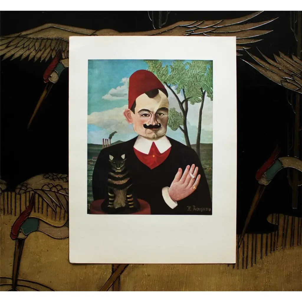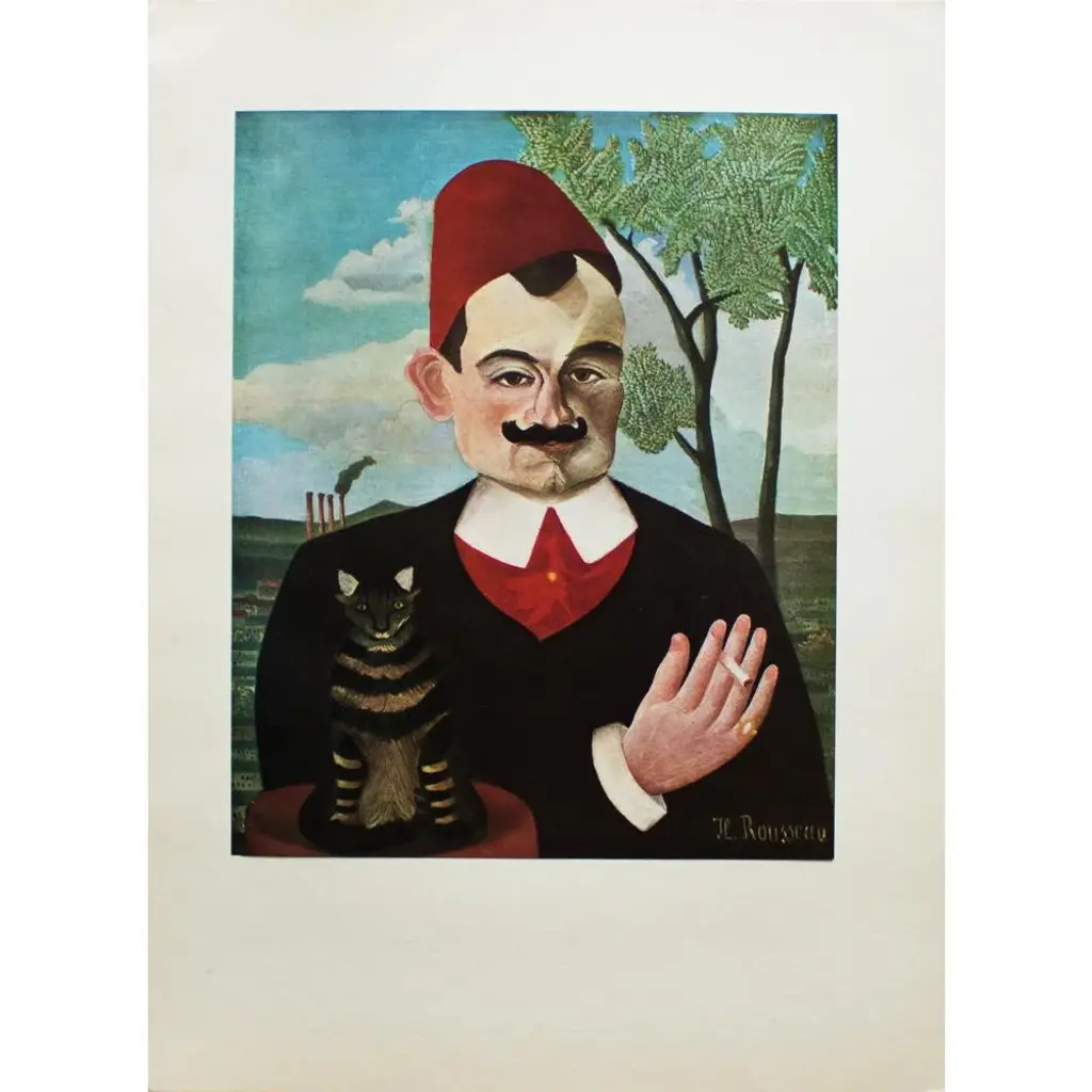 A lovely vintage First Edition full-color print of "Portrait de Pierre Loti"(1890) by Henri Rousseau. Signed in the print at the lower right corner: "Henri Rousseau". Printed on one side. Hand tipped-in on a board of heavy paper. Numbered. Information regarding the original painting will be found by lifting the piece. Comes from a rare art folio published by Albert Skira, in Geneva, Switzerland, in 1940s. First Limited Edition. Excellent condition - minor age wear on the the board, never framed. Overall 11"W x 15"H Image 8.25"W x 10.20"H
