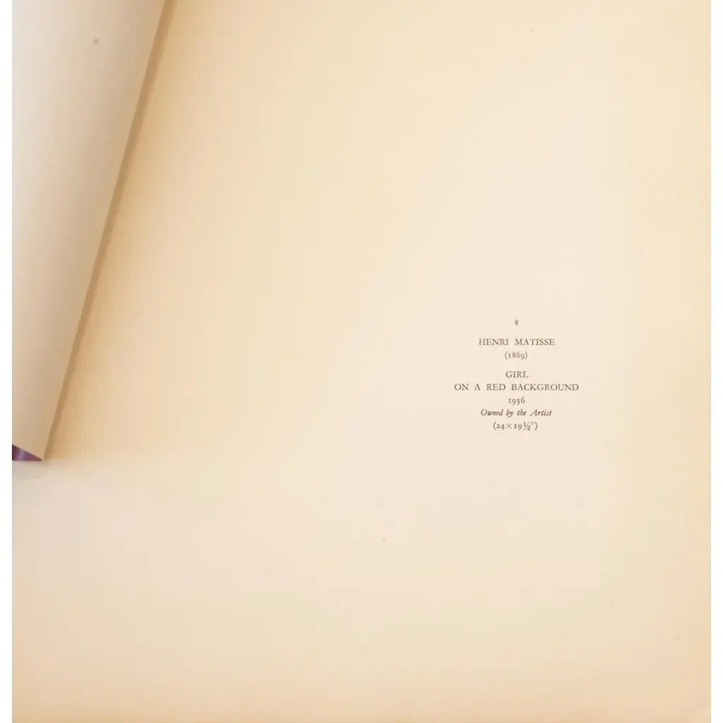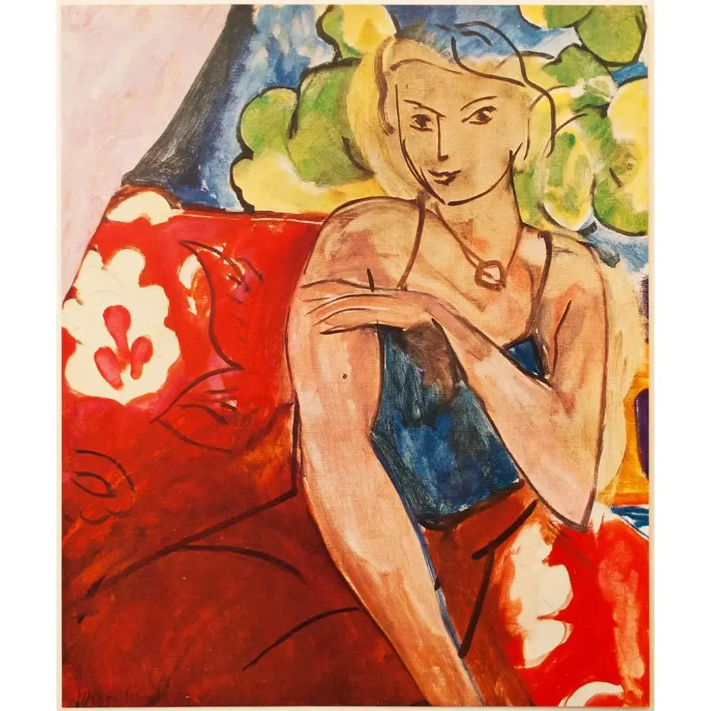 A stunning First Edition period offset lithograph, print, after painting "Girl on a Red Background" (1936) by Henri Matisse. Comes from a rare limited edition art folio printed in Geneva, Switzerland in 1940s. Signed in the print (printed) at the lower left corner: Henri Matisse 36. Printed on one side. Hand tipped-in on a board of heavy paper. Information regarding the original artwork is printed under the piece. Excellent condition - minor age wear on the board, never framed. Overall 11"W x 15"H Image 8"W x 9.85"H
