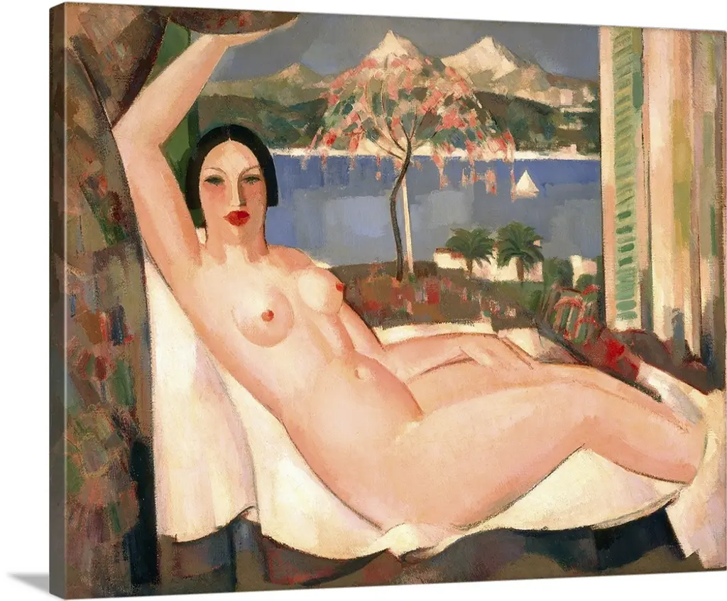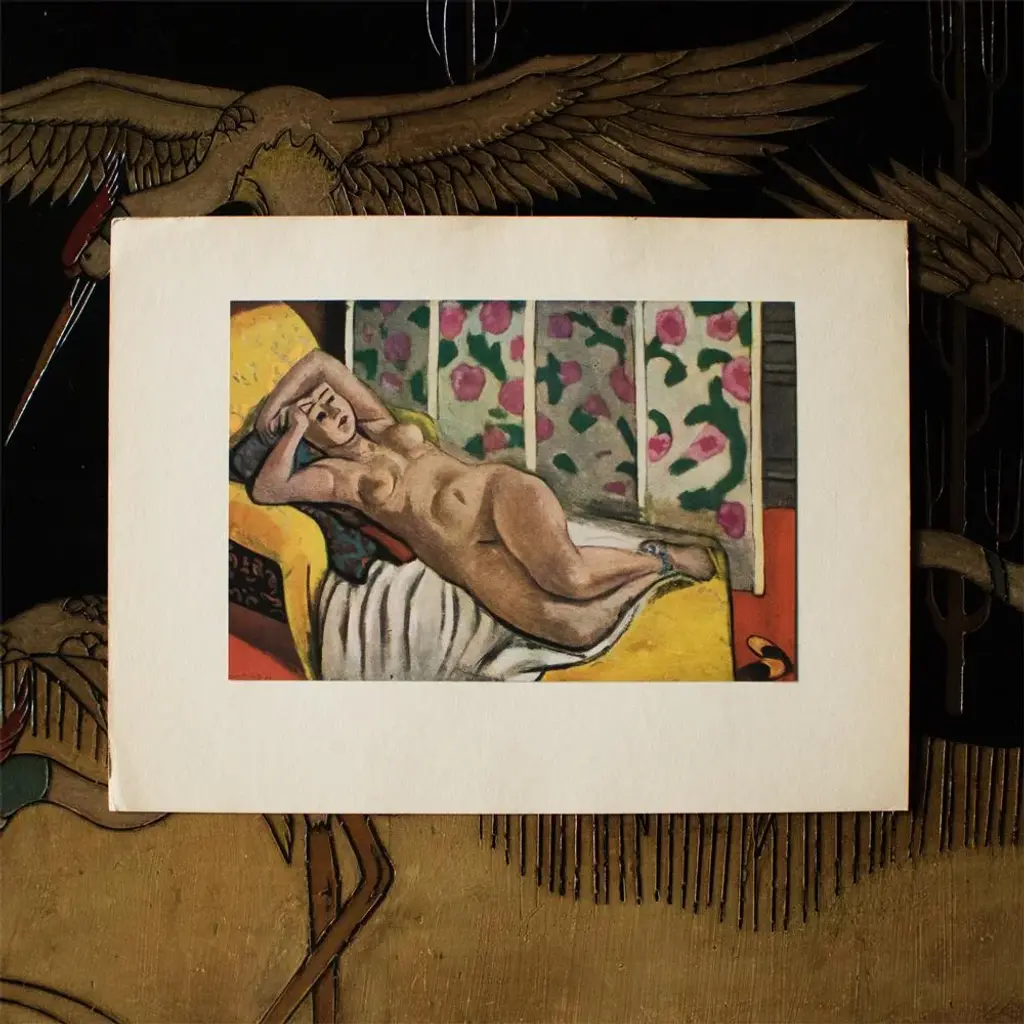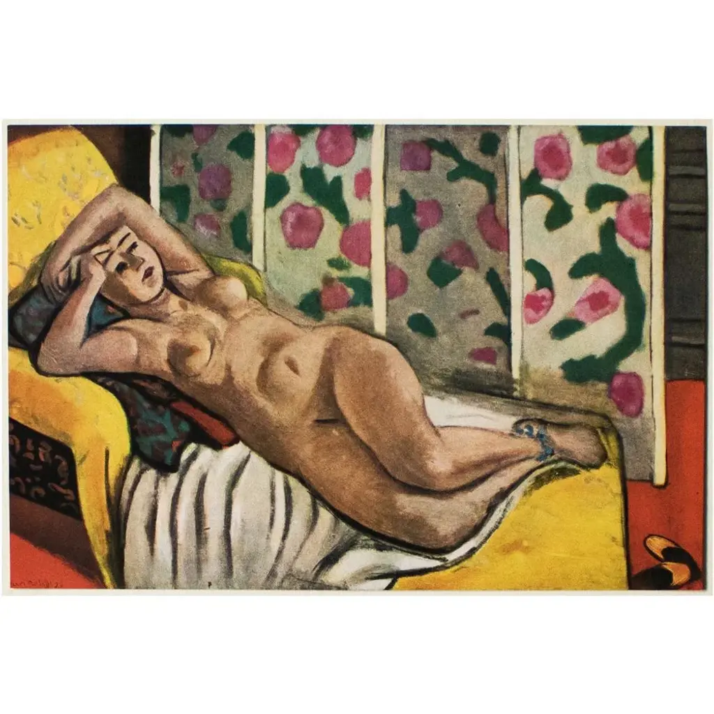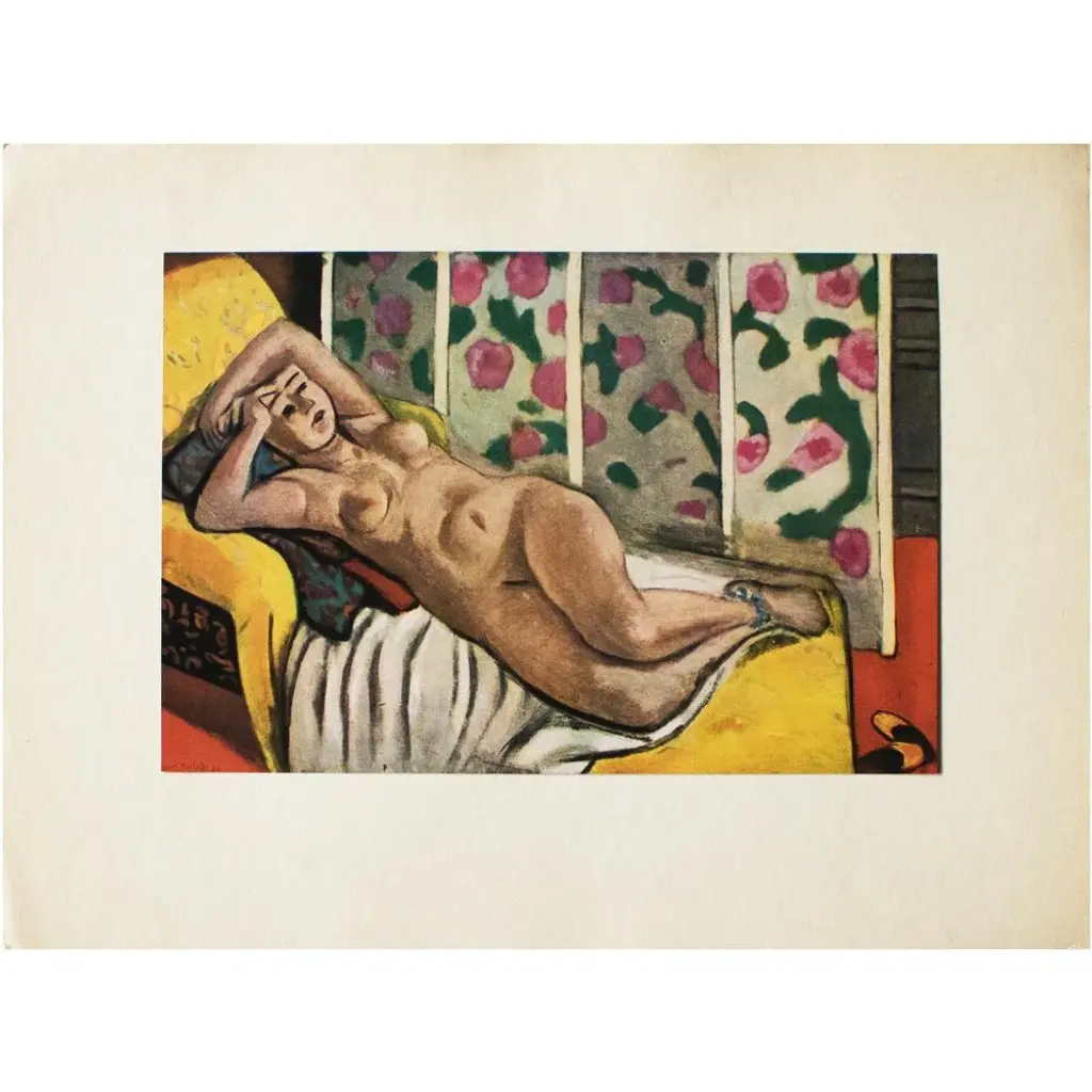 A stunning First Edition period offset lithograph, print, after oil painting "Nu Sur La Chaise Longue Jaune" (Nude on the Yellow Chaise Longue, 1926) by Henri Matisse. Comes from a rare First Limited and Only Edition folio of the artist, published by Albert Skira in Geneva, Switzerland, in the 1940s. Signed in the print (printed) at the lower left corner: Henri Matisse 26. Printed on one side. Hand tipped-in on a board of heavy paper. Information regarding the original artwork will be found by lifting the lithograph. Excellent condition - minor edge wear on the board, never framed. Overall 15"W x 11"H Image 10.5"W x 7"H