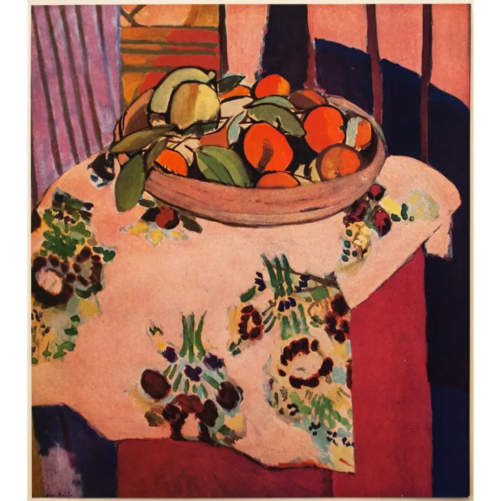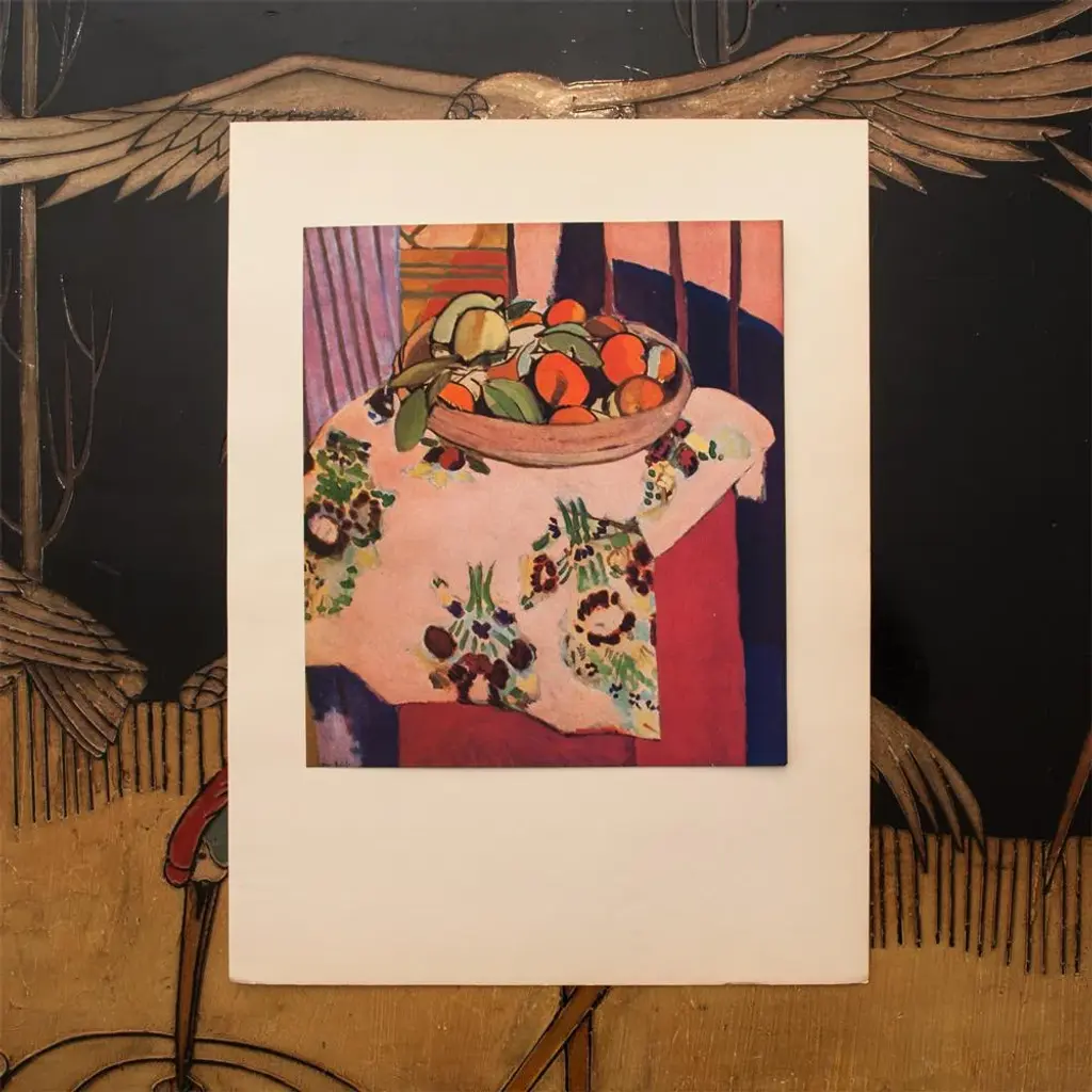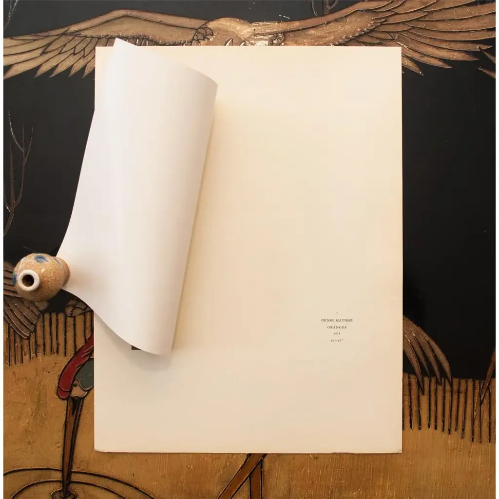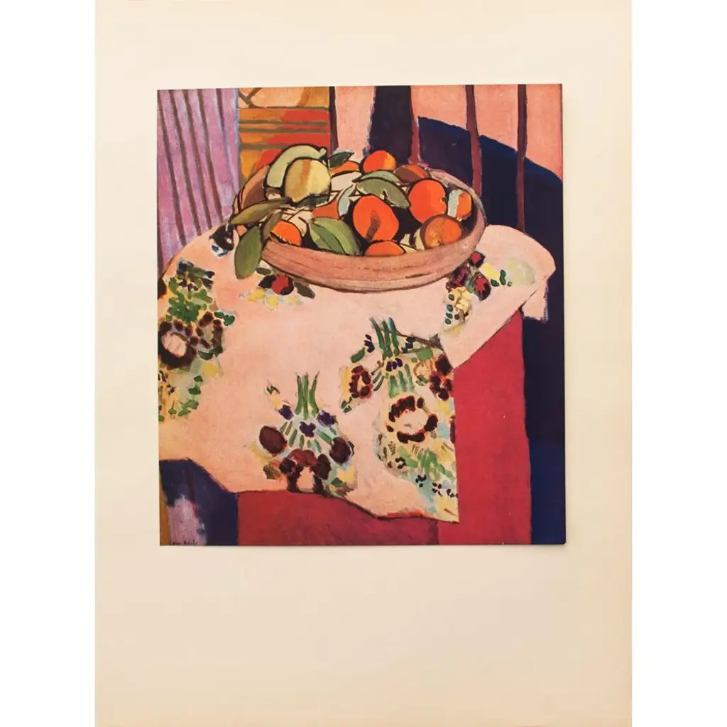 An excellent First Edition period offset lithograph, print, after still life "Oranges" (1912) by Henri Matisse. Comes from a rare First Limited Edition art folio published by Albert Skira in Geneva, Switzerland in the 1940s. Signed in the print (printed) at the lower left corner: Henri Matisse. Printed on one side. Hand tipped-in on a board of heavy paper. Information regarding the original artwork is printed under the piece. Excellent condition - minor edge wear on the board, never framed. Colors are vivid and rich. Overall 11"W x 15"H Image 8.25"W x 9.30"H