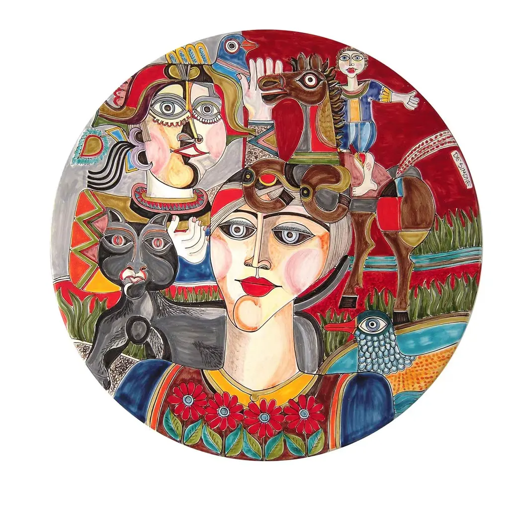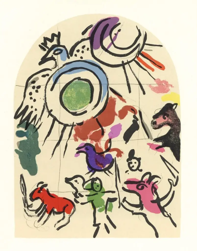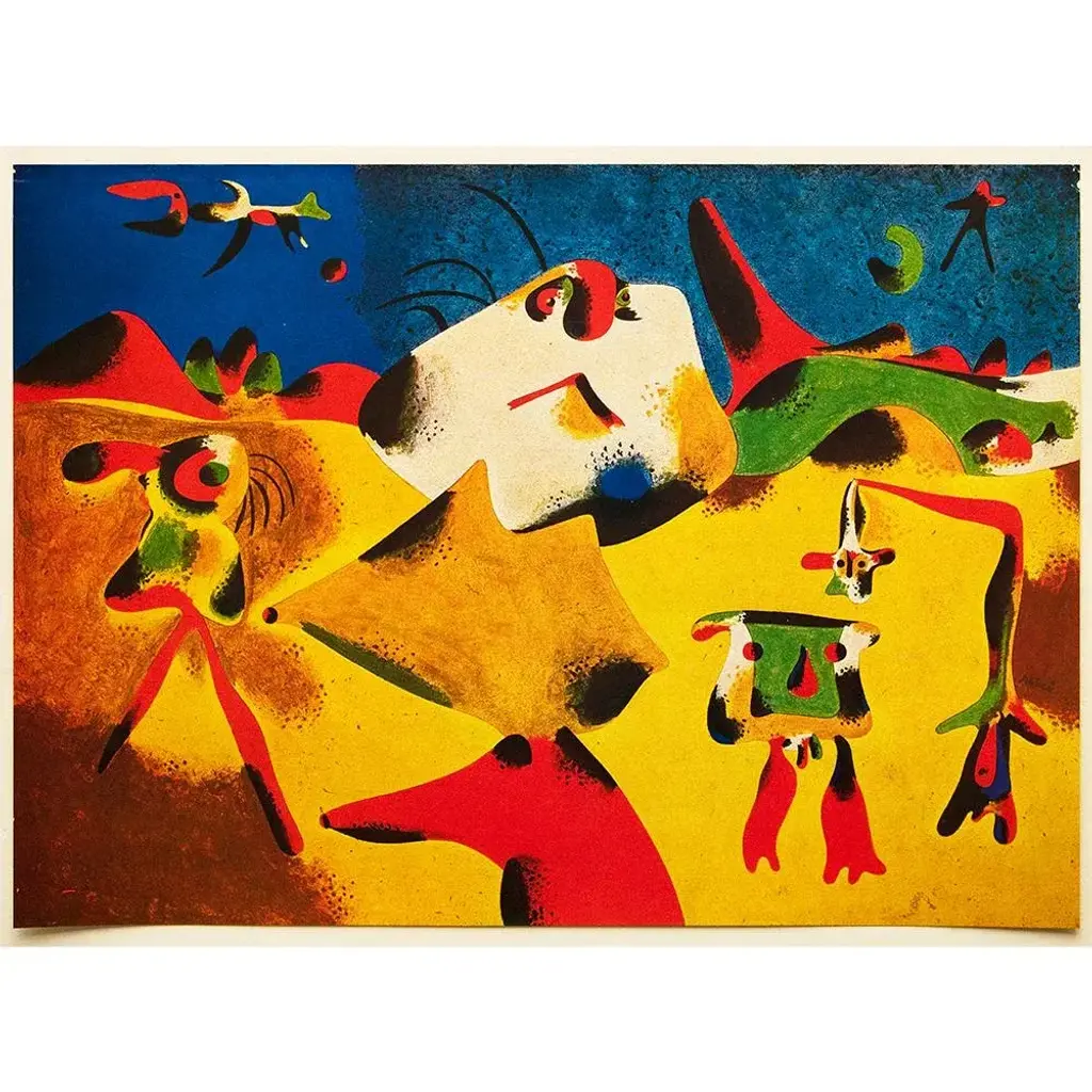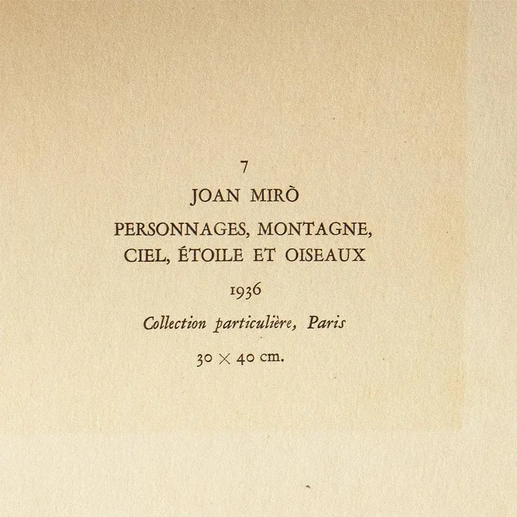 An excellent vintage period offset lithograph, print, of painting "Characters, Mountain, Sky, Star and Birds" (1936) by Joan Miró. Comes from a First limited edition art folio printed in Geneva, Switzerland by Albert Skira in 1940s. Printed on one side. Hand tipped-in on a board of heavy paper. Information regarding the original artwork is printed under the piece. Excellent condition of the print; minor age and edge wear on the board; never framed. Image: 10.60"W x 7.75"H