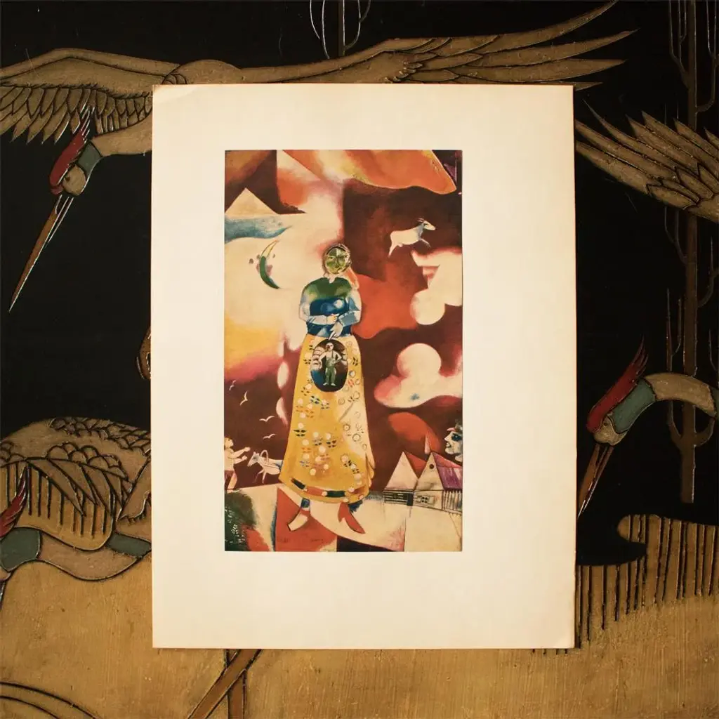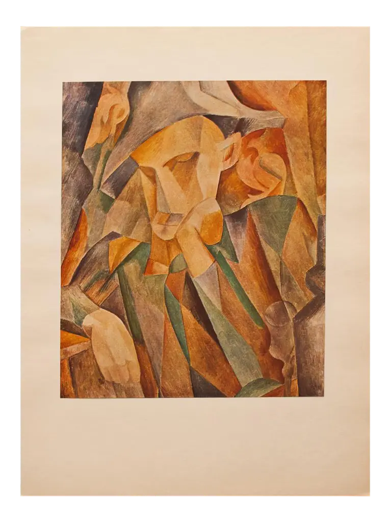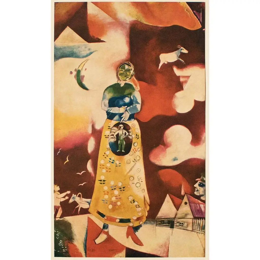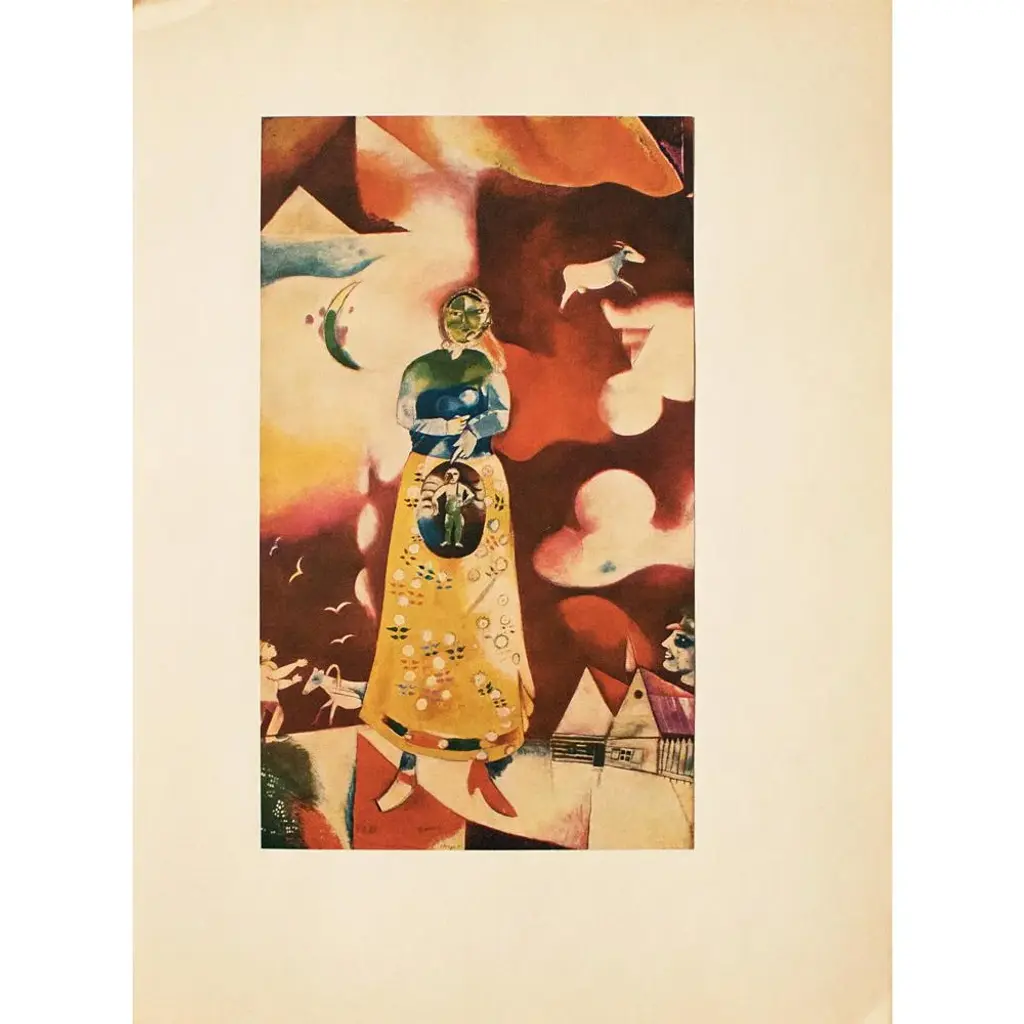 An excellent vintage period offset lithograph, print, after Cubist painting "Maternity" (1913) by Marc Chagall. Comes from a First Limited Edition of portfolio of the artist, created and published by Albert Skira in Geneva, Switzerland in early 1940s. Signed in the print (printed): "Chagall". Printed on one side. Hand tipped-in on a board of heavy paper. Information regarding the original painting can be found by lifting the piece. Numbered on the board: 6. Excellent condition of the print; minor edge wear on the board; never framed. Overall 11"W x 14.80"H Image 6.15"W x 10.60"H