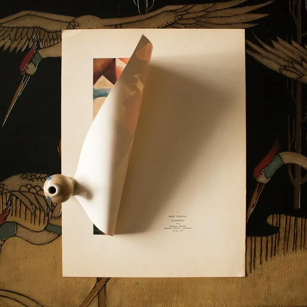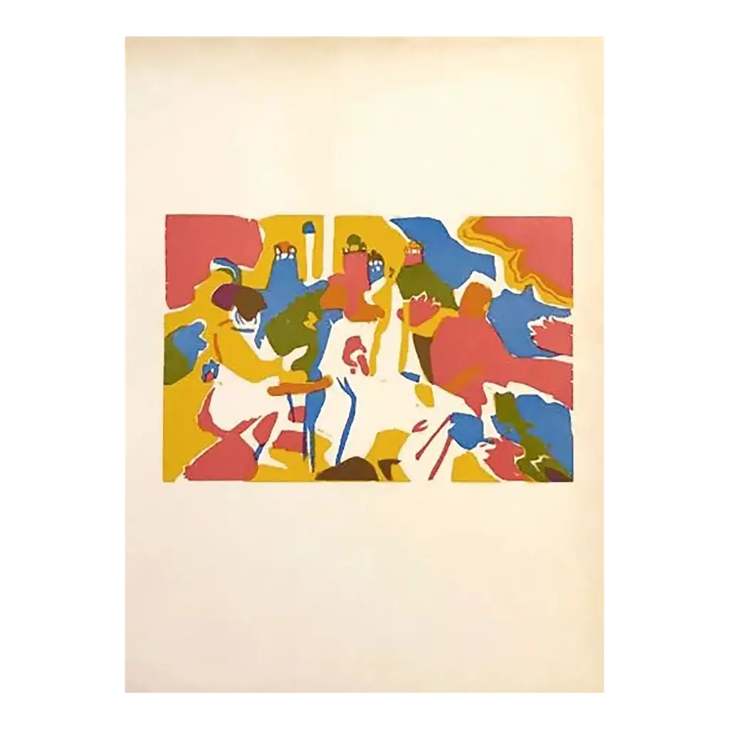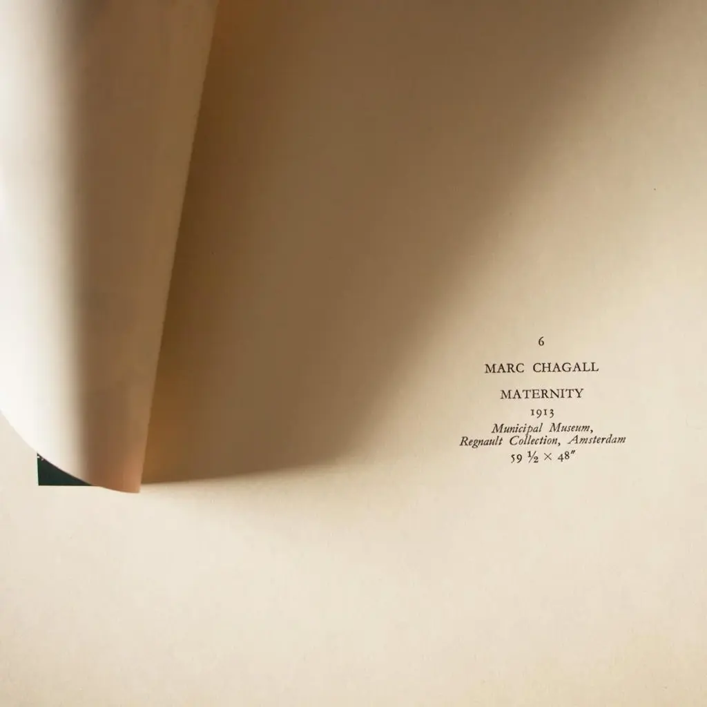 An excellent vintage period offset lithograph, print, after Cubist painting "Maternity" (1913) by Marc Chagall. Comes from a First Limited Edition of portfolio of the artist, created and published by Albert Skira in Geneva, Switzerland in early 1940s. Signed in the print (printed): "Chagall". Printed on one side. Hand tipped-in on a board of heavy paper. Information regarding the original painting can be found by lifting the piece. Numbered on the board: 6. Excellent condition of the print; minor edge wear on the board; never framed. Overall 11"W x 14.80"H Image 6.15"W x 10.60"H