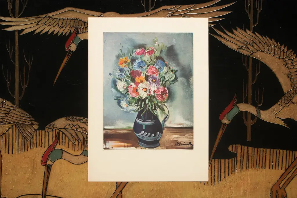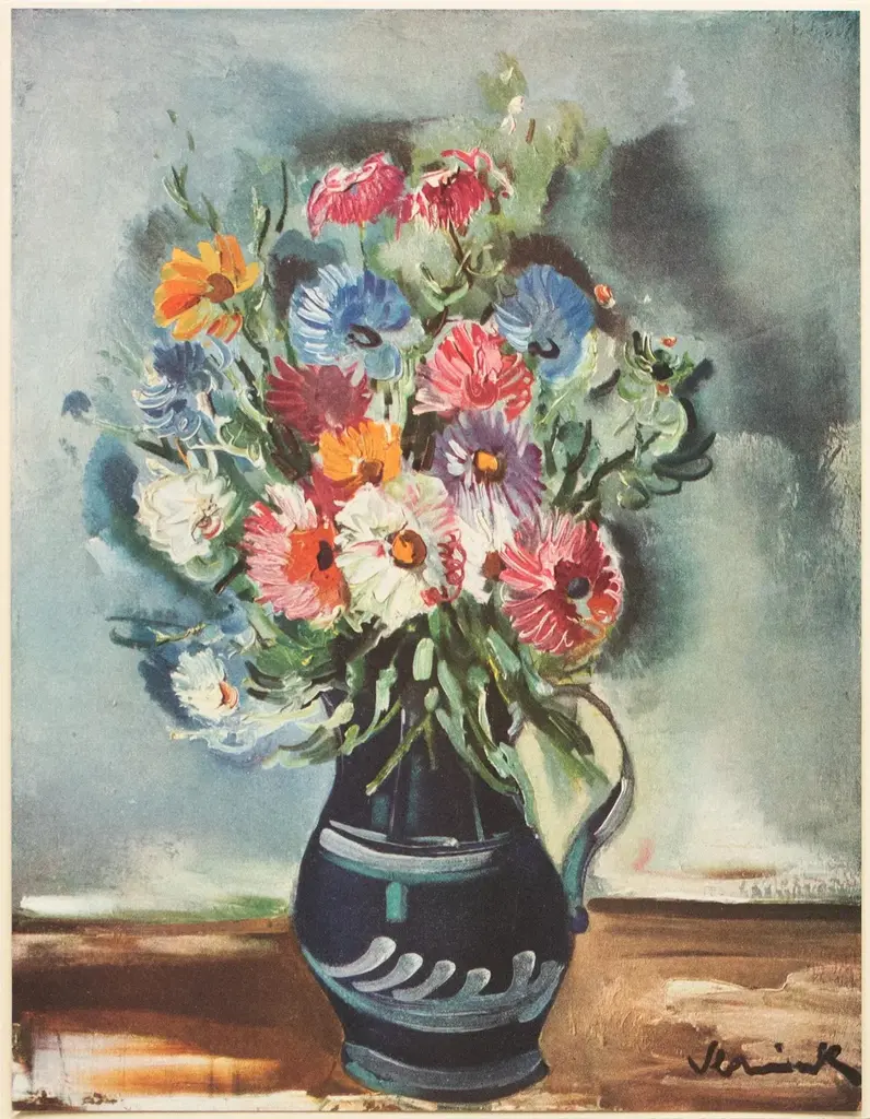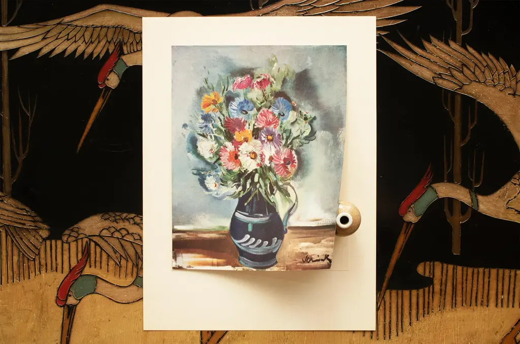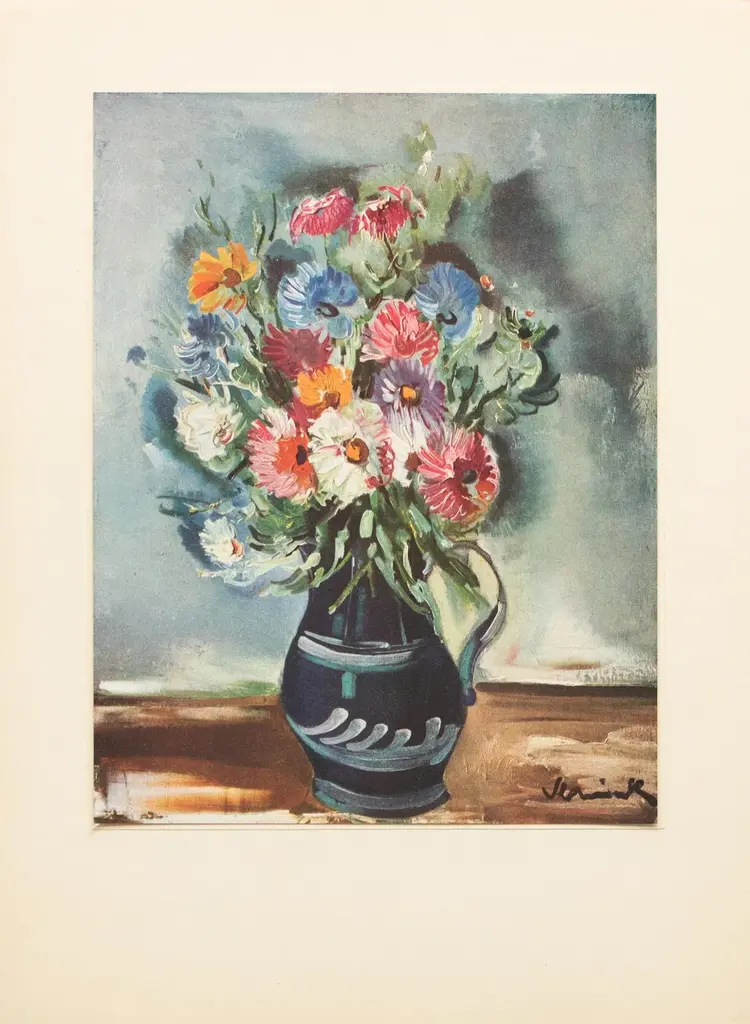 A stunning vintage First Edition period offset lithograph, print, after still life "Flowers" by Maurice Vlaminck (1876-1958). Comes from a First Limited Edition art folio published by Albert Skira in the 1940s, in Switzerland. Printed on one side. Hand tipped-in on a board of heavy paper, then mounted on a large board of vintage heavy paper. Superb quality. Excellent condition - minor edge wear on the board, never framed. Image 8.20"W x 10.55"H