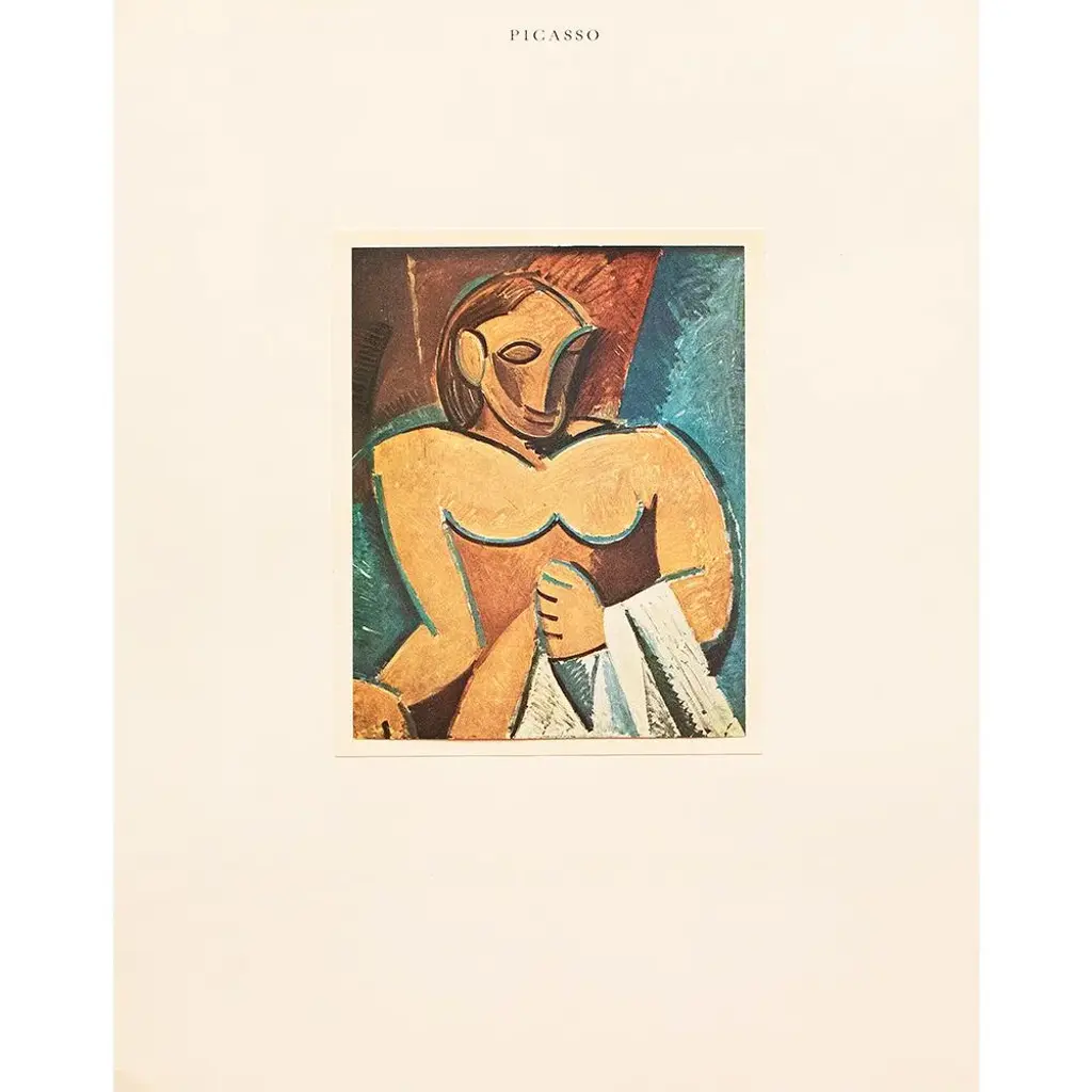 First Edition offset lithograph, full-color print of Cubist painting "Nude With a Towel" (1907) by Pablo Picasso. Comes from a rare First Limited and Only Edition art folio of the artist published by Albert Skira in the 1940s, in Switzerland. Printed on one side. Hand tipped-in on a board of heavy paper. Mounted on a larger board of heavy vintage paper. Information regarding the original artwork will be found by lifting the plate. Detailed. Rich colors. Excellent condition - minor edge wear on the larger board, never framed. Overall 10.75"W x 14.5"H Image 4.9"W x 6.45"H