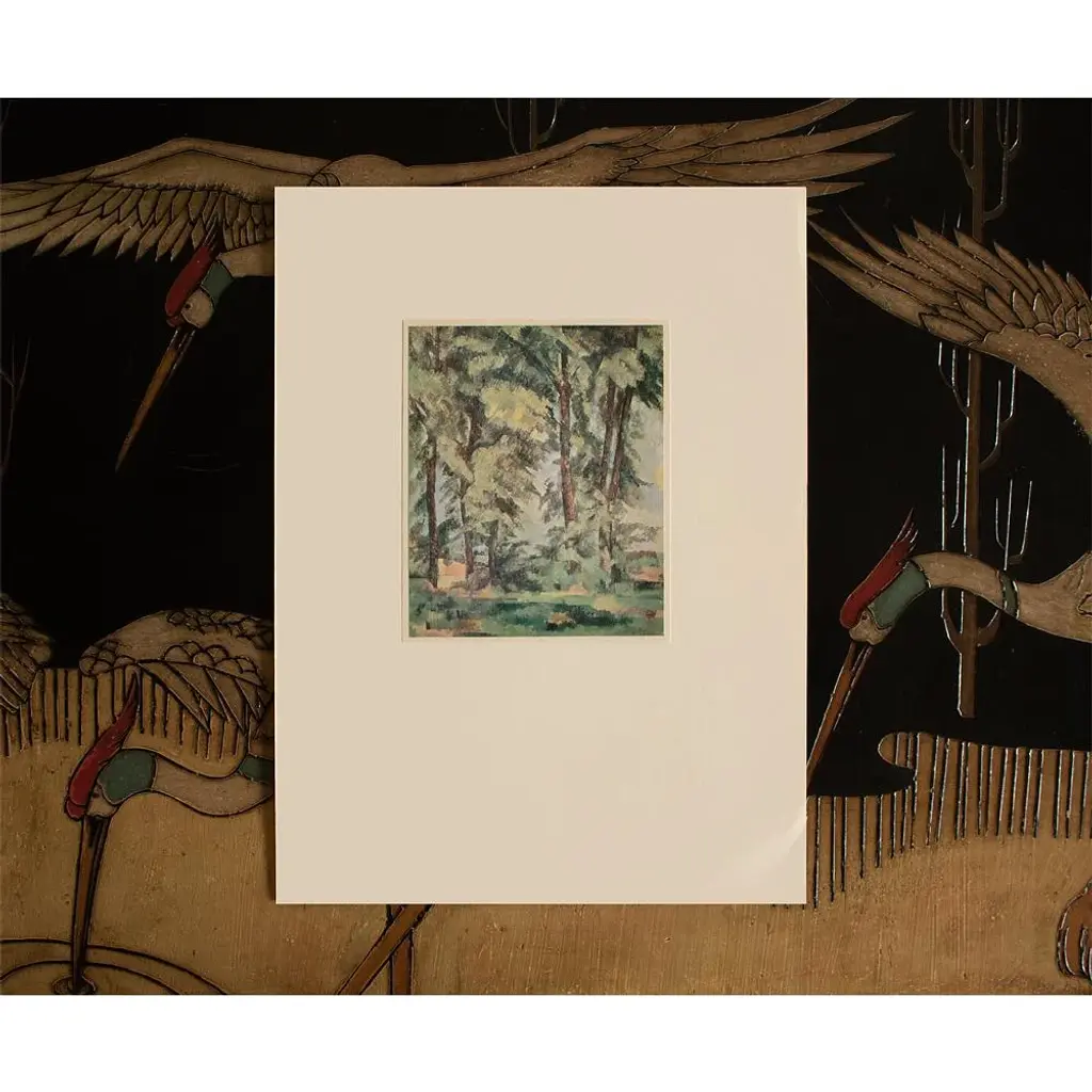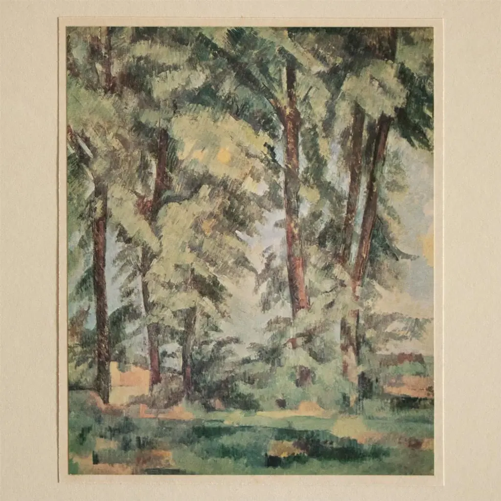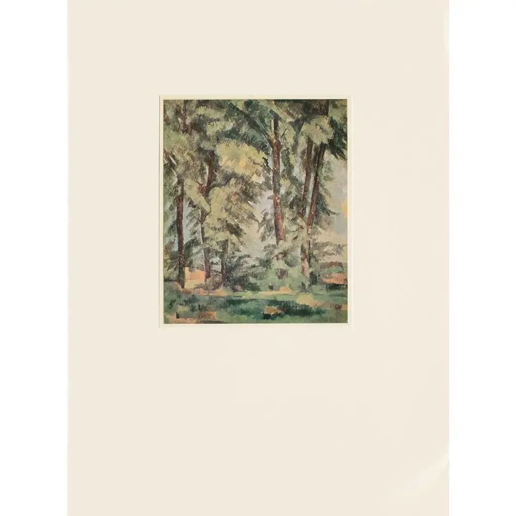 A rare vintage First Edition small offset lithograph after Impressionist oil painting "Big Trees" (1885-1887) by Paul Cezanne. Comes from a rare First Limited Edition art folio published by Albert Skira in Geneva, Switzerland in the 1940s. Printed on one side. Hand tipped-in on a board of heavy paper and mounted on a large board of heavy vintage paper for display and protection. Information regarding the original artwork will be found by lifting the piece. Detailed. Colors a beautiful. Excellent condition - minor edge wear on the large board, never framed. Overall 11"W x 14.95"H Image 5.25"W x 6.45"H