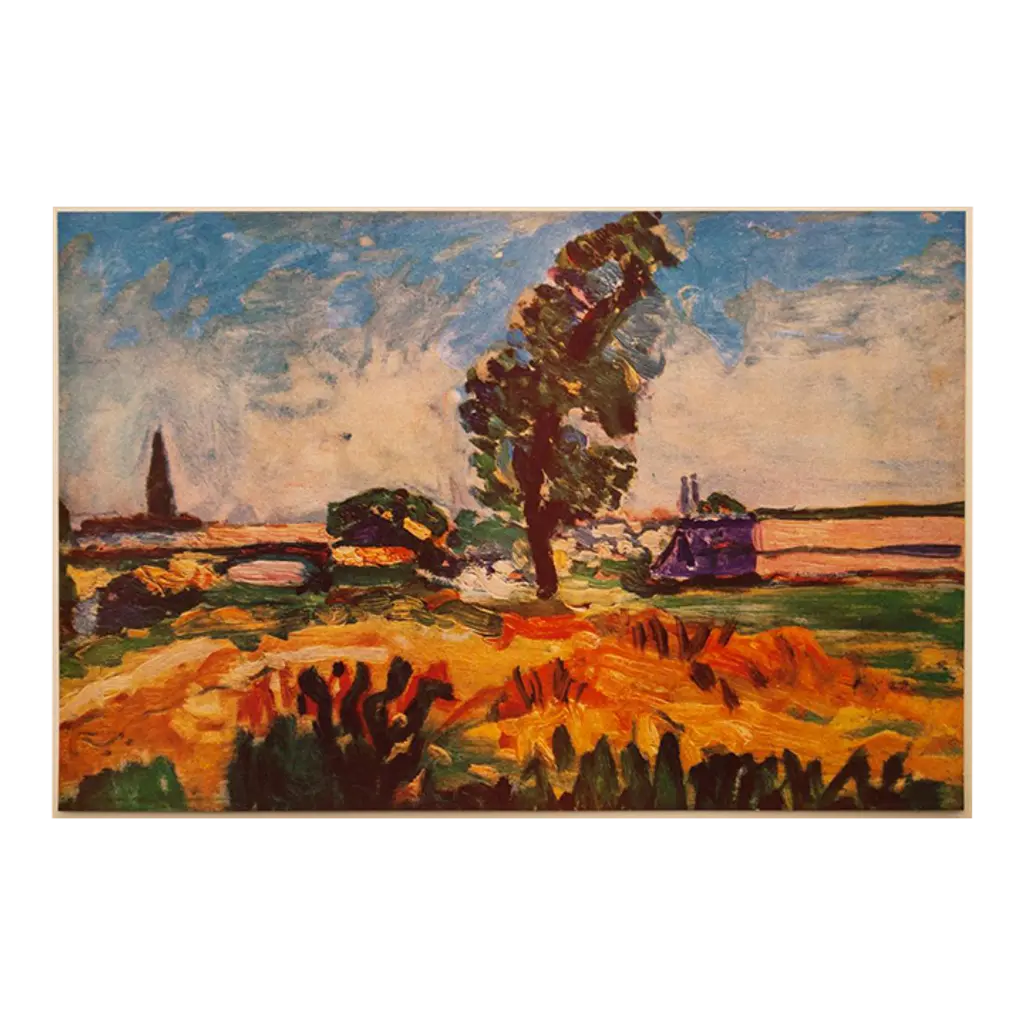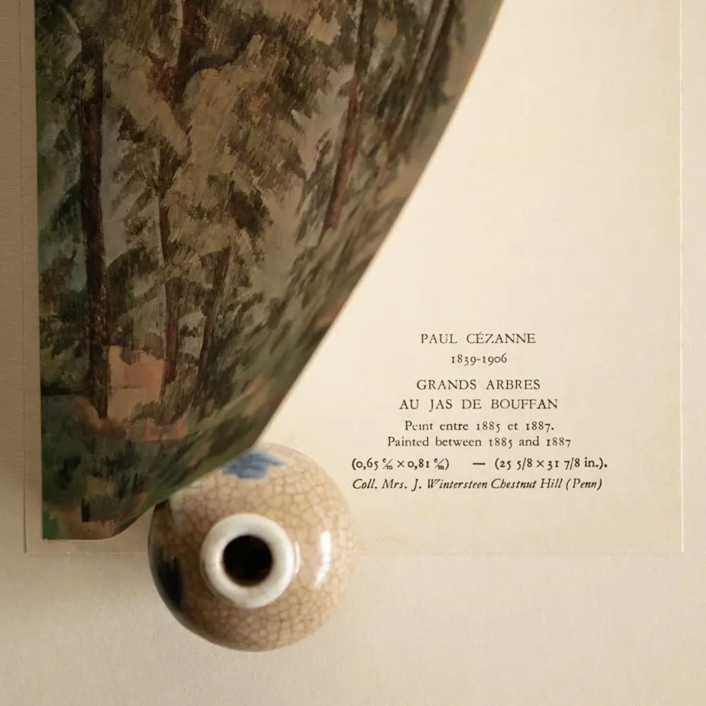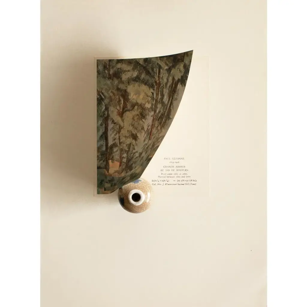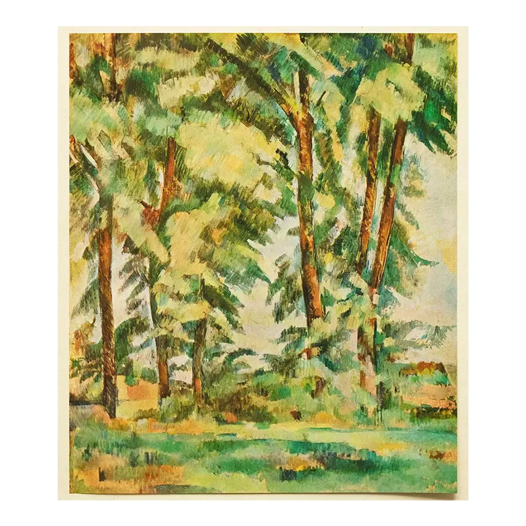 A rare vintage First Edition small offset lithograph after Impressionist oil painting "Big Trees" (1885-1887) by Paul Cezanne. Comes from a rare First Limited Edition art folio published by Albert Skira in Geneva, Switzerland in the 1940s. Printed on one side. Hand tipped-in on a board of heavy paper and mounted on a large board of heavy vintage paper for display and protection. Information regarding the original artwork will be found by lifting the piece. Detailed. Colors a beautiful. Excellent condition - minor edge wear on the large board, never framed. Overall 11"W x 14.95"H Image 5.25"W x 6.45"H