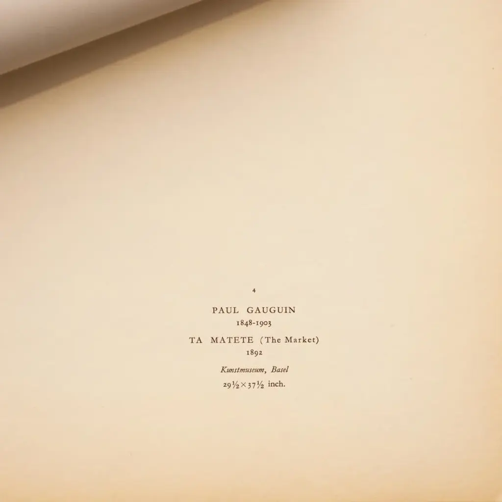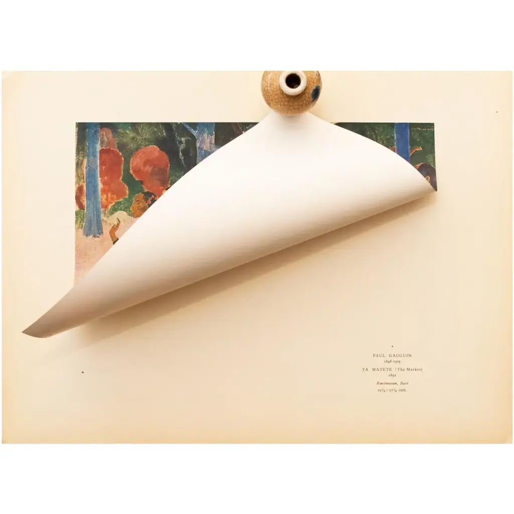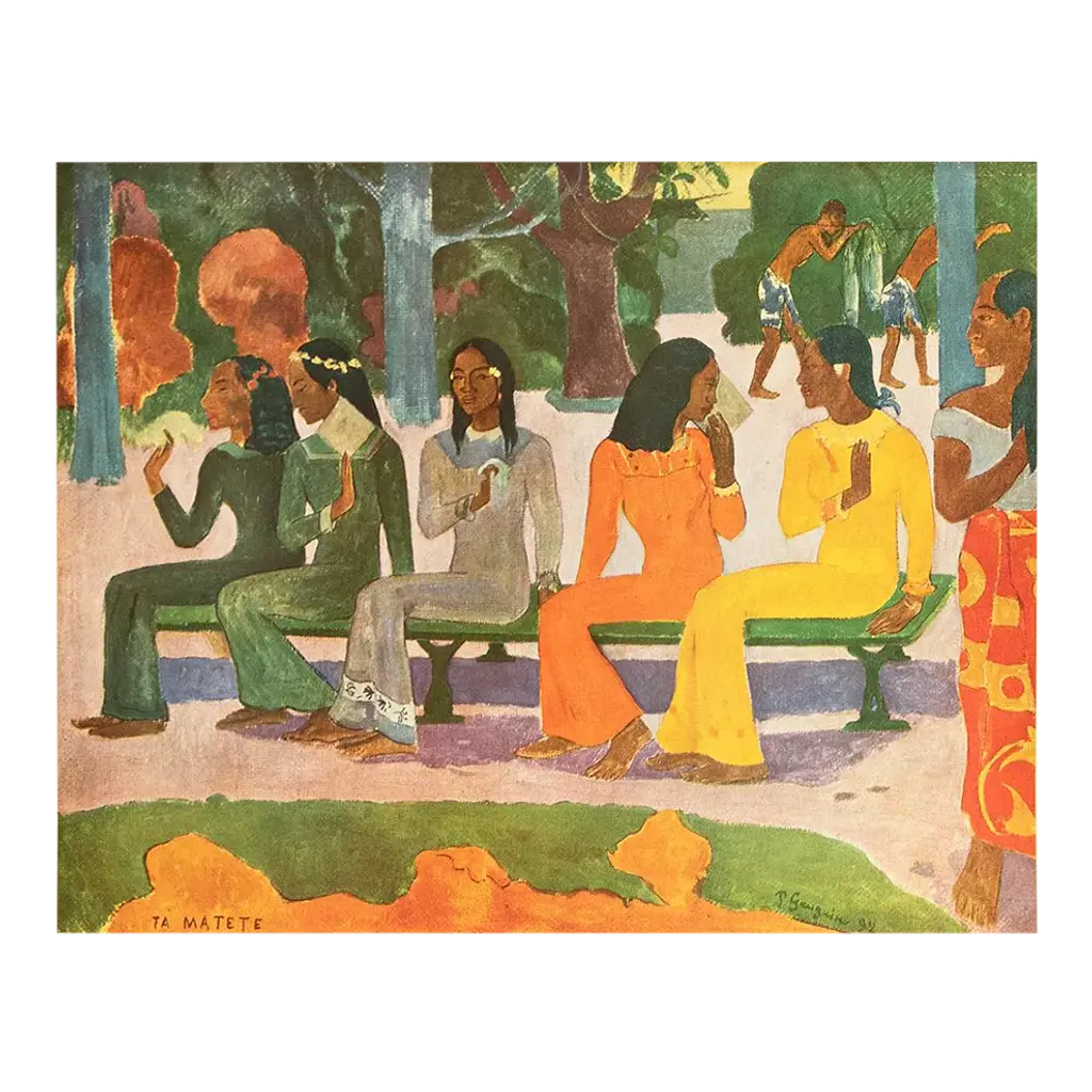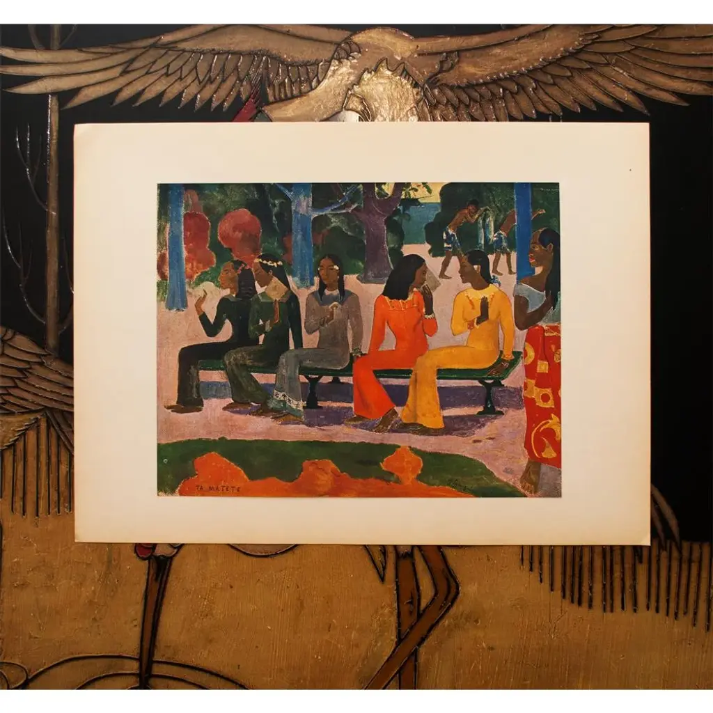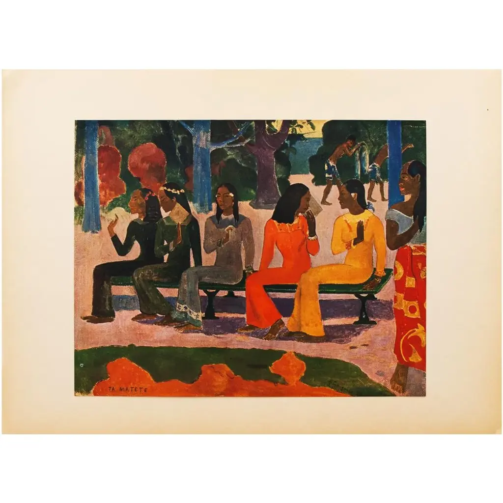 A stunning vintage First Edition full-color print of painting "Ta Matete" (The Market, 1892) by Paul Gauguin. Comes from a rare first limited edition art folio published in 1940s in Switzerland. Signed in the print: "TA MATETE". Printed on one side. Hand tipped-in on a board of heavy paper. Information regarding the original artwork will be found by lifting the piece. High-end quality. Detailed. Colors are brilliant. Excellent condition - minor edge wear on the board, never framed. Image 10.45"W x 8.20"H