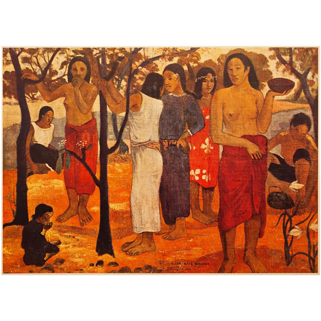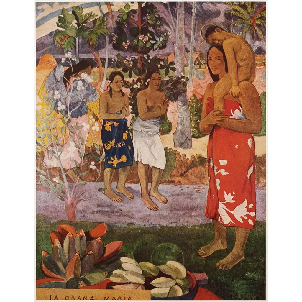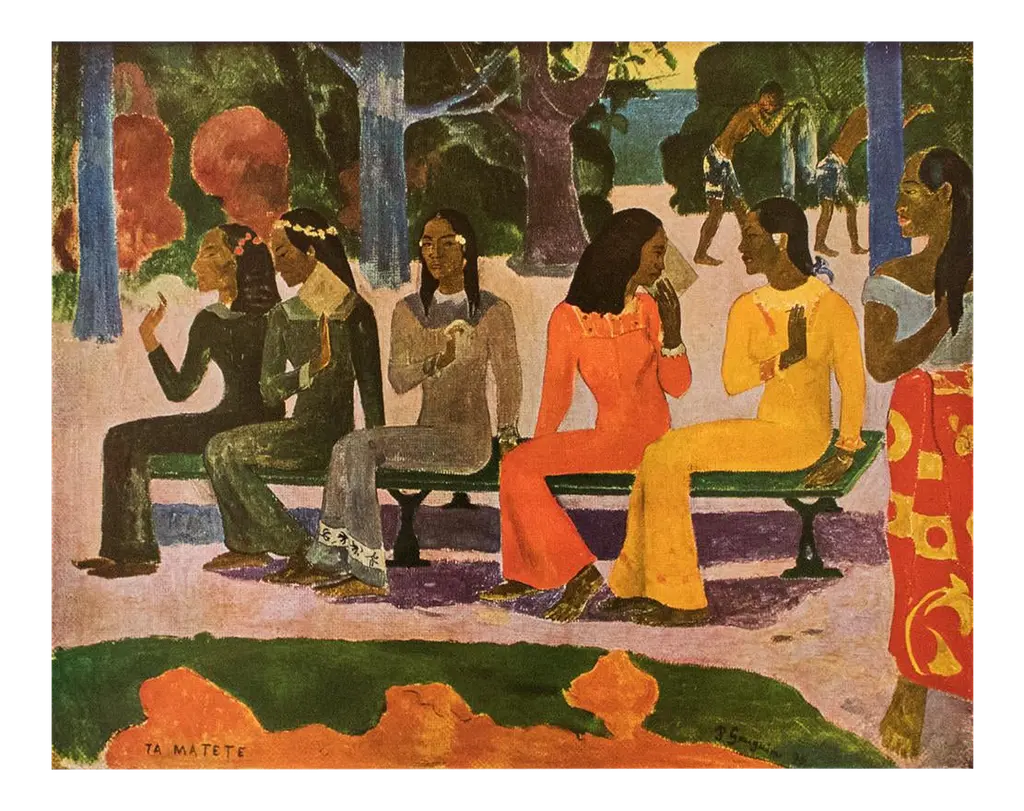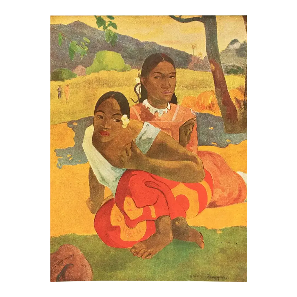 A stunning vintage First Edition full-color print of painting "Ta Matete" (The Market, 1892) by Paul Gauguin. Comes from a rare first limited edition art folio published in 1940s in Switzerland. Signed in the print: "TA MATETE". Printed on one side. Hand tipped-in on a board of heavy paper. Information regarding the original artwork will be found by lifting the piece. High-end quality. Detailed. Colors are brilliant. Excellent condition - minor edge wear on the board, never framed. Image 10.45"W x 8.20"H