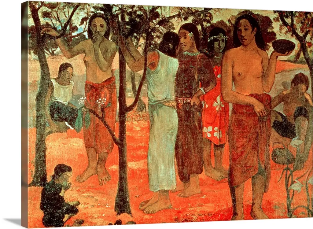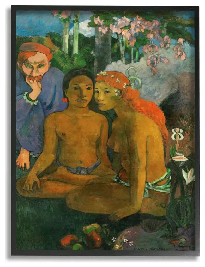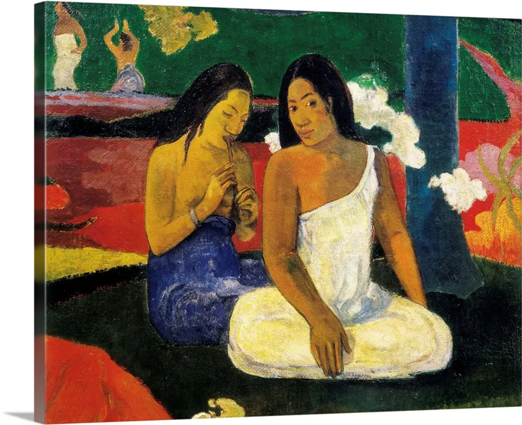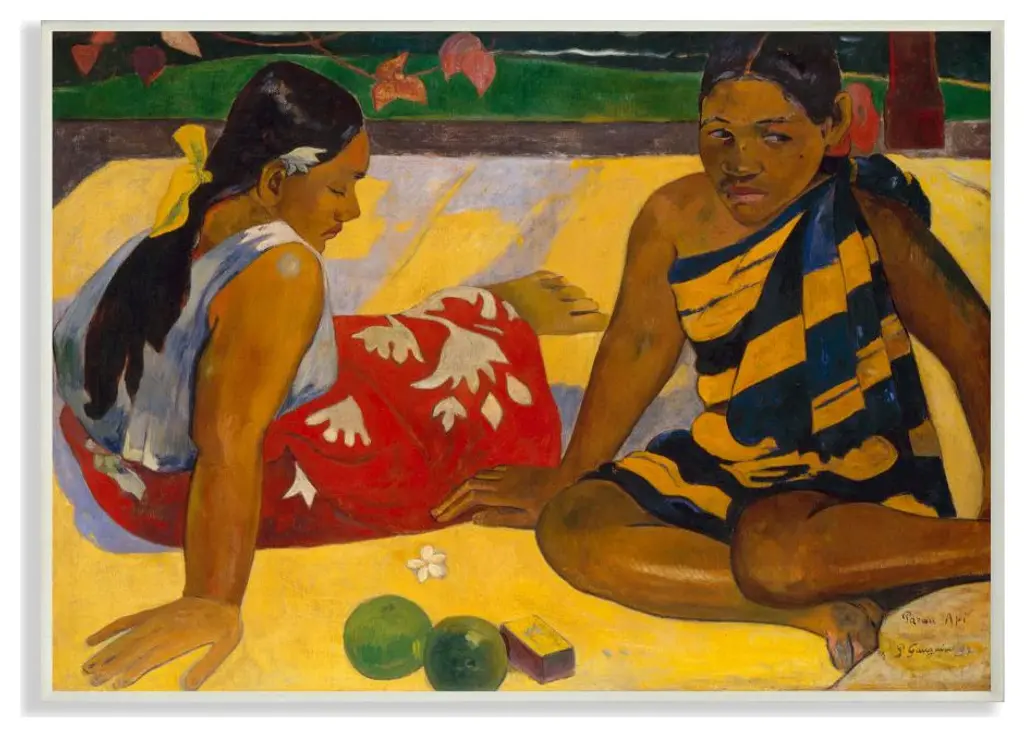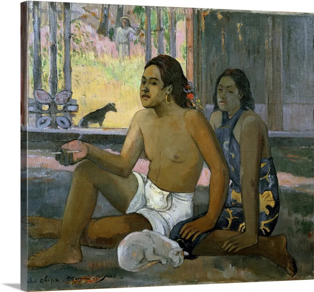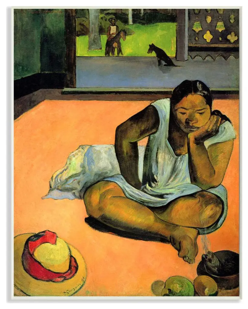 A stunning vintage First Edition full-color print of painting "Ta Matete" (The Market, 1892) by Paul Gauguin. Comes from a rare first limited edition art folio published in 1940s in Switzerland. Signed in the print: "TA MATETE". Printed on one side. Hand tipped-in on a board of heavy paper. Information regarding the original artwork will be found by lifting the piece. High-end quality. Detailed. Colors are brilliant. Excellent condition - minor edge wear on the board, never framed. Image 10.45"W x 8.20"H