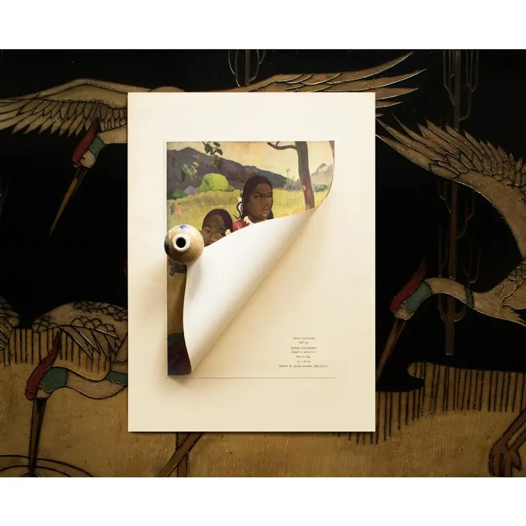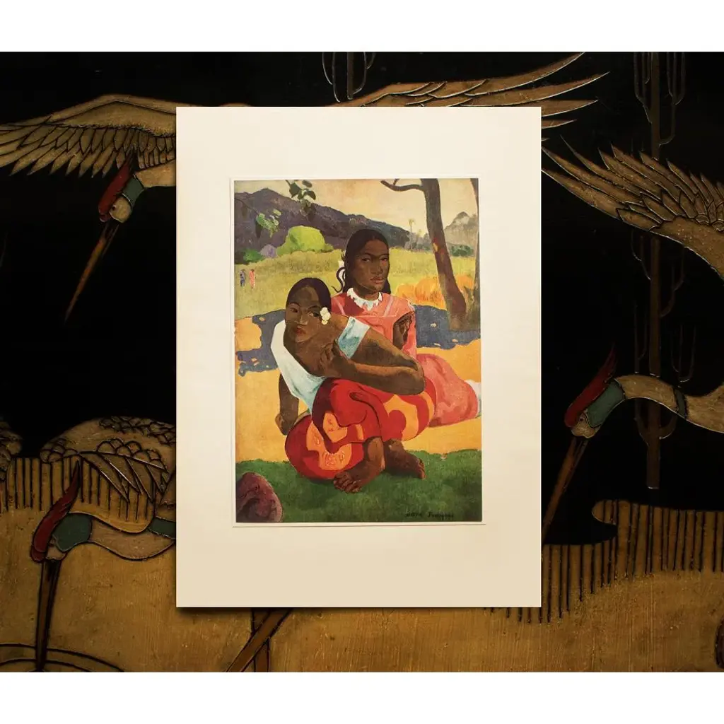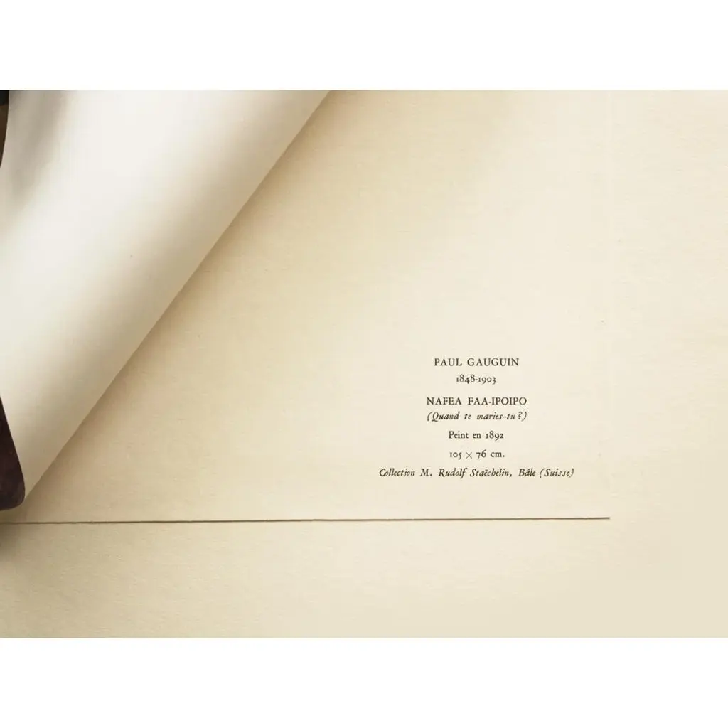 A stunning First Edition full-color print of painting "Nafea Faa-Ipoipo" ("When Will You Marry?", 1892) by Paul Gauguin. Comes from a rare first limited edition folio published by Albert Skira, in the 1940s in Swtzerland. Signed in the print: "NAFEA Faa-Ipoipo". Printed on one side. Hand tipped-in on a board of heavy paper. Mounted on a larger board of vintage wove paper for display and protection. Information regarding the original artwork will be found by lifting the piece. Very detailed. Colors are brilliant. Excellent condition - minor edge wear on the board, never framed. Image 7.30"W x 10.25"H