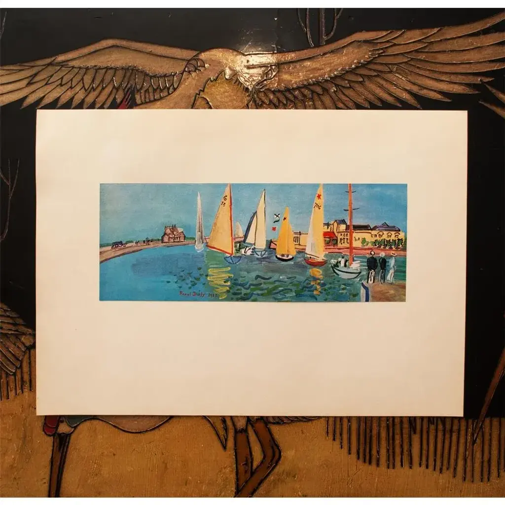 An excellent vintage period offset lithograph, print, of painting "Deauville Regatta " (1933) by Raoul Dufy. Comes from a First Limited Edition art folio published by Albert Skira in Geneva, Switzerland in the 1940s. Printed on one side. Signed in the print: Raoul Dufy. Hand tipped-in on a board of heavy paper. Information regarding the original artwork will be found by lifting the piece. Excellent condition - minor edge wear on the board, never framed. Overall 15"W x 11"H Image 10.75"W x 4.25"H