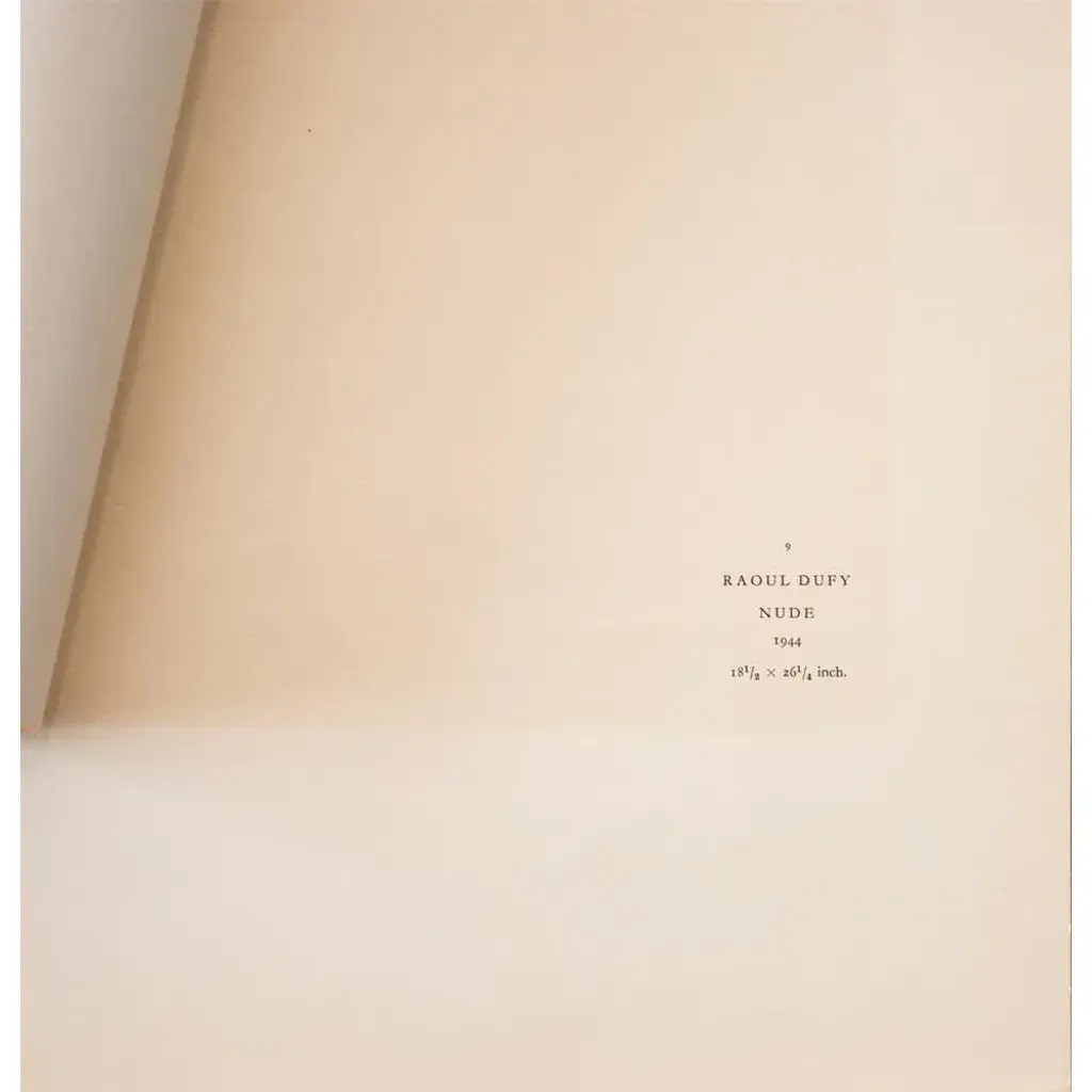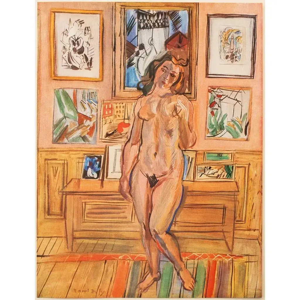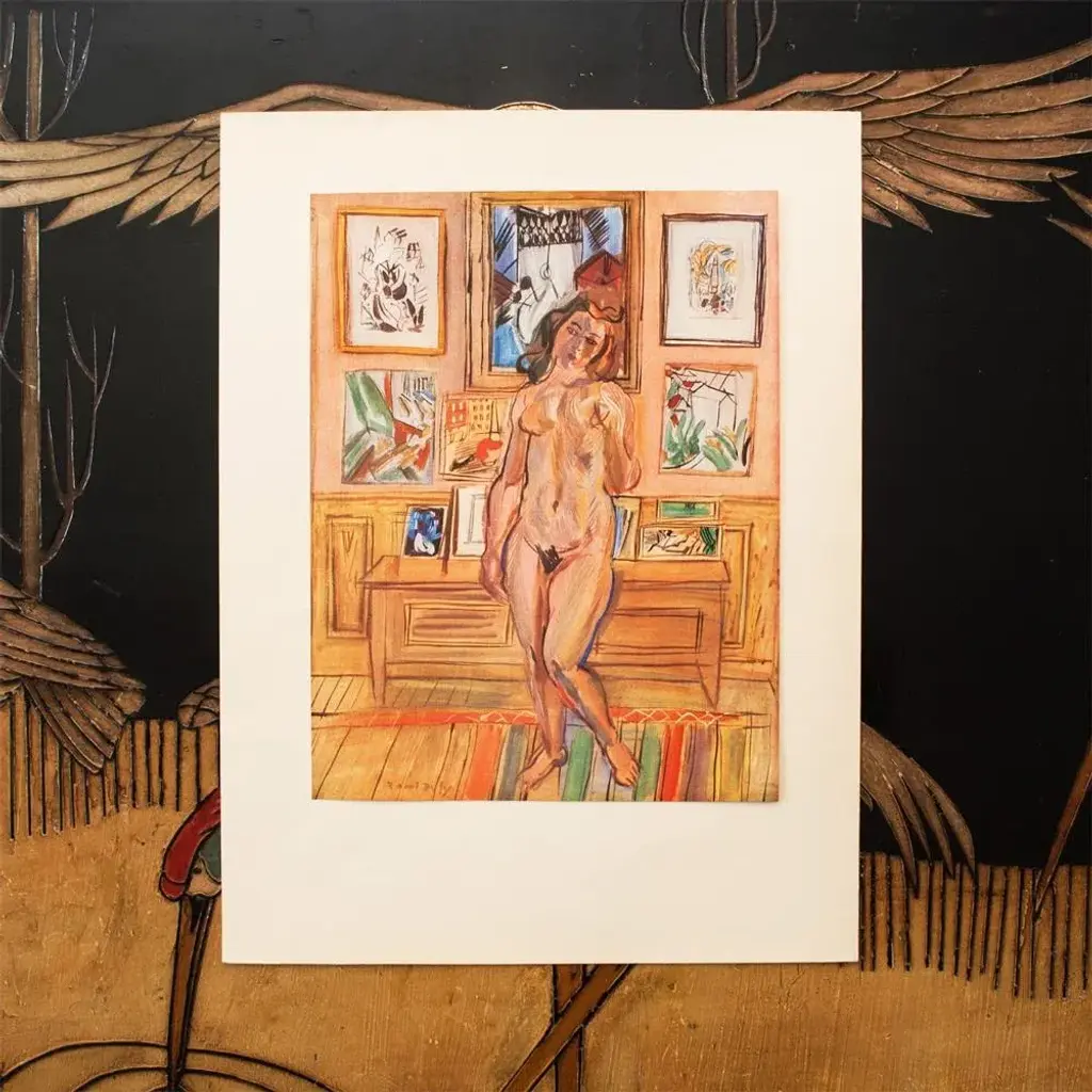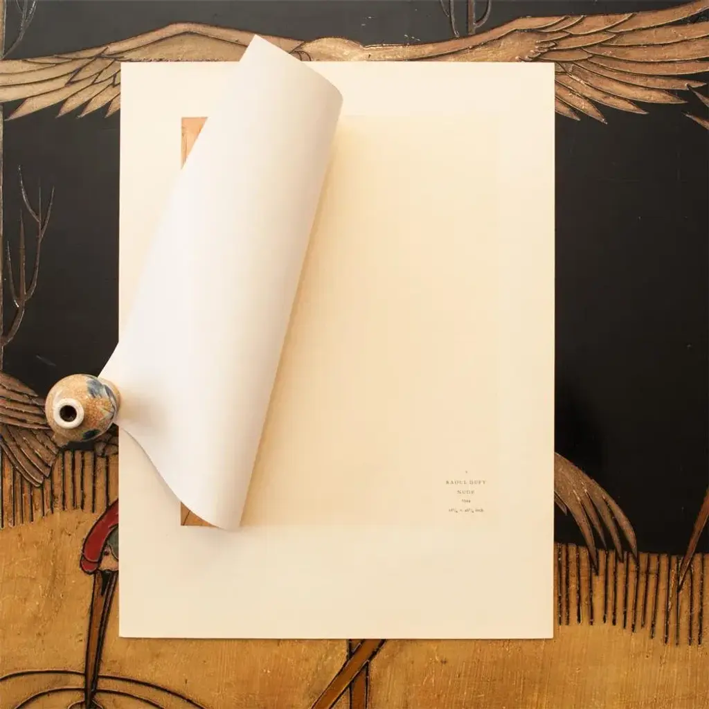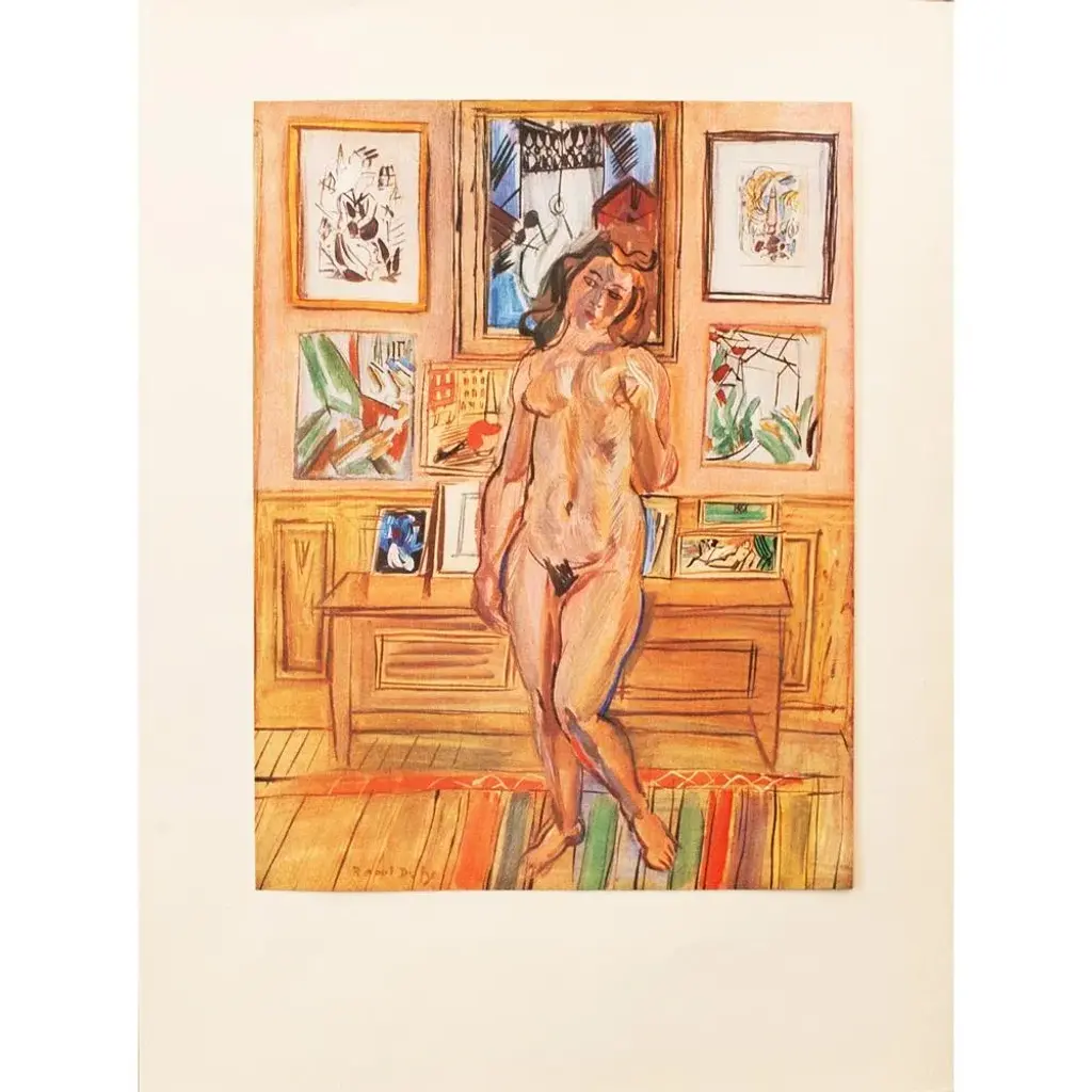 An excellent period offset lithograph, print, of oil painting "Nude" (1944) by Raoul Dufy. Comes from a First Limited Edition art folio published by Albert Skira in Geneva, Switzerland in the 1940s. Printed on one side. Signed in the print at the lower left corner: Raoul Dufy. Hand tipped-in on a board of heavy paper. Information regarding the original artwork will be found by lifting the piece. Superb quality of printing and materials. Excellent condition - minor edge wear on the board, never framed. Overall 11"W x 15"H Image 8"W x 10.5"H