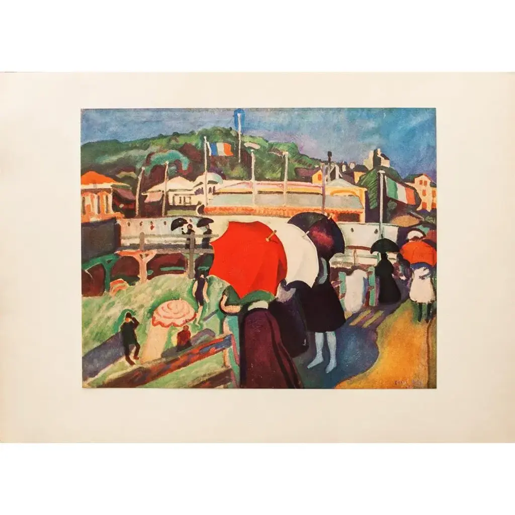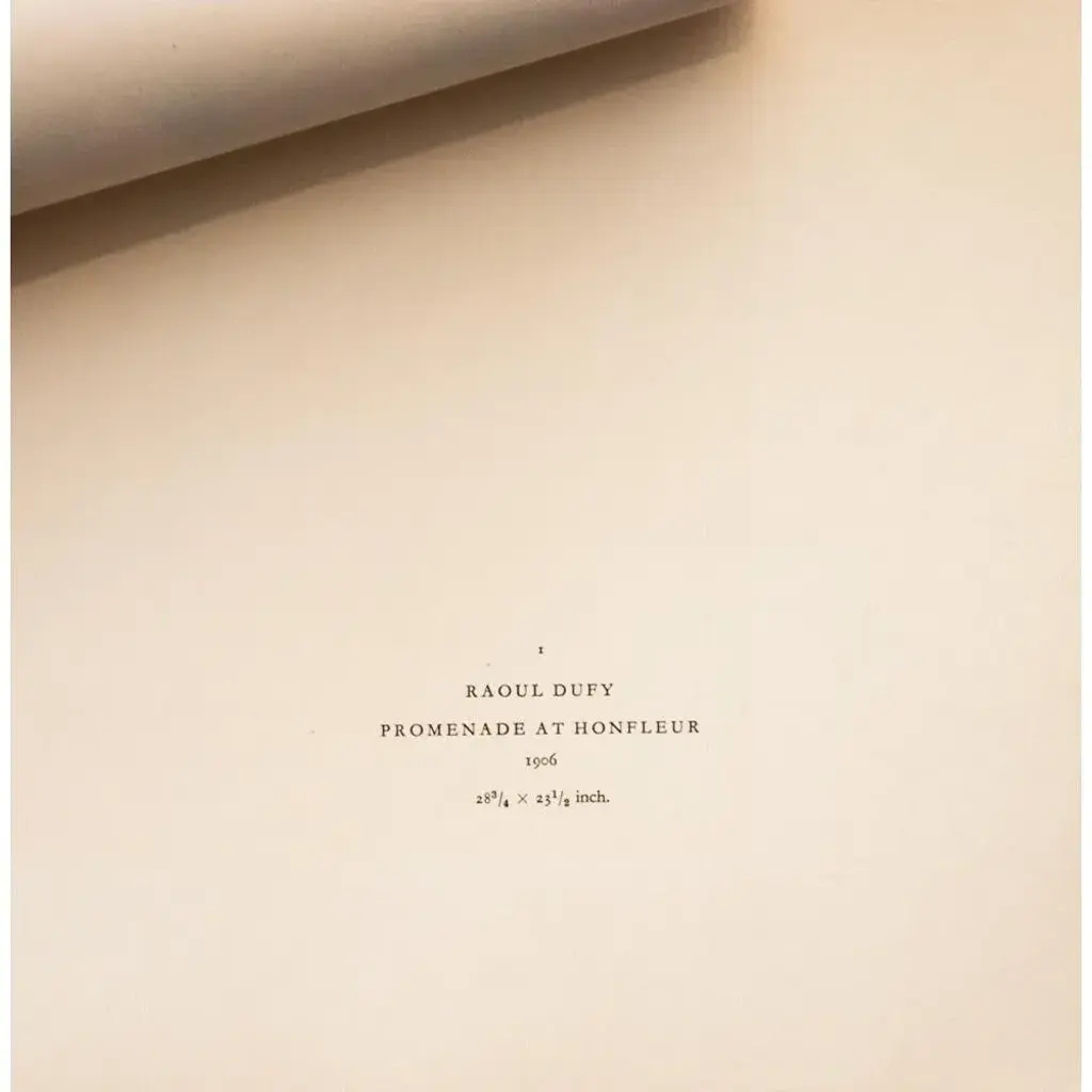 A stunning First Edition period vintage offset lithograph, print, of painting "Promenade At Honfleur" (1906) by Raoul Dufy. Comes from a First Limited Edition folio published by Albert Skira in Geneva, Switzerland, in the 1940s. Signed in the print at the lower right corner: Raoul Dufy. Printed on one side. Hand tipped-in on a board of heavy paper. Information regarding the original artwork will be found by lifting the piece. Excellent condition - minor edge wear on the board, never framed. Overall 15"W x 11.15"H Image 10.25"W x 8.25"H
