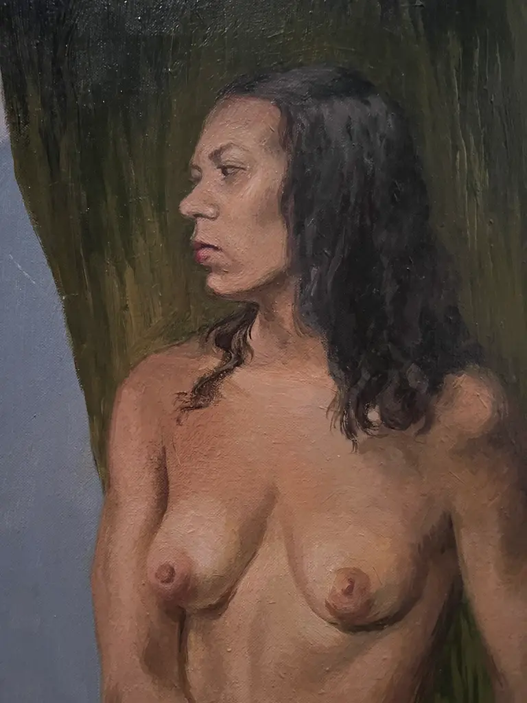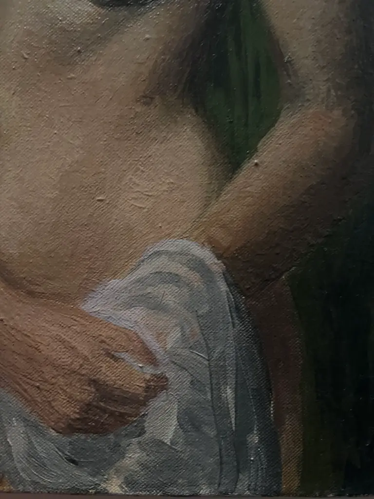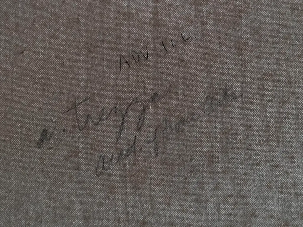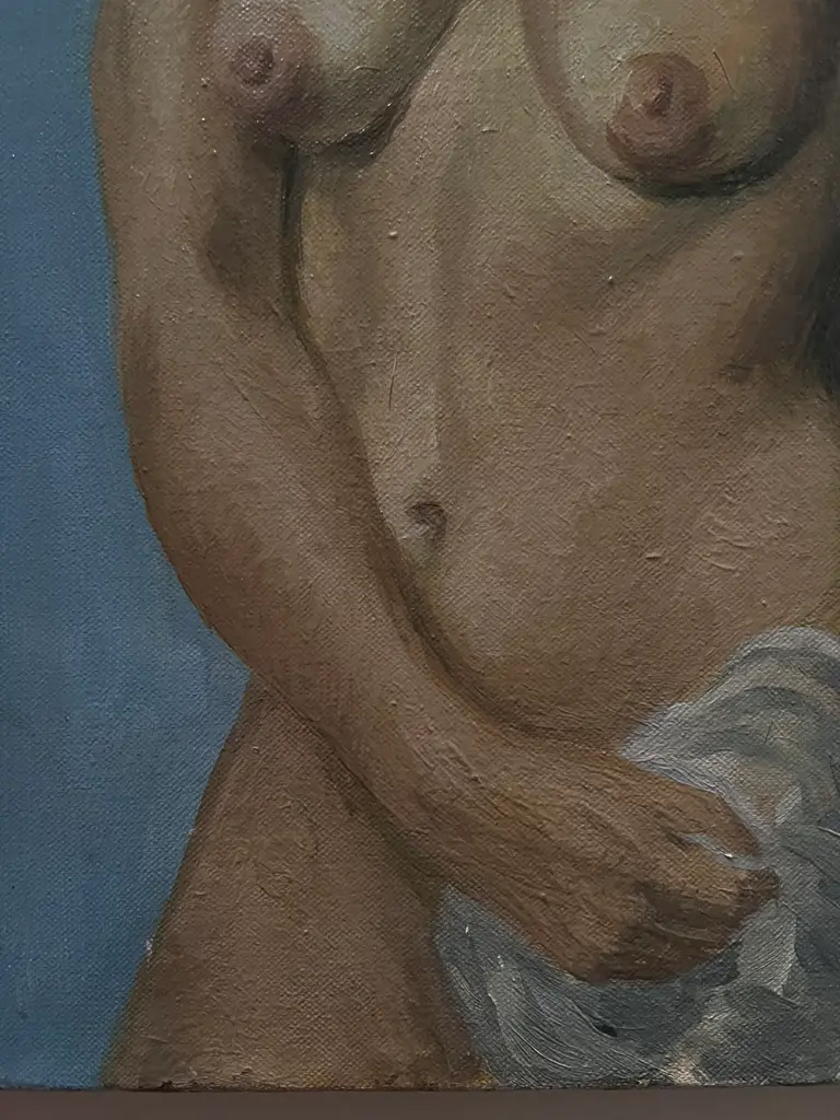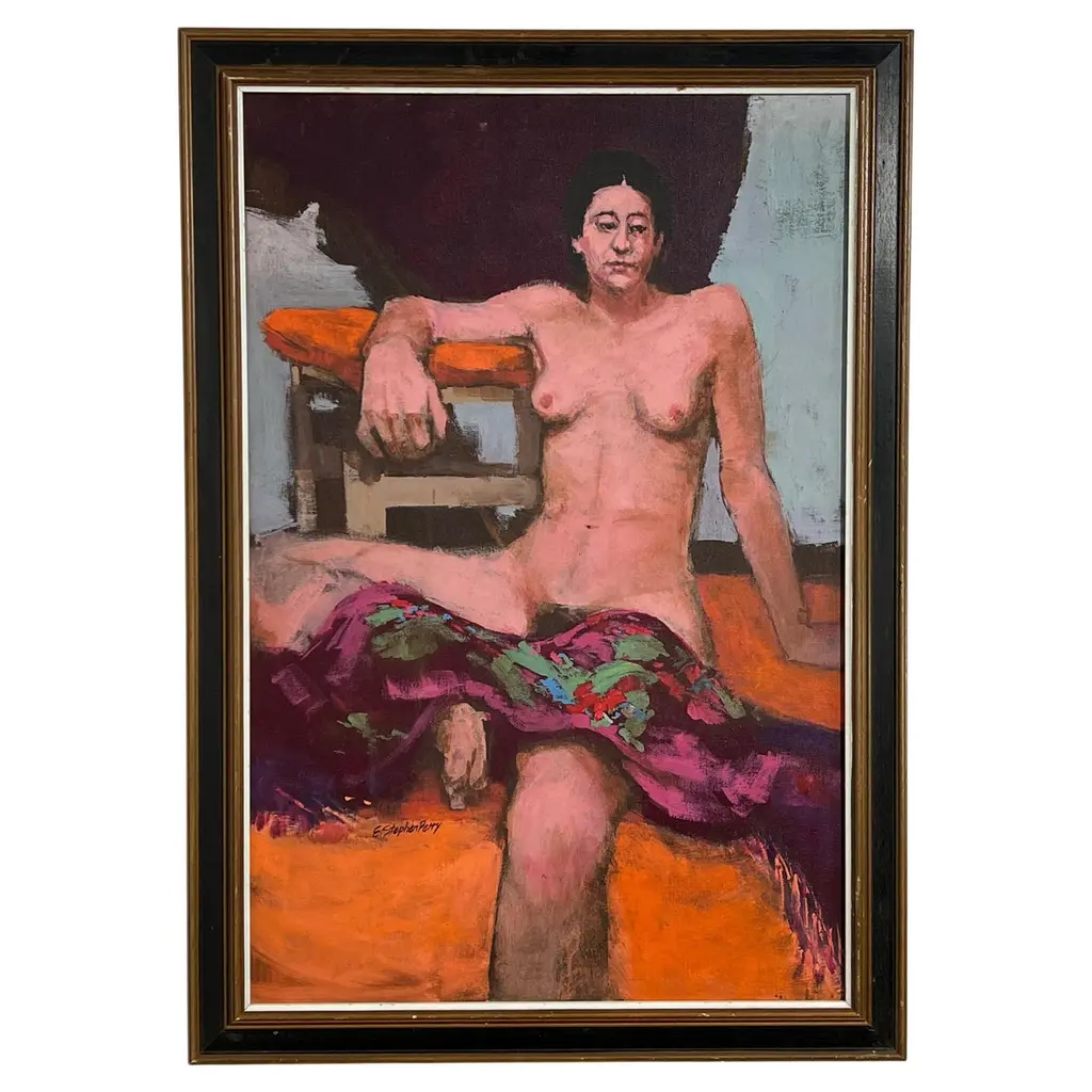 Giclee print of Female nude, against draped background, the original painting was done in approximately the mid 1940’s, when Tony was studying at the Pennsylvania Academy of the Fine Arts in Philadelphia. I believe this was done in oil paint. The abstract shapes of the background add to the unique quality of this piece.