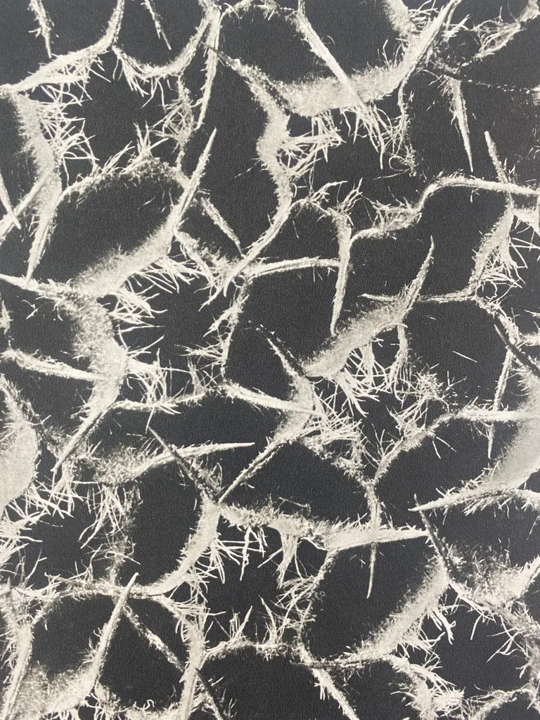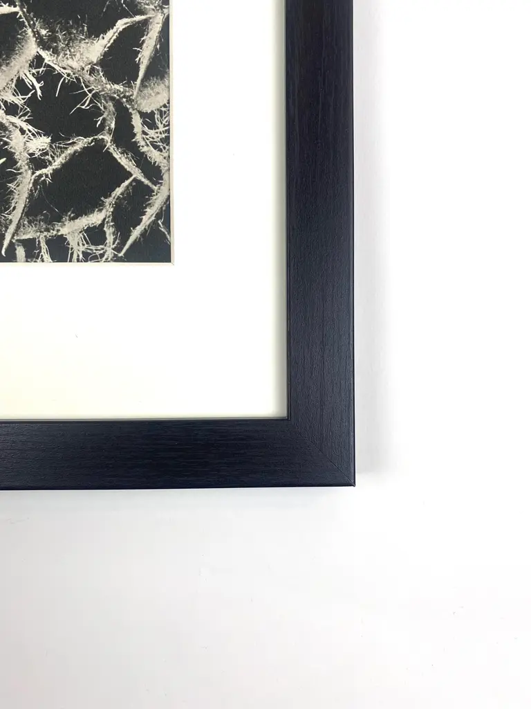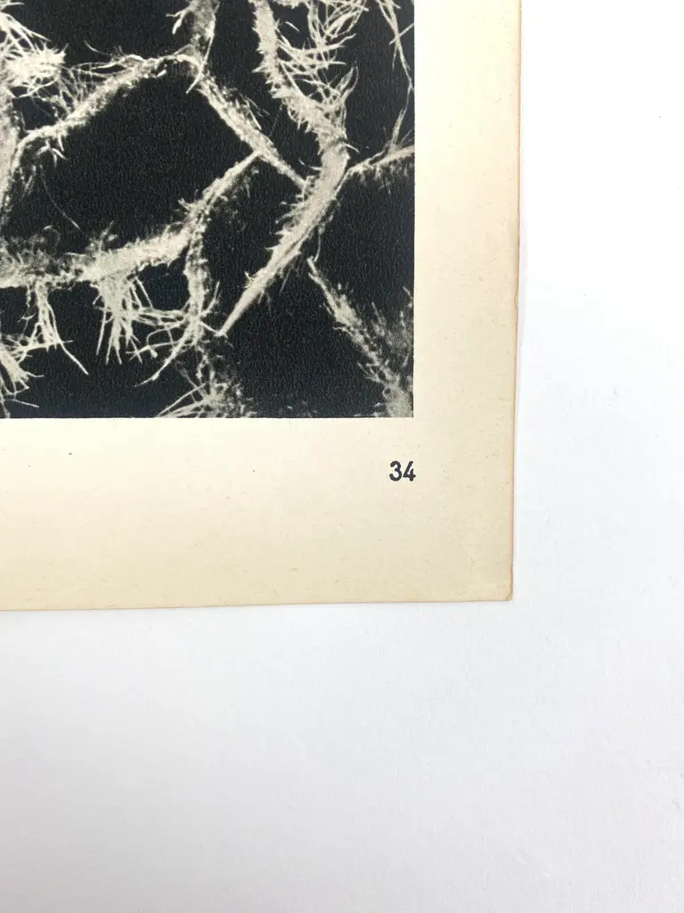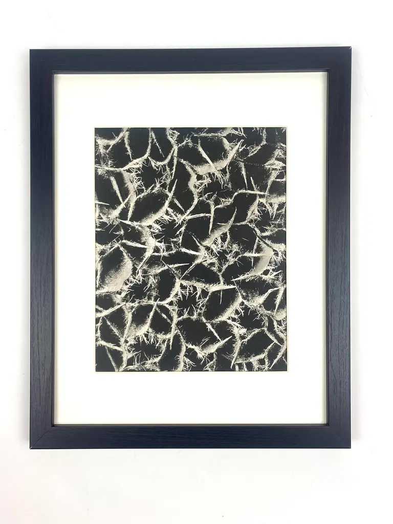 Exquisite Botanical photogravure from famed Urformen Der Kunst portfolio by Blossfeldt . Karl Blossfeldt (1865 - 1932) was a German professor of sculpture, artist and photographer. His images were some of the most innovative photographic work of the time. He is best known for his magnified photographs of plants. Blossfeldt actually made his own camera that could magnify up to thirty times. He revealed extraordinary shapes in plants. This particular botanical image is No. 34 - Horehound. Enlarged 8X. The frame is wooden, painted black, with glass