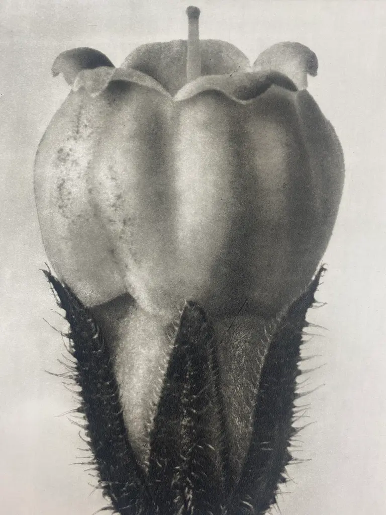 Exquisite Botanical photogravure from famed Urformen Der Kunst portfolio by Blossfeldt . Karl Blossfeldt (1865 - 1932) was a German professor of sculpture, artist and photographer. His images were some of the most innovative photographic work of the time. He is best known for his magnified photographs of plants. Blossfeldt actually made his own camera that could magnify up to thirty times. He revealed extraordinary shapes in plants. This particular botanical image is No. 44 - Common Comfrey. Enlarged 8X. The frame is wooden, painted black, with glass