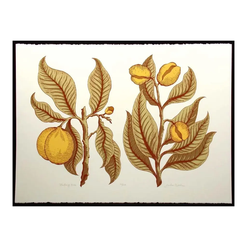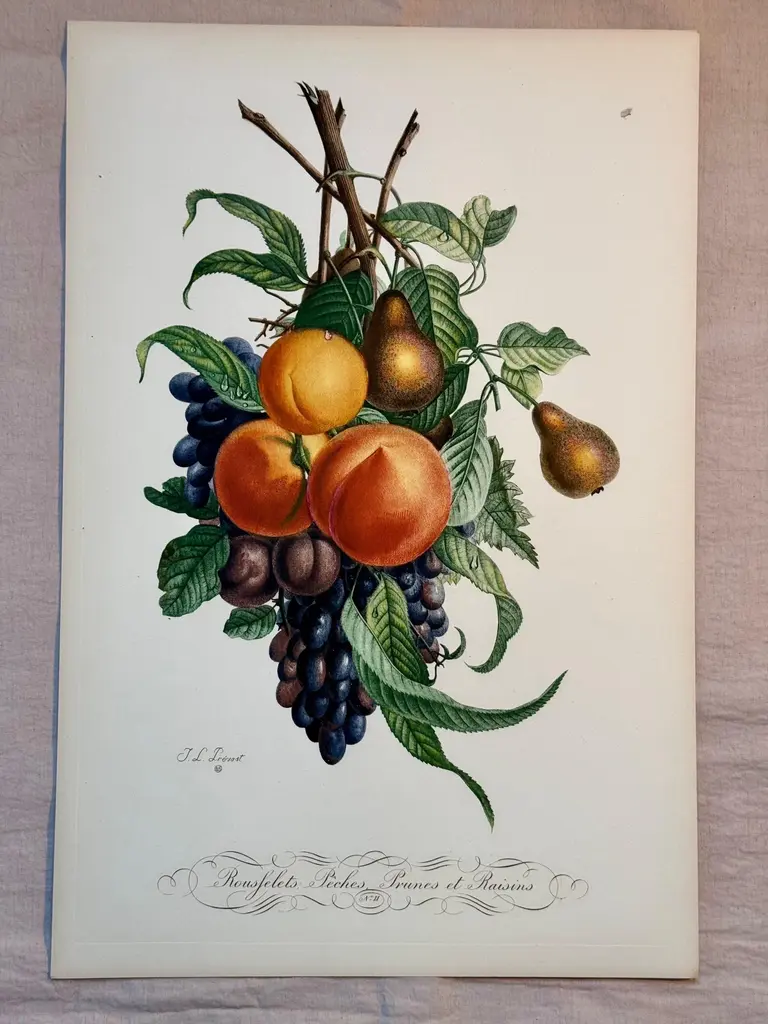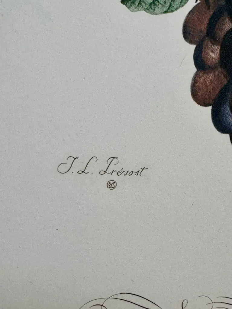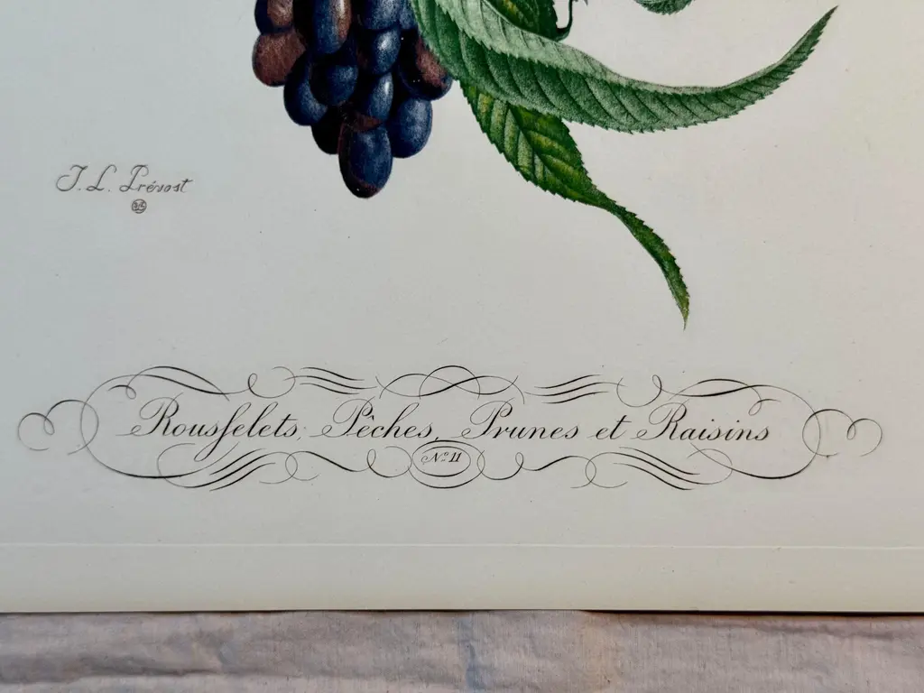 Restrike engraving titled Rousfelets, Peches, Prunes et Raisins by the noted 18th and 19th Century French botanical artist Jean Louis Prévost. Jean Louis Prévost was the predominant member of a family of French painters who specialized in the depiction of flowers and fruit. He was born in the village of Nointel, near Beaumont-sur-Oise, and received his training in Paris, in the studio of Jean Jacques Bachelier. His exquisite paintings were highly sought after in the second half of the eighteenth century. Examples of his work were found in the great collections of the day, including those of the Prince de Conti, the Marquis de Livois, the Marquise de Langeac, and the financiers Nicolas Beaujon, Augustin Blondel de Gagny and Alexis Janvier La Live de la Briche. The Cabinet des Estampes at the Bibliothèque Nationale in Paris preserves a set of more than forty gouaches by Prévost le jeune depicting the various ornamental uses of flowers. Printed in 1940 by the American Engraving Company.