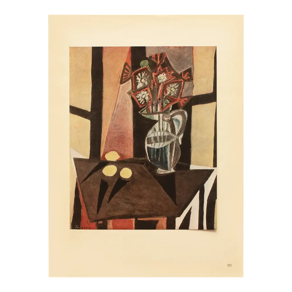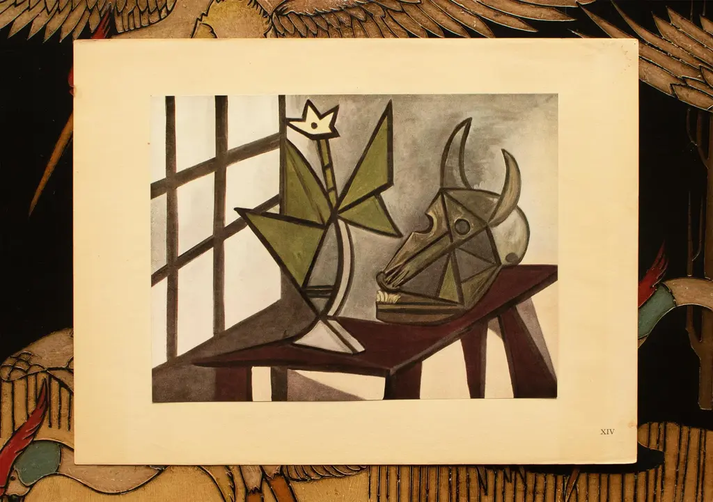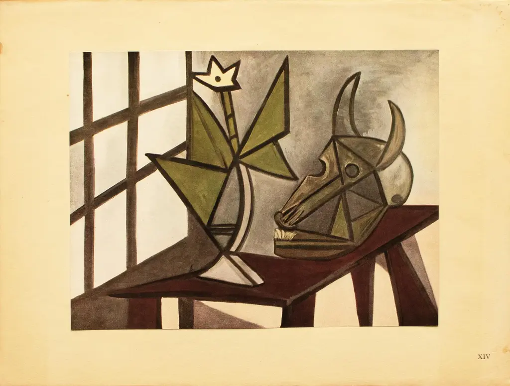 An excellent period First Edition offset lithograph, full-color print, after Cubist painting "Still Life with Skull of Ox" ("Nature Morte Au Crâne De Bœuf" , circa 1942) by Pablo Picasso from a First limited edition art folio, published by Les Editions Du Chene in Paris, France in 1943. Pieces for this folio were selected by Pablo Picasso himself. Printed on one side. Hand tipped-in on a board of heavy paper. Information regarding the original artwork will be found by lifting the piece, in French. Numbered on the board: XIV. Excellent condition of the print, tanning and edge wear on the board, never framed. Overall 14.90"W x 11"H Image 10.55"W x 7.80"H On the subject of the editor: Editions du Chêne, Paris 1941, it is an occupied Paris which witnesses the emergence, 16, place Vendôme, of the Editions du Chêne. A risky bet given that its 21-year old founder was called Maurice Kahane, an atheist Jewish man who would then adopt the name of his mother, Girodias. The Chêne specialised itself by the edition of art books and literature. The Editions du Chêne would become a branch of the Hachette group in 1951. The edition of art books would then adopt pride of place. George Herscher takes over the Hachette house with enthusiasm in 1971.