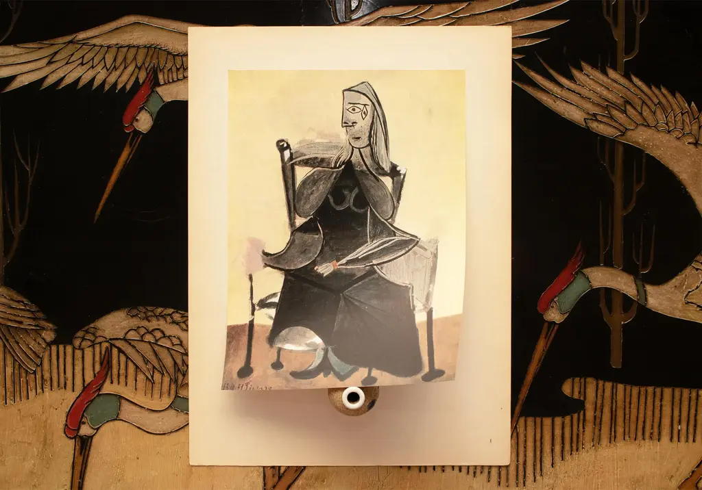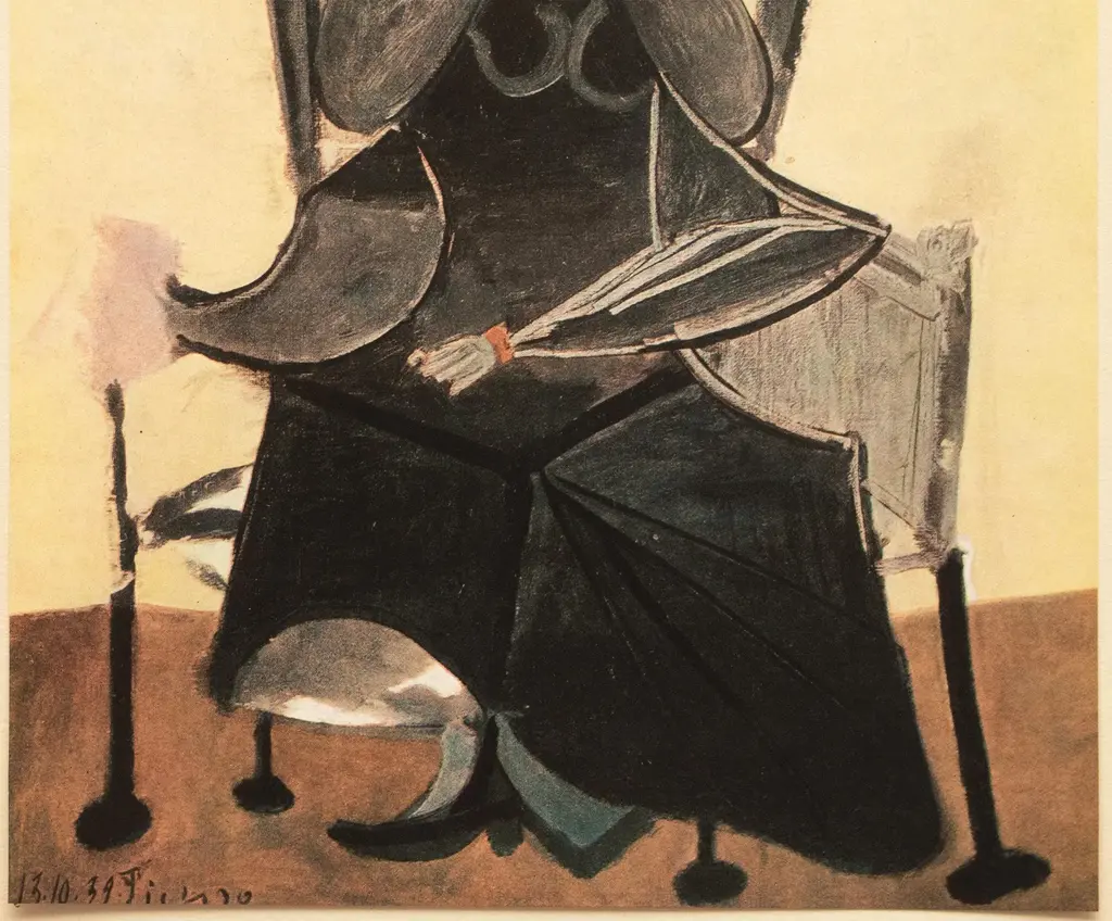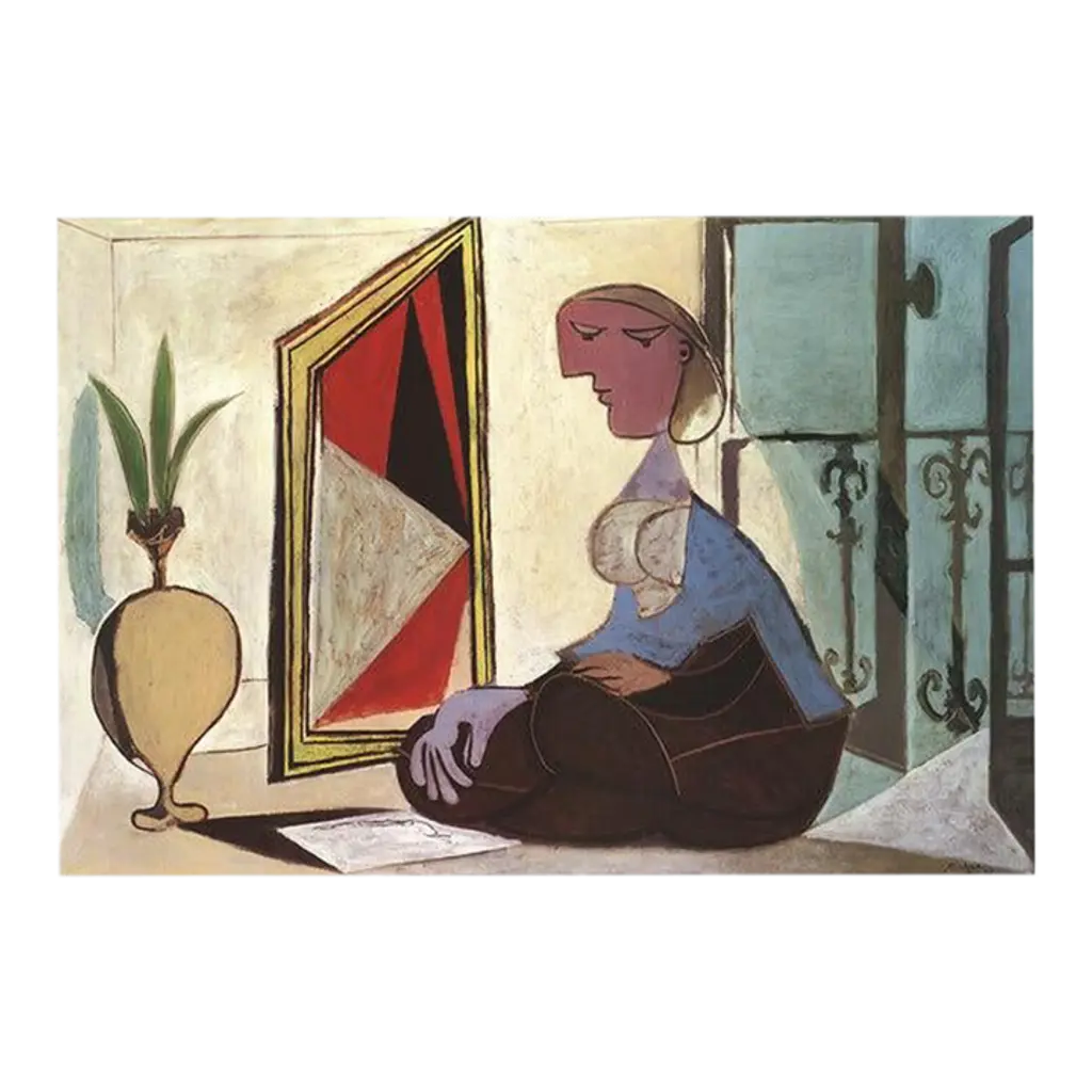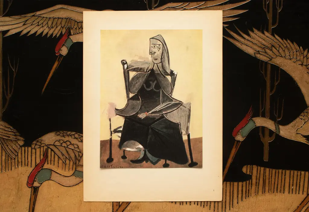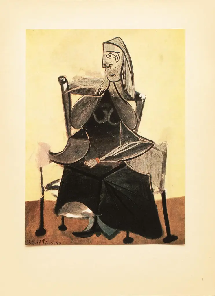 An excellent vintage period offset lithograph, full-color print, after Cubist painting "Seated Woman" (Femme Assise, 1939) by Pablo Picasso. Comes from a Second Limited Edition of XVI pieces from Picasso's Cubism period, published by Les Editions Du Chene in Paris, France in 1946. Printed on one side. Hand tipped-in on a board of heavy paper. Numbered on the board: I. Information regarding the original artwork will be found by lifting the piece, in French. Excellent condition - light tanning and some edge wear on the board; never framed. Overall 10.95"W x 14.90"H Image 8.10"W x 10.75"H On the subject of the editor: Editions du Chêne, Paris 1941, it is an occupied Paris which witnesses the emergence, 16, place Vendôme, of the Editions du Chêne. A risky bet given that its 21-year old founder was called Maurice Kahane, an atheist Jewish man who would then adopt the name of his mother, Girodias. The Chêne specialized itself by the edition of art books and literature. The Editions du Chêne would become a branch of the Hachette group in 1951. The edition of art books would then adopt pride of place. George Herscher takes over the Hachette house with enthusiasm in 1971.