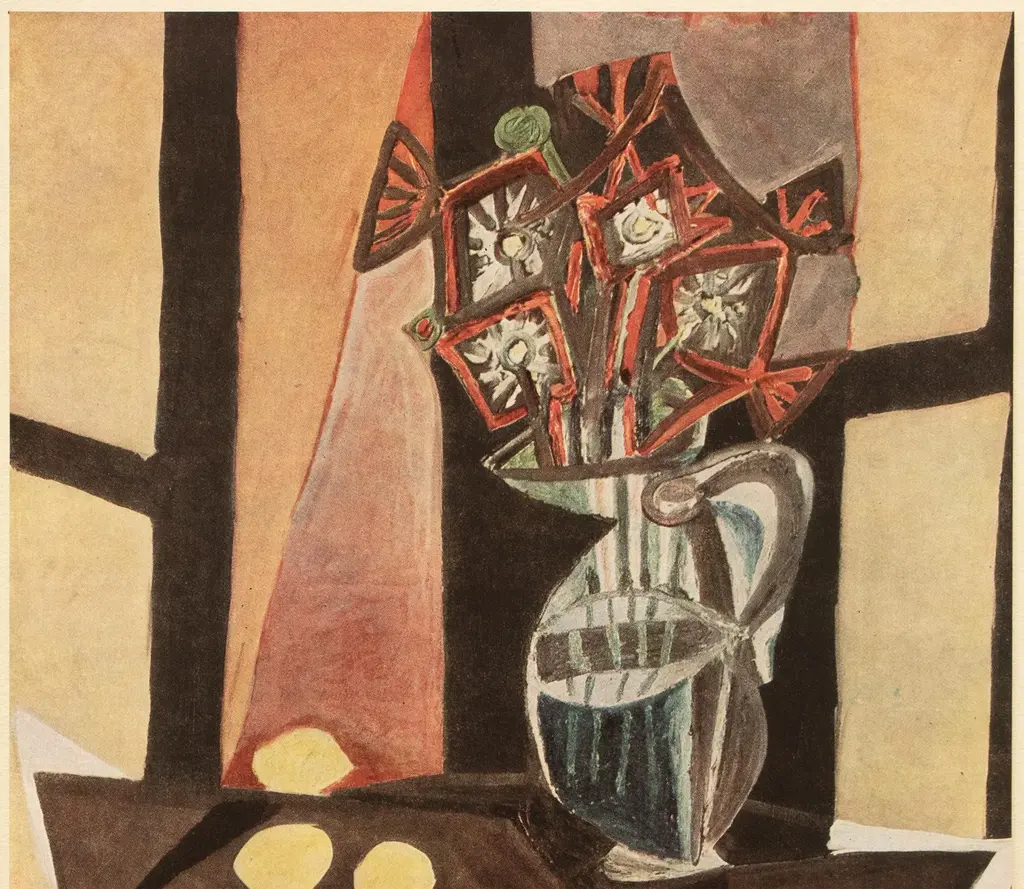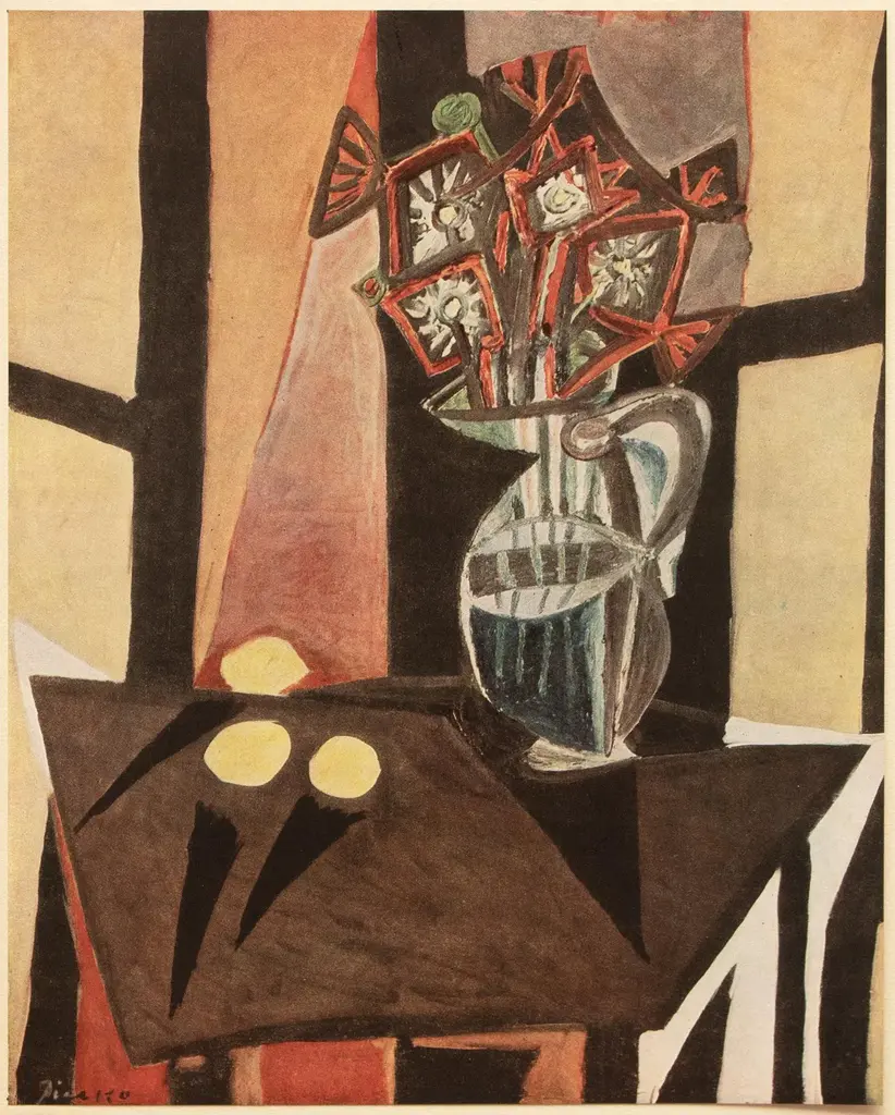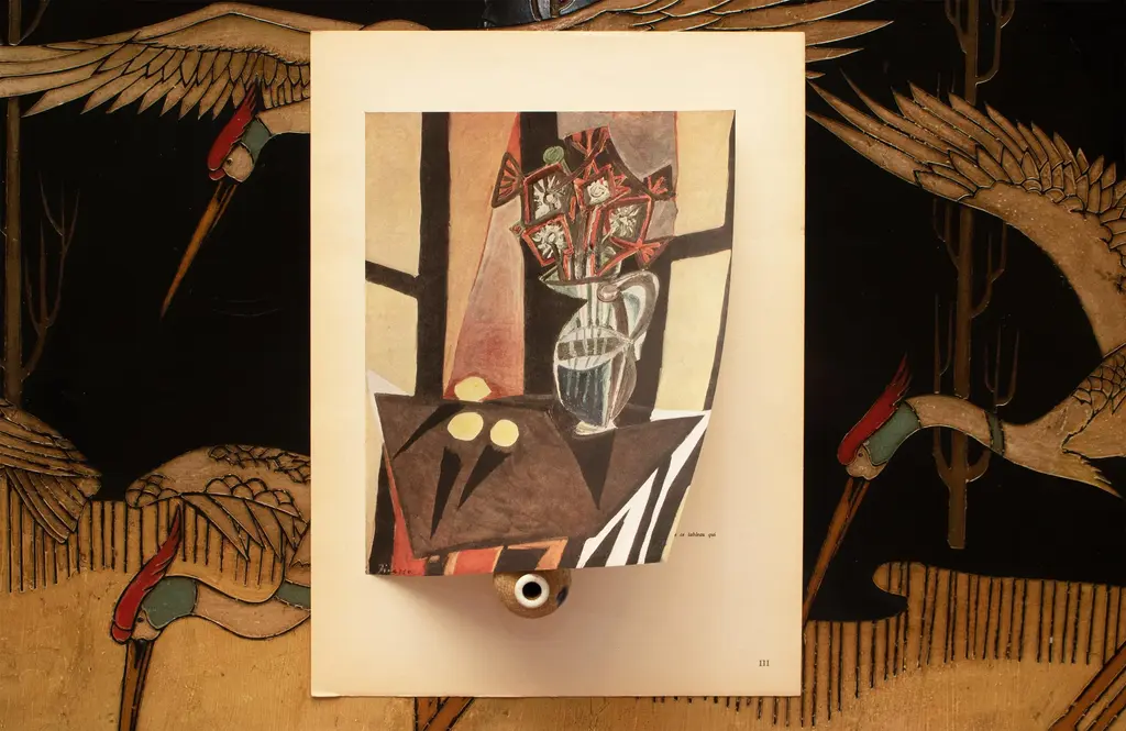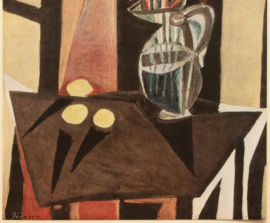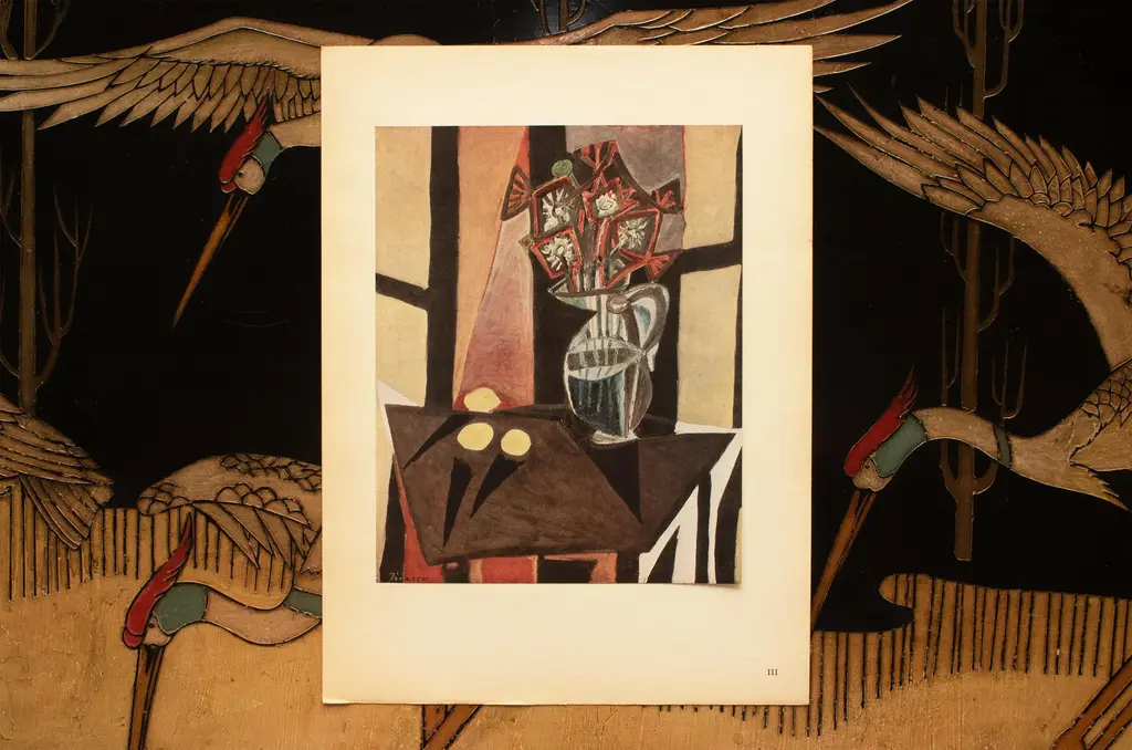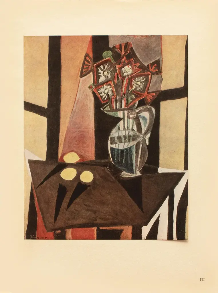 An excellent period vintage offset lithograph, full-color print, after Cubist painting "Nature Morte" (Still Life, 1941) by Pablo Picasso. Comes from a Second Limited Edition of XVI pieces from Picasso's Cubism period, published by Les Editions Du Chene in Paris, France in 1946. Printed on one side. Hand tipped-in on a board of heavy paper. Information regarding the original artwork will be found by lifting the piece, in French. Numbered on the board: III. Excellent condition - light tanning and edge wear on the board; never framed. Overall 10.95"W x 14.90"H Image 8.20"W x 10.30"H On the subject of the editor: Editions du Chêne, Paris 1941, it is an occupied Paris which witnesses the emergence, 16, place Vendôme, of the Editions du Chêne. A risky bet given that its 21-year old founder was called Maurice Kahane, an atheist Jewish man who would then adopt the name of his mother, Girodias. The Chêne specialized itself by the edition of art books and literature. The Editions du Chêne would become a branch of the Hachette group in 1951. The edition of art books would then adopt pride of place. George Herscher takes over the Hachette house with enthusiasm in 1971.