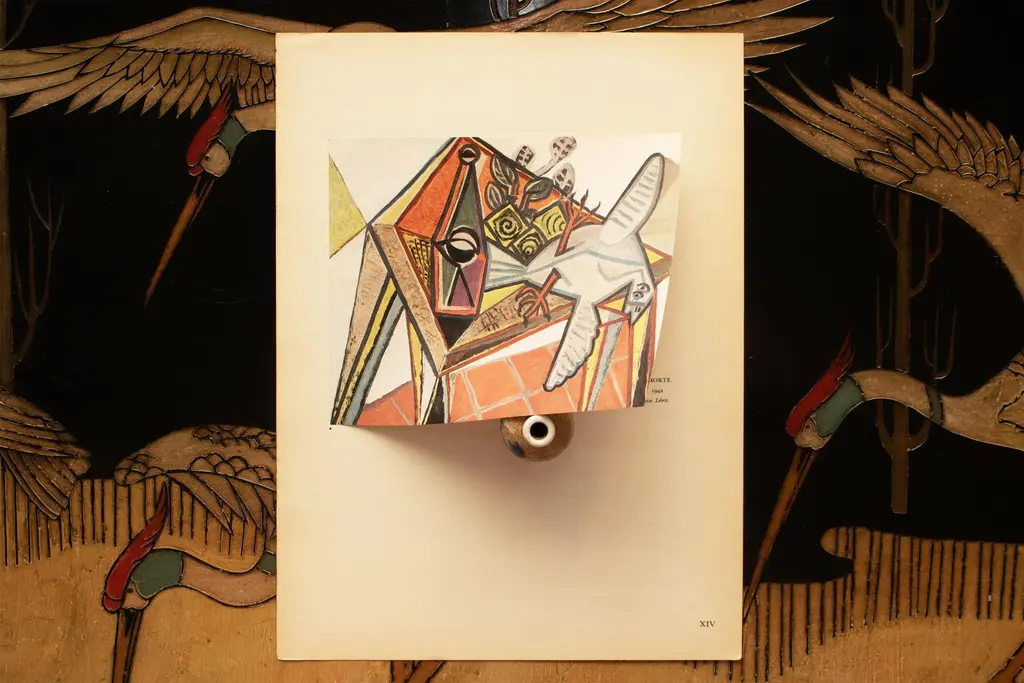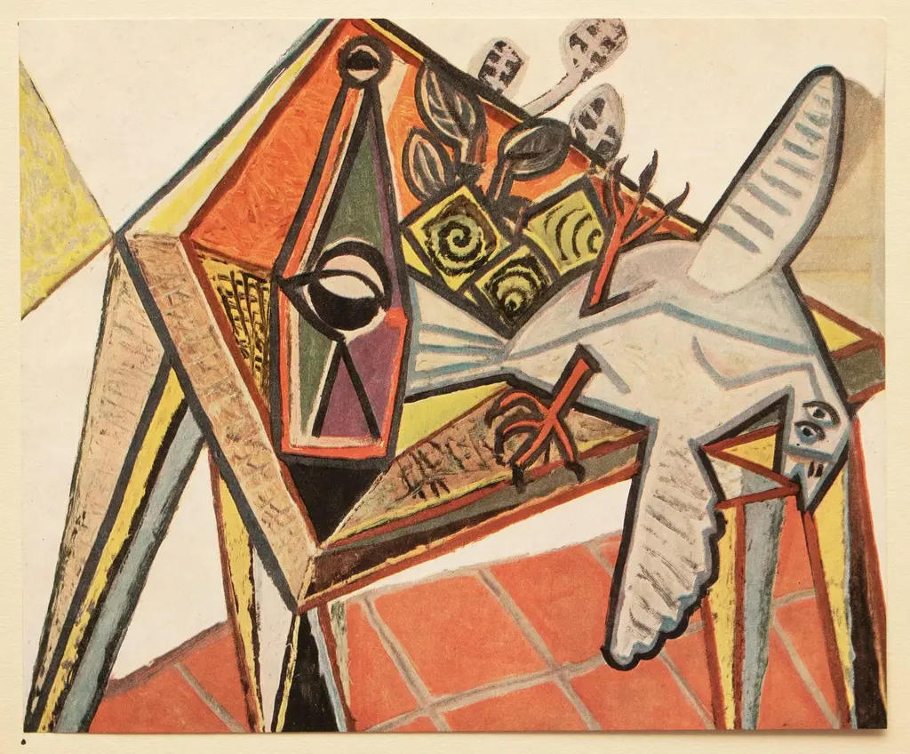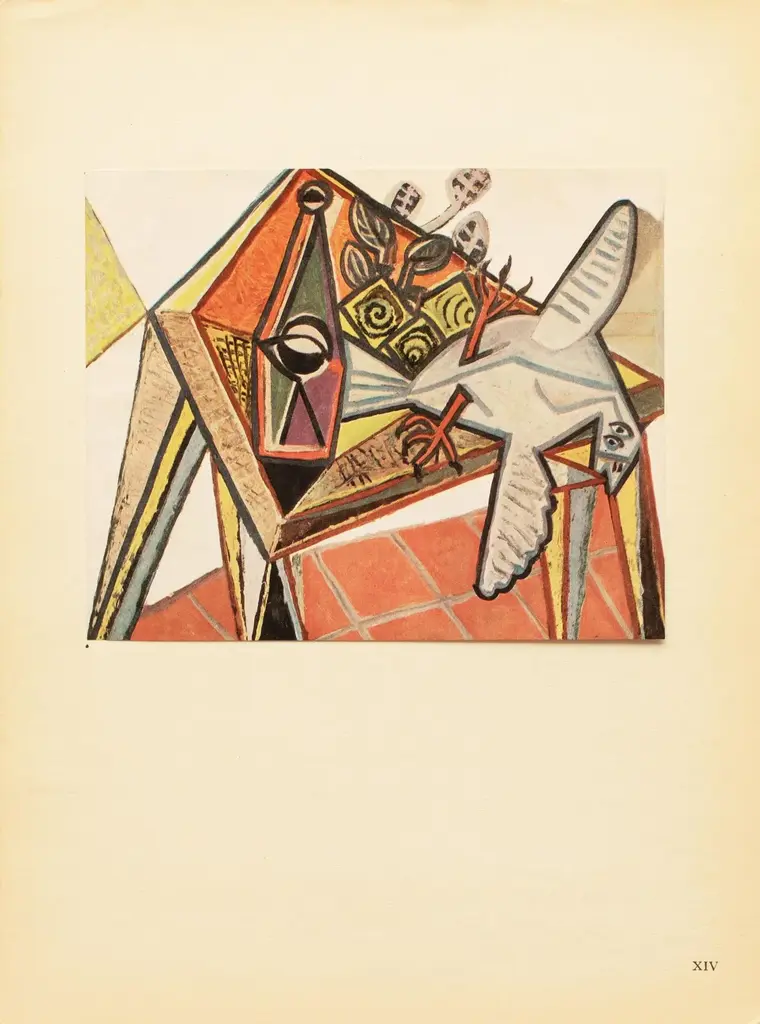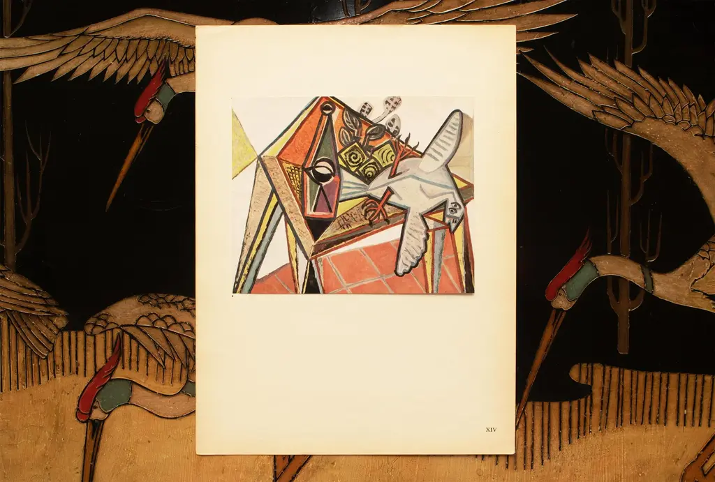 A period vintage offset lithograph, full-color print, after Cubist painting "Nature Morte" (Still Life, circa 1942) by Pablo Picasso. Comes from a Second Limited Edition art folio, published by Les Editions du Chene in Paris, France in 1946. Printed on one side. Hand tipped-in on a board of heavy paper. Information regarding the original artwork will be found by lifting the piece, in French. Numbered on the board: XIV. Excellent condition of the print; the board shows light tanning at edges and some edge wear; never framed. Overall 10.95"W x 14.90"H Image 8.30"W x 6.80"H On the subject of the editor: Editions du Chêne, Paris 1941, it is an occupied Paris which witnesses the emergence, 16, place Vendôme, of the Editions du Chêne. A risky bet given that its 21-year old founder was called Maurice Kahane, an atheist Jewish man who would then adopt the name of his mother, Girodias. The Chêne specialized itself by the edition of art books and literature. The Editions du Chêne would become a branch of the Hachette group in 1951. The edition of art books would then adopt pride of place. George Herscher takes over the Hachette house with enthusiasm in 1971.