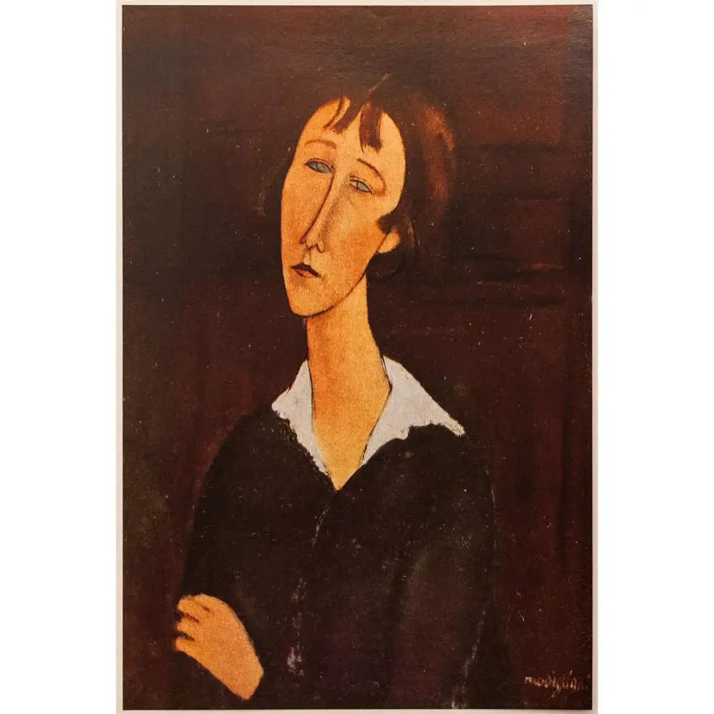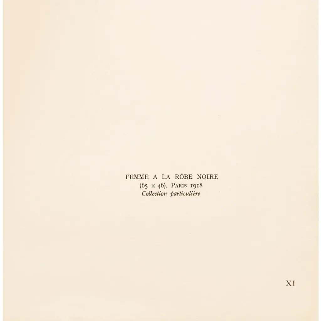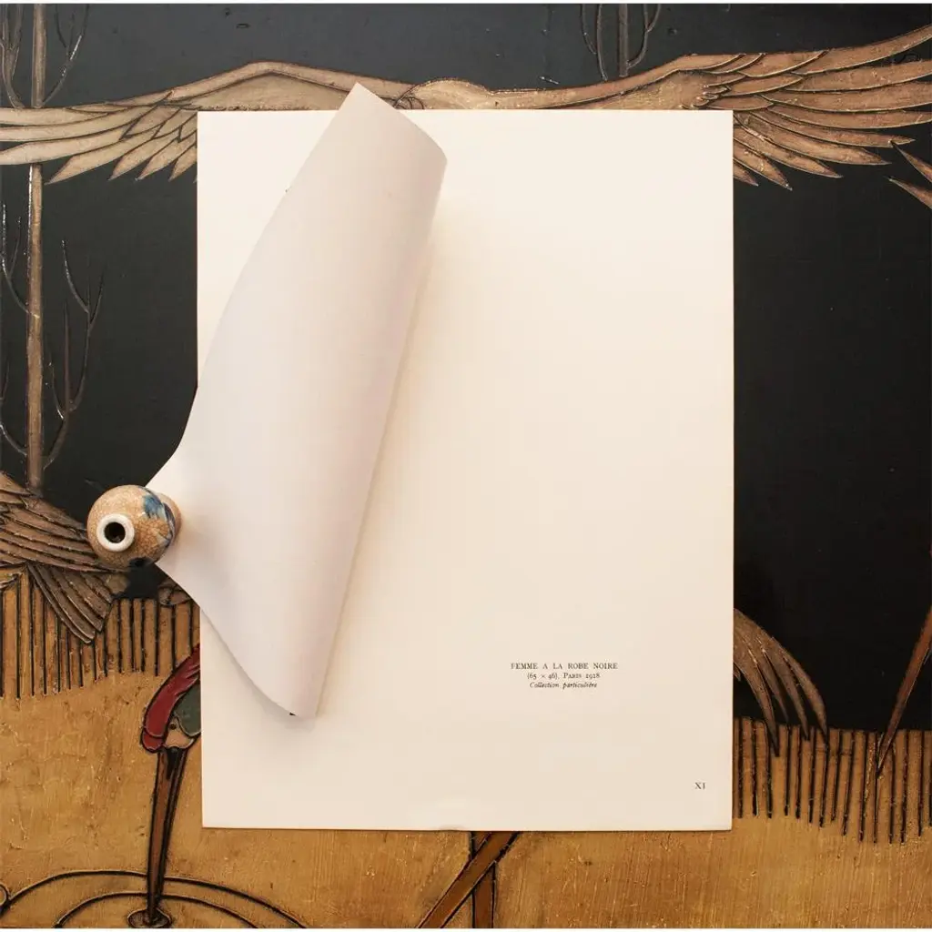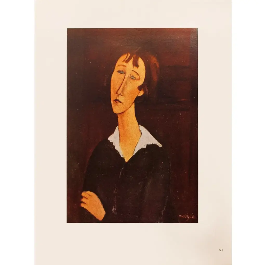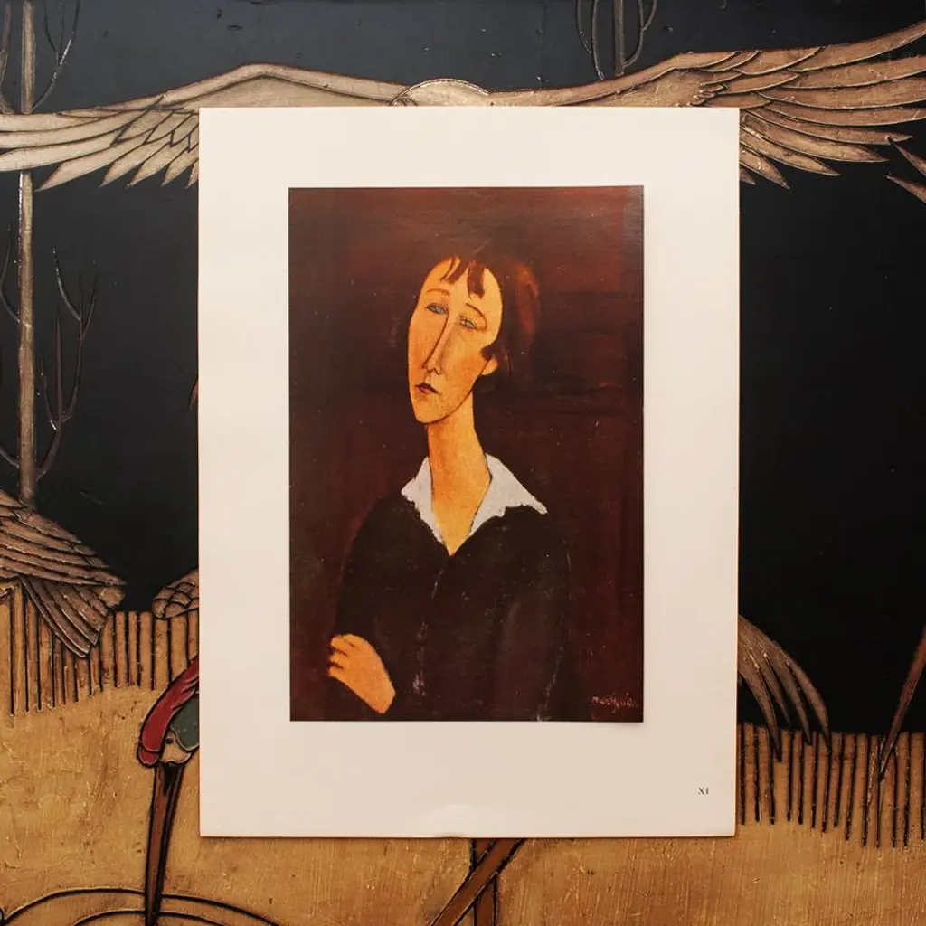 A stunning rare vintage First Edition offset lithograph, full-color print, after painting "Femme A La Robe Noire" (Woman in the Black Dress, 1918) by Amedeo Modigliani. Comes from a First Limited Edition folio published by Les Editions Du Chene in Paris, France in 1947. Signed in the print: Modigliani. Printed on one side. Numbered "XI." Hand tipped-in on a board of heavy paper. Information regarding the original artwork, in French, will be found by lifting the plate. Beautiful rich colors. Excellent condition - minor edge wear on the board, never framed. Image: 7.10"L x 10.75"H. Amedeo Clemente Modigliani (1884 - 1920) was an Italian artist of Jewish heritage, practicing both painting and sculpture, who pursued his career for the most part in France. Modigliani was born in Livorno (historically referred to in English as Leghorn), in Northwestern Italy and began his artistic studies in Italy before moving to Paris in 1906. Influenced by the artists in his circle of friends and associates, by a range of genres and art movements, and by primitive art, Modigliani's oeuvre was nonetheless unique and idiosyncratic. He died in Paris of tubercular meningitis, exacerbated by poverty, overworking, and an excessive use of alcohol and narcotics, at the age of 35. On the subject of the editor: Editions du Chêne, Paris 1941, it is an occupied Paris which witnesses the emergence, 16, place Vendôme, of the Editions du Chêne. A risky bet given that its 21-year old founder was called Maurice Kahane, an atheist Jewish man who would then adopt the name of his mother, Girodias. The Chêne specialised itself by the edition of art books and literature. The Editions du Chêne would become a branch of the Hachette group in 1951. The edition of art books would then adopt pride of place. George Herscher takes over the Hachette house with enthusiasm in 1971.