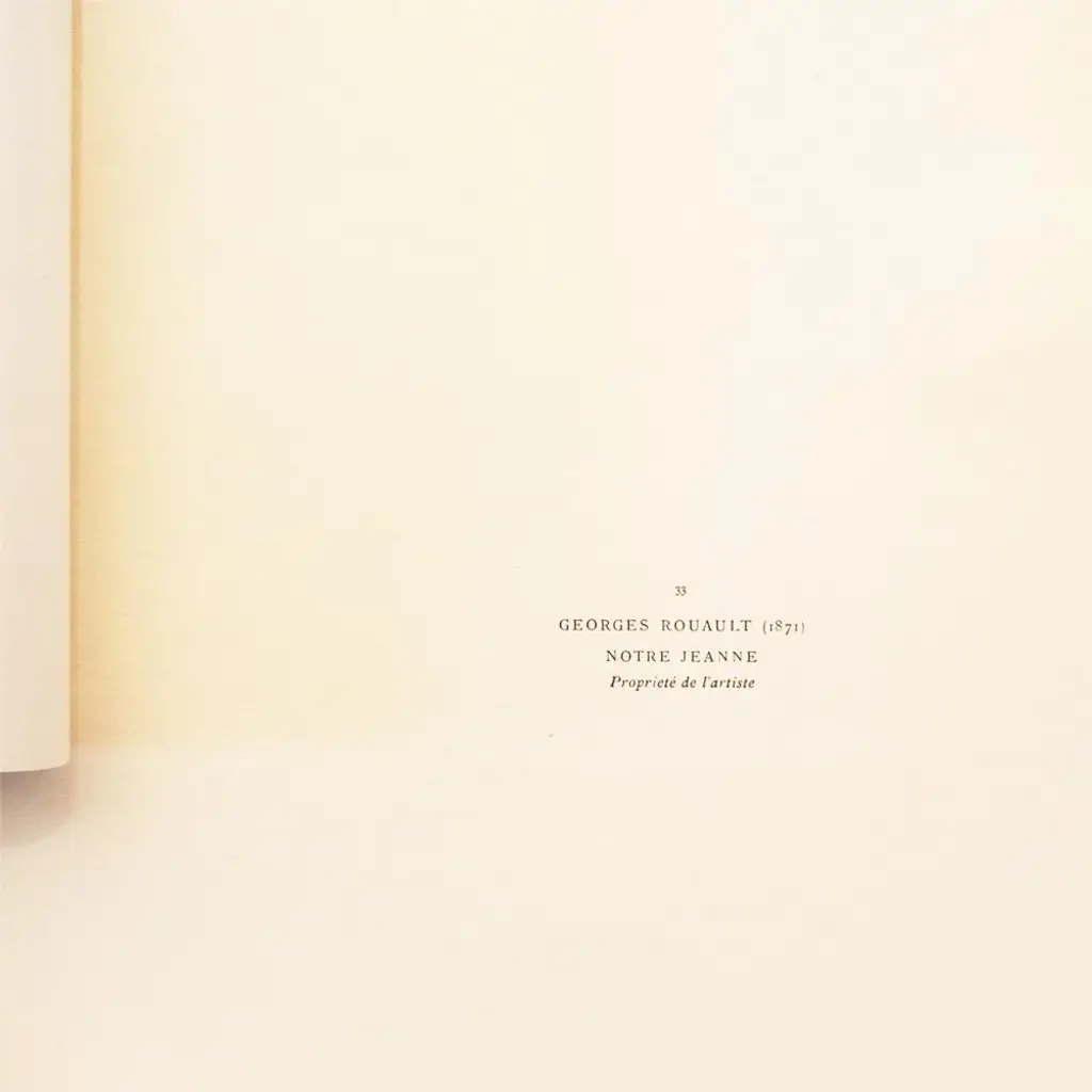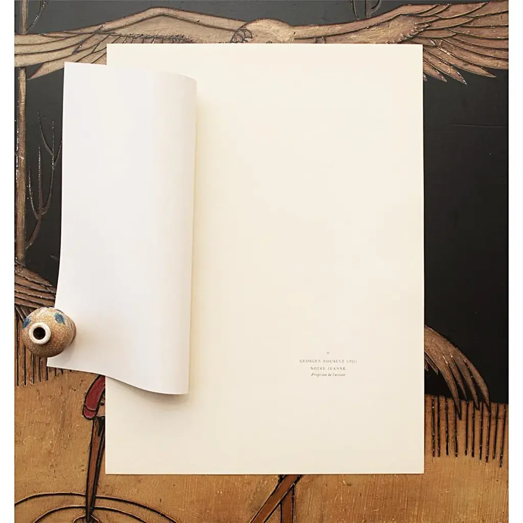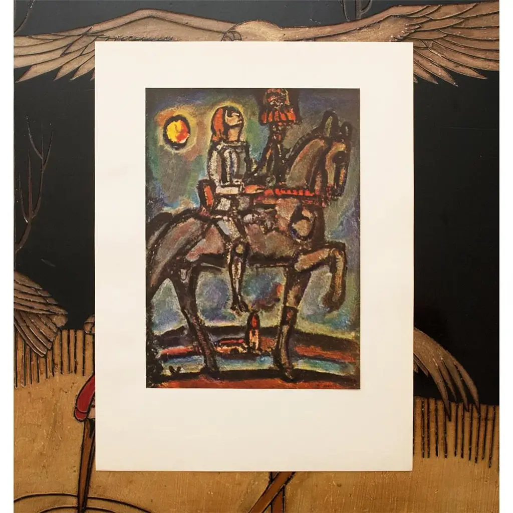 An excellent First Edition period offset lithograph, print, of oil painting "Notre Jeanne" (Our Joan, or Joan of Arc) by Georges Rouault. Comes from a rare First Limited Edition art folio published by Albert Skira in Paris, France in 1947. Printed on one side. Hand tipped-in on a board of heavy paper. Information regarding the original artwork will be found by lifting the piece. Excellent condition - minor edge wear on the board, never framed. Overall 11"W x 15"H Image 7.5"W x 10.5"H