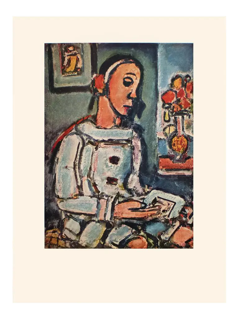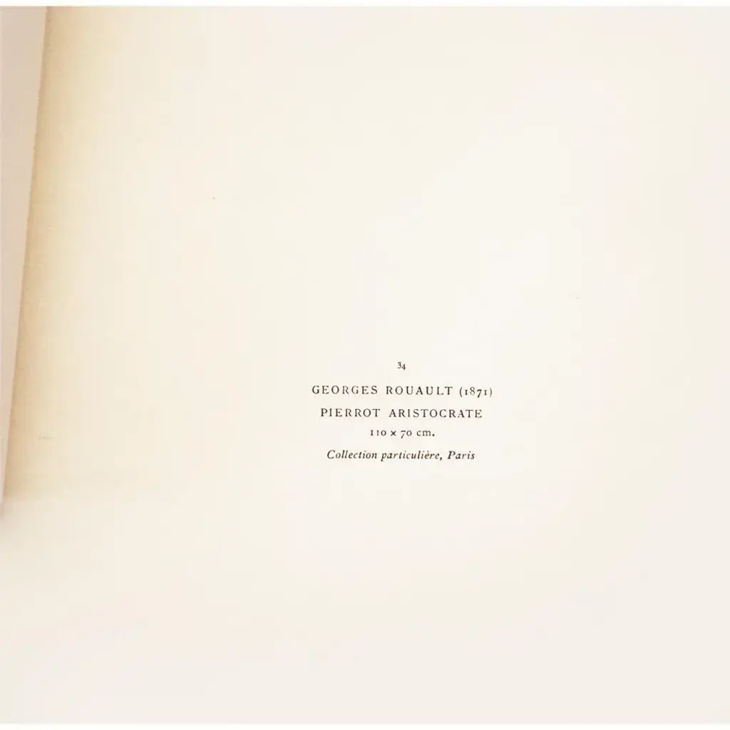 An excellent First Edition period offset lithograph, print, of oil painting "Pierrot Aristocrate" by Georges Rouault (1871-1958). Comes from a rare First Limited Edition art folio published by Albert Skira in Paris, France in 1947. Printed on one side. Hand tipped-in on a board of heavy paper. Information regarding the original artwork will be found by lifting the piece. Excellent condition - minor edge wear on the board, never framed. Overall 11"W x 15"H Image 6.45"W x 10.45"H