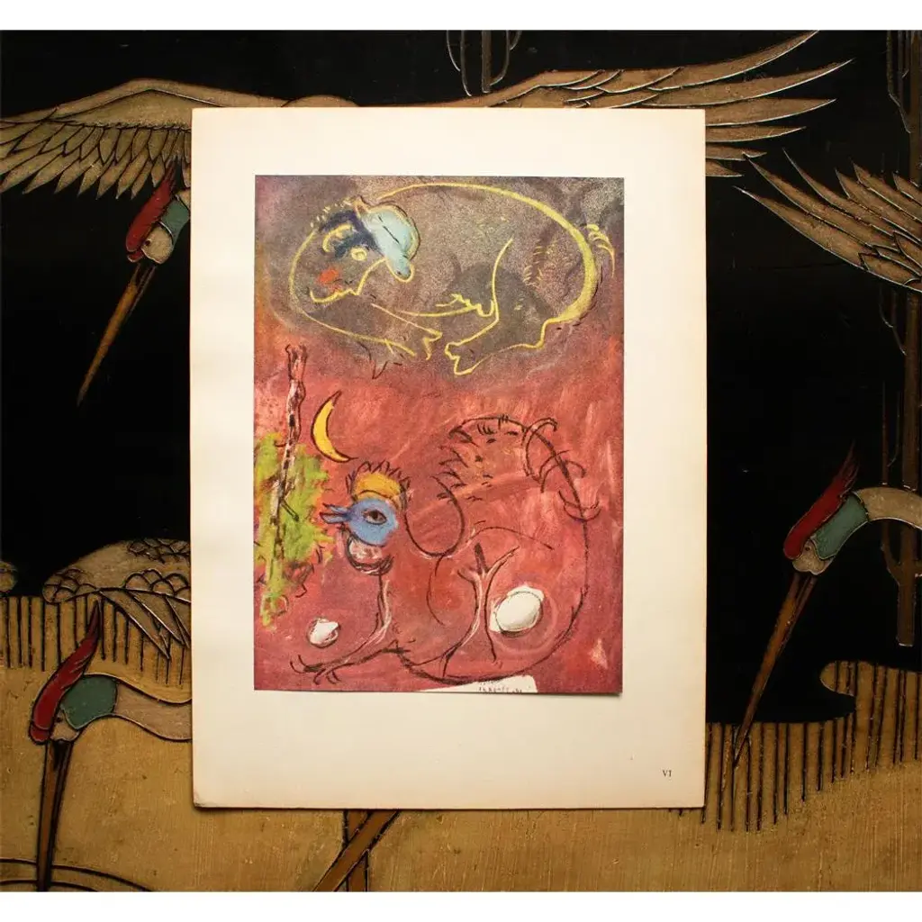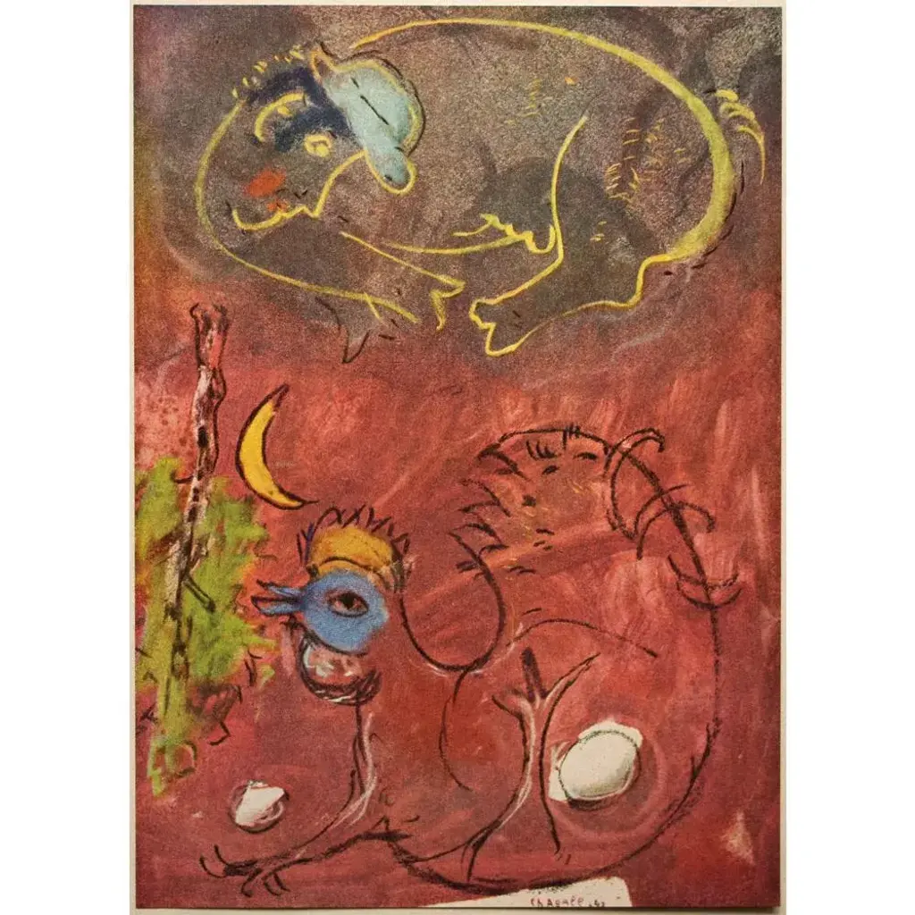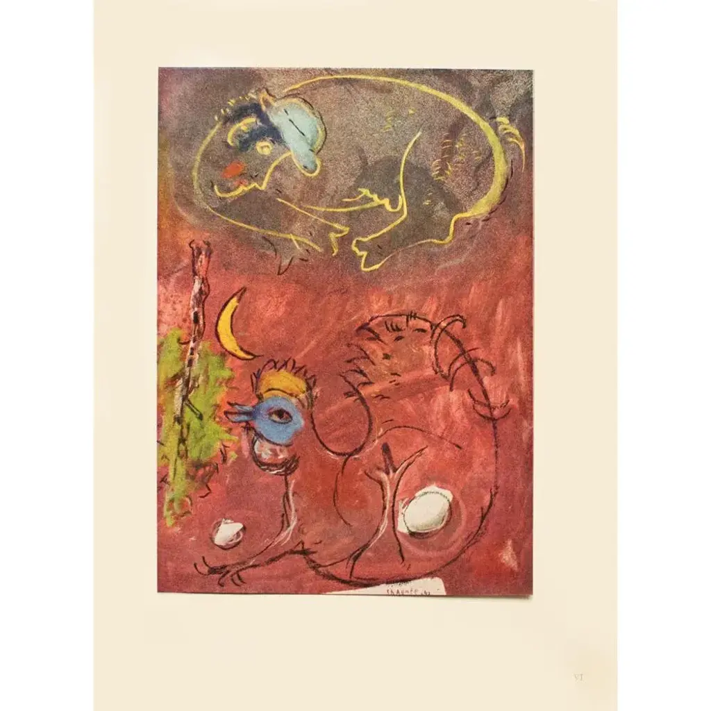 A stunning vintage period offset lithograph, print, after painting "En Ecoutant le Coq" (Listening To The Rooster, 1944) by Marc Chagall. Comes from a First Limited Edition of XVI pieces of Chagall's art portfolio, published by Les Editions du Chene in Paris, France in 1947. The Edition No. 195. Signed in the print. Printed on one side. Hand tipped-in on a board of heavy paper. Information regarding the original artwork, in French, will be found by lifting the piece. Numbered on the board: VI. Excellent condition of the print; minor edge wear on the board; never framed. Overall 11"W x 15"H Image 7.8"W x 11"H On the subject of the editor: Editions du Chêne, Paris 1941, it is an occupied Paris which witnesses the emergence, 16, place Vendôme, of the Editions du Chêne. A risky bet given that its 21-year old founder was called Maurice Kahane, an atheist Jewish man who would then adopt the name of his mother, Girodias. The Chêne specialized itself by the edition of art books and literature. The Editions du Chêne would become a branch of the Hachette group in 1951. The edition of art books would then adopt pride of place. George Herscher takes over the Hachette house with enthusiasm in 1971.