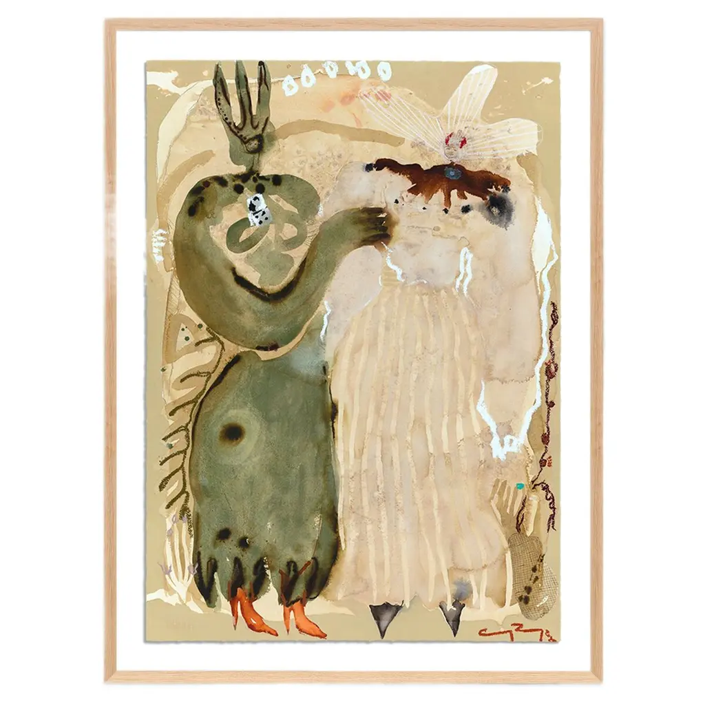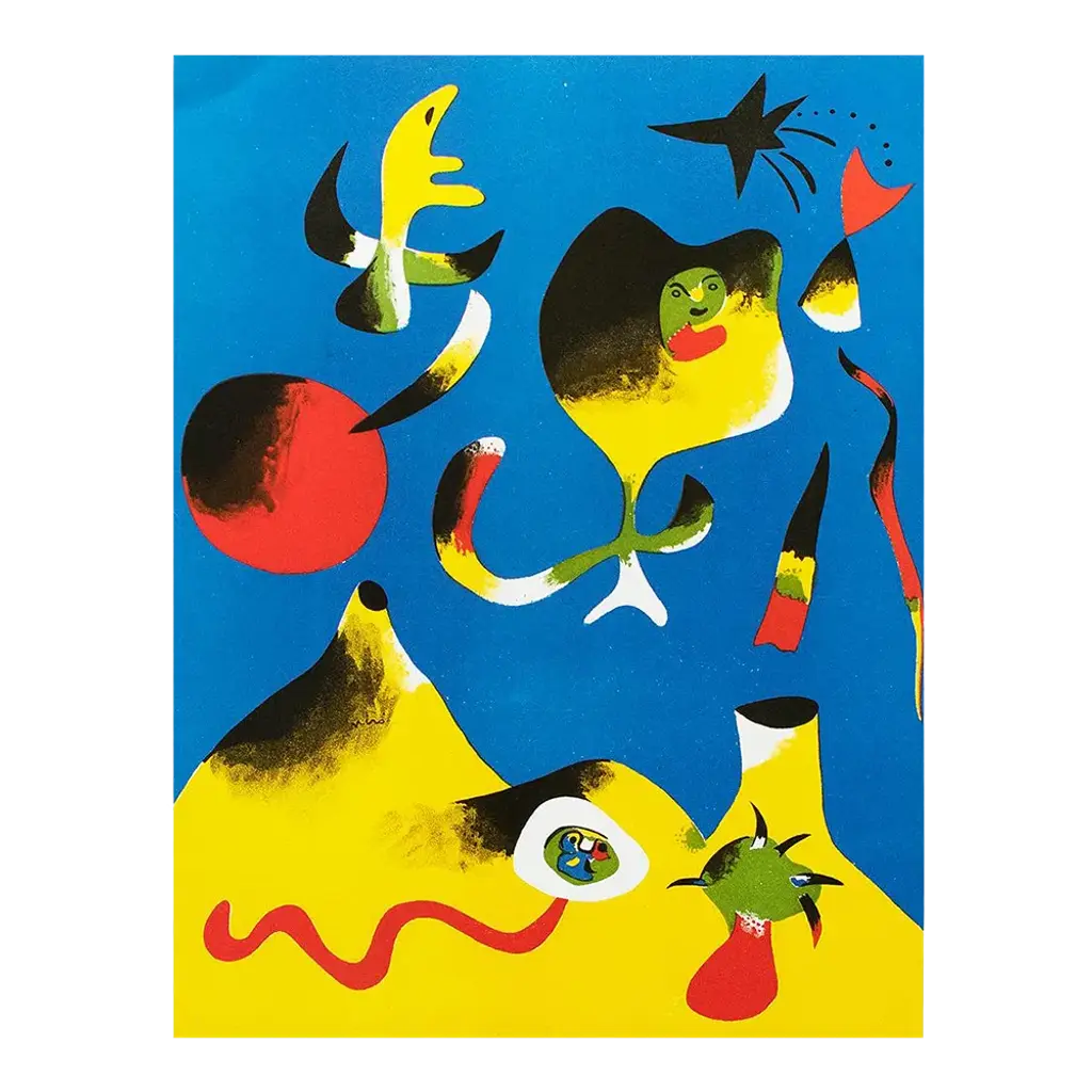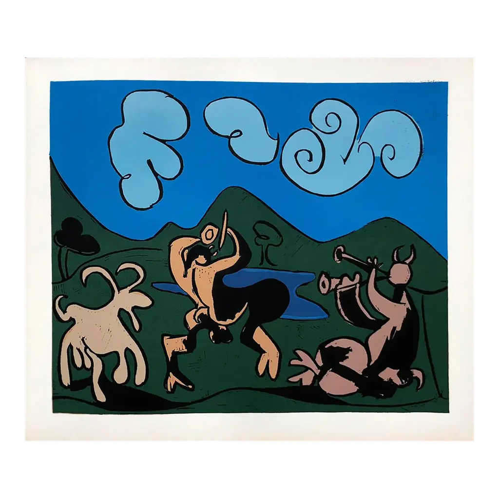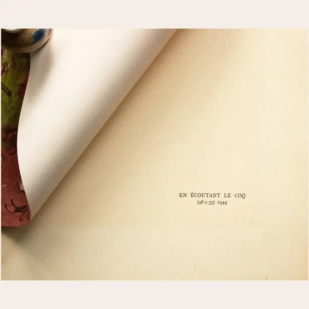 A stunning vintage period offset lithograph, print, after painting "En Ecoutant le Coq" (Listening To The Rooster, 1944) by Marc Chagall. Comes from a First Limited Edition of XVI pieces of Chagall's art portfolio, published by Les Editions du Chene in Paris, France in 1947. The Edition No. 195. Signed in the print. Printed on one side. Hand tipped-in on a board of heavy paper. Information regarding the original artwork, in French, will be found by lifting the piece. Numbered on the board: VI. Excellent condition of the print; minor edge wear on the board; never framed. Overall 11"W x 15"H Image 7.8"W x 11"H On the subject of the editor: Editions du Chêne, Paris 1941, it is an occupied Paris which witnesses the emergence, 16, place Vendôme, of the Editions du Chêne. A risky bet given that its 21-year old founder was called Maurice Kahane, an atheist Jewish man who would then adopt the name of his mother, Girodias. The Chêne specialized itself by the edition of art books and literature. The Editions du Chêne would become a branch of the Hachette group in 1951. The edition of art books would then adopt pride of place. George Herscher takes over the Hachette house with enthusiasm in 1971.