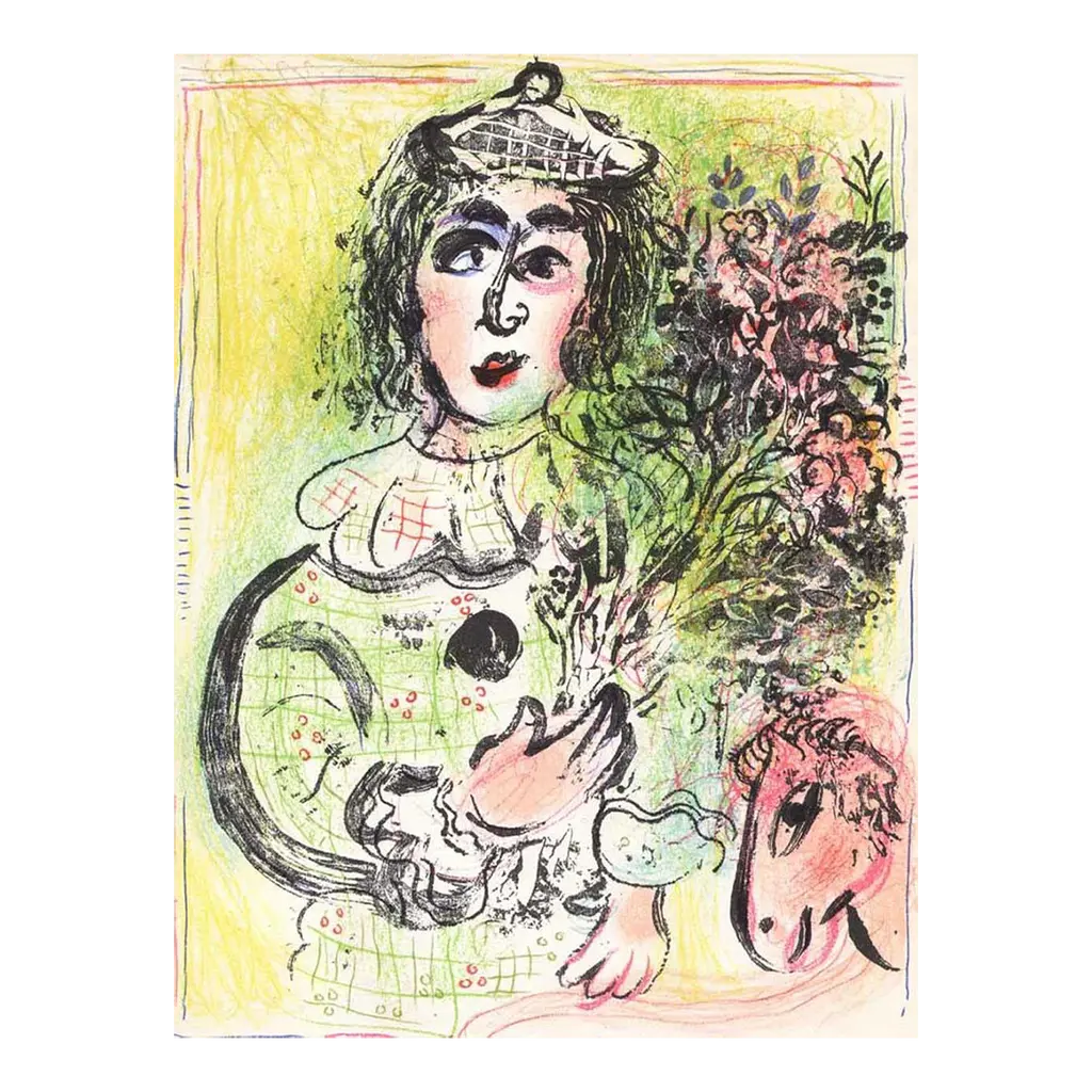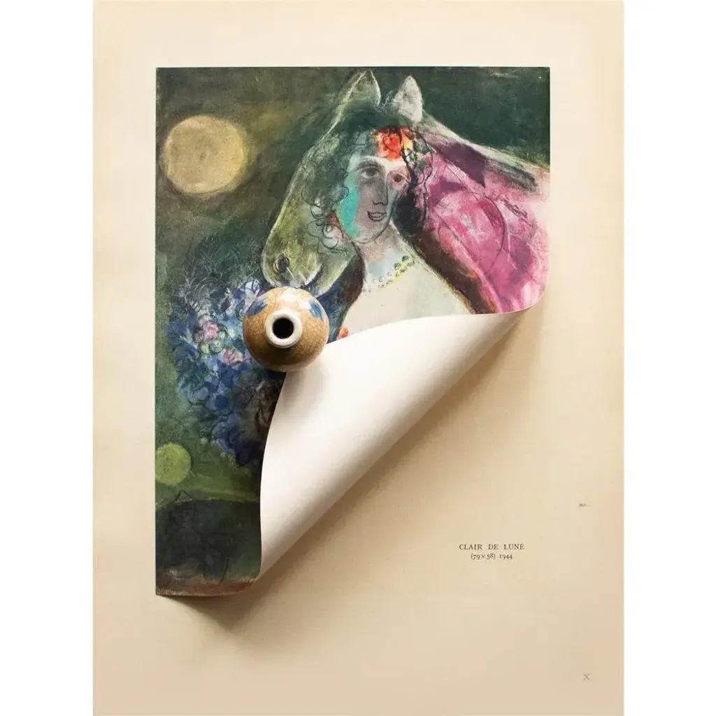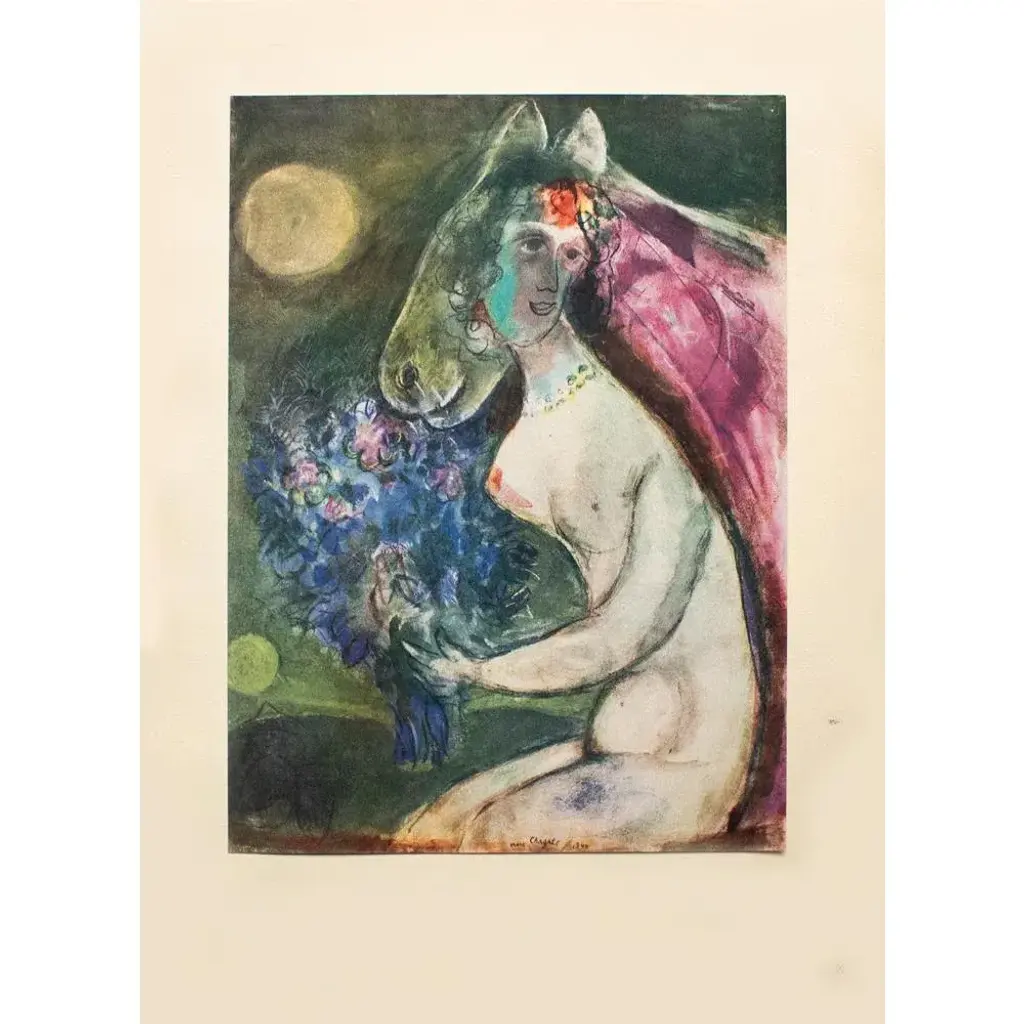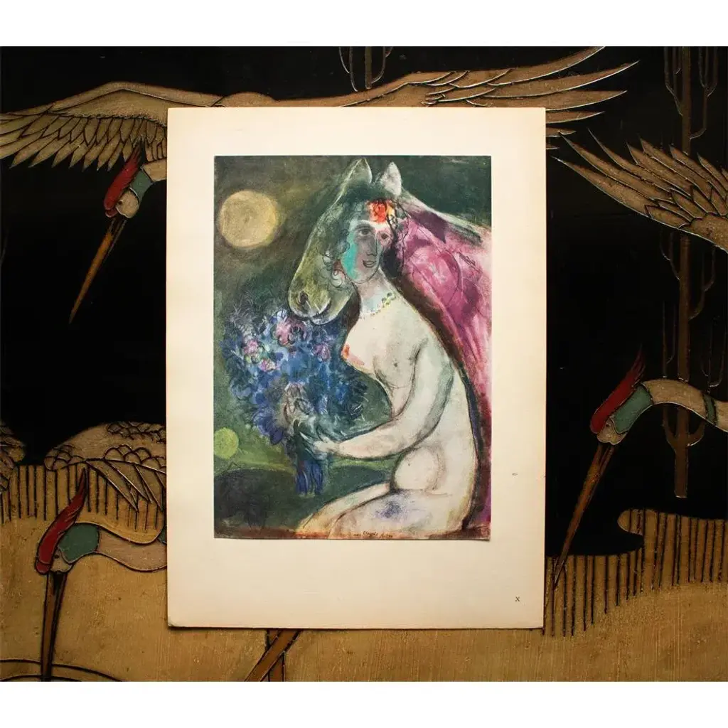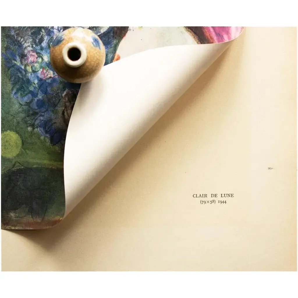 A stunning vintage period offset lithograph, print, after painting "Clair de Lune" (Moonlight, 1944) by Marc Chagall. Comes from a First Limited Edition of XVI pieces of Chagall's art portfolio, published by Les Editions du Chene in Paris, France in 1947. The Edition No. 195. Signed and dated in the print. Printed on one side. Hand tipped-in on a board of heavy paper. Information regarding the original artwork, in French, will be found by lifting the piece. Numbered on the board: X. Excellent condition of the print; minor edge wear on the board; never framed. Overall 11"W x 15"H Image 7.75"W x 11"H On the subject of the editor: Editions du Chêne, Paris 1941, it is an occupied Paris which witnesses the emergence, 16, place Vendôme, of the Editions du Chêne. A risky bet given that its 21-year old founder was called Maurice Kahane, an atheist Jewish man who would then adopt the name of his mother, Girodias. The Chêne specialized itself by the edition of art books and literature. The Editions du Chêne would become a branch of the Hachette group in 1951. The edition of art books would then adopt pride of place. George Herscher takes over the Hachette house with enthusiasm in 1971.