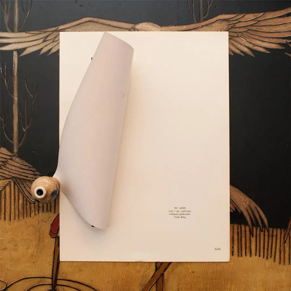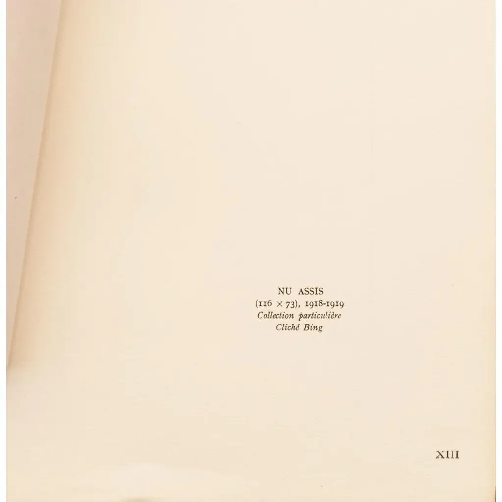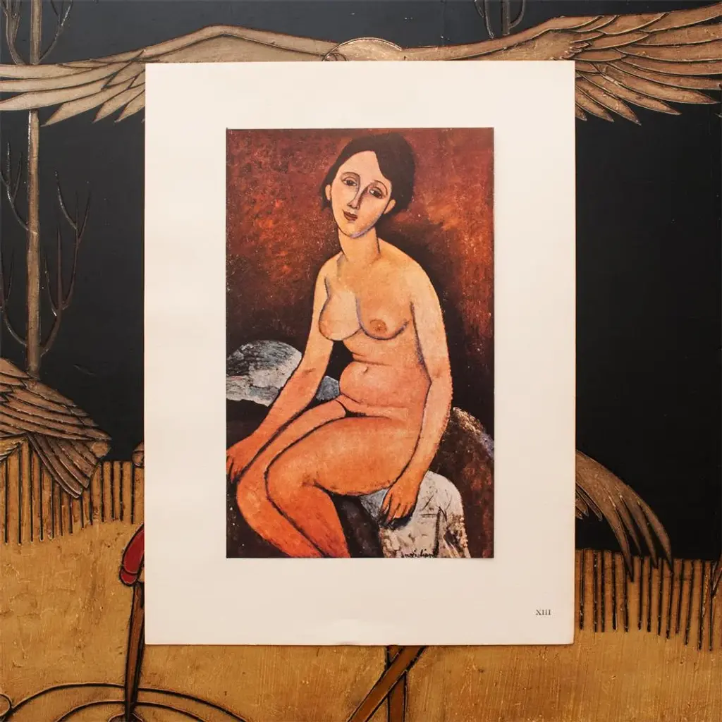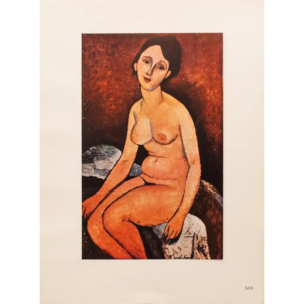 First Edition offset lithograph, full-color print, of painting Seated Nude by Amedeo Modigliani. Comes from a First Limited Edition folio published by Les Editions Du Chene in Paris, 1947. Signed in the print: Modigliani. Printed on one side. Hand tipped-in on a board of heavy paper. Numbered "XIII." Information regarding the original artwork, in French, will be found by lifting the piece. Excellent condition - never framed. Image: 6.75"L x 11"H. Modigliani's nudes scandalized audiences with their depiction of features such as pubic hair and their frank, unadorned sexuality. This is what the artist said about it: "Every great work of art should be considered like any work of nature. First of all from the point of view of its aesthetic reality and then not just from its development and the mastery of its creation but from the standpoint of what has moved and agitated its creator." Amedeo Clemente Modigliani (1884 - 1920) was an Italian artist of Jewish heritage, practicing both painting and sculpture, who pursued his career for the most part in France. Modigliani was born in Livorno (historically referred to in English as Leghorn), in Northwestern Italy and began his artistic studies in Italy before moving to Paris in 1906. Influenced by the artists in his circle of friends and associates, by a range of genres and art movements, and by primitive art, Modigliani's oeuvre was nonetheless unique and idiosyncratic. He died in Paris of tubercular meningitis, exacerbated by poverty, overworking, and an excessive use of alcohol and narcotics, at the age of 35. On the subject of the editor: Editions du Chêne, Paris 1941, it is an occupied Paris which witnesses the emergence, 16, place Vendôme, of the Editions du Chêne. A risky bet given that its 21-year old founder was called Maurice Kahane, an atheist Jewish man who would then adopt the name of his mother, Girodias. The Chêne specialized itself by the edition of art books and literature. The Editions du Chêne would become a branch of the Hachette group in 1951. The edition of art books would then adopt pride of place. George Herscher takes over the Hachette house with enthusiasm in 1971.