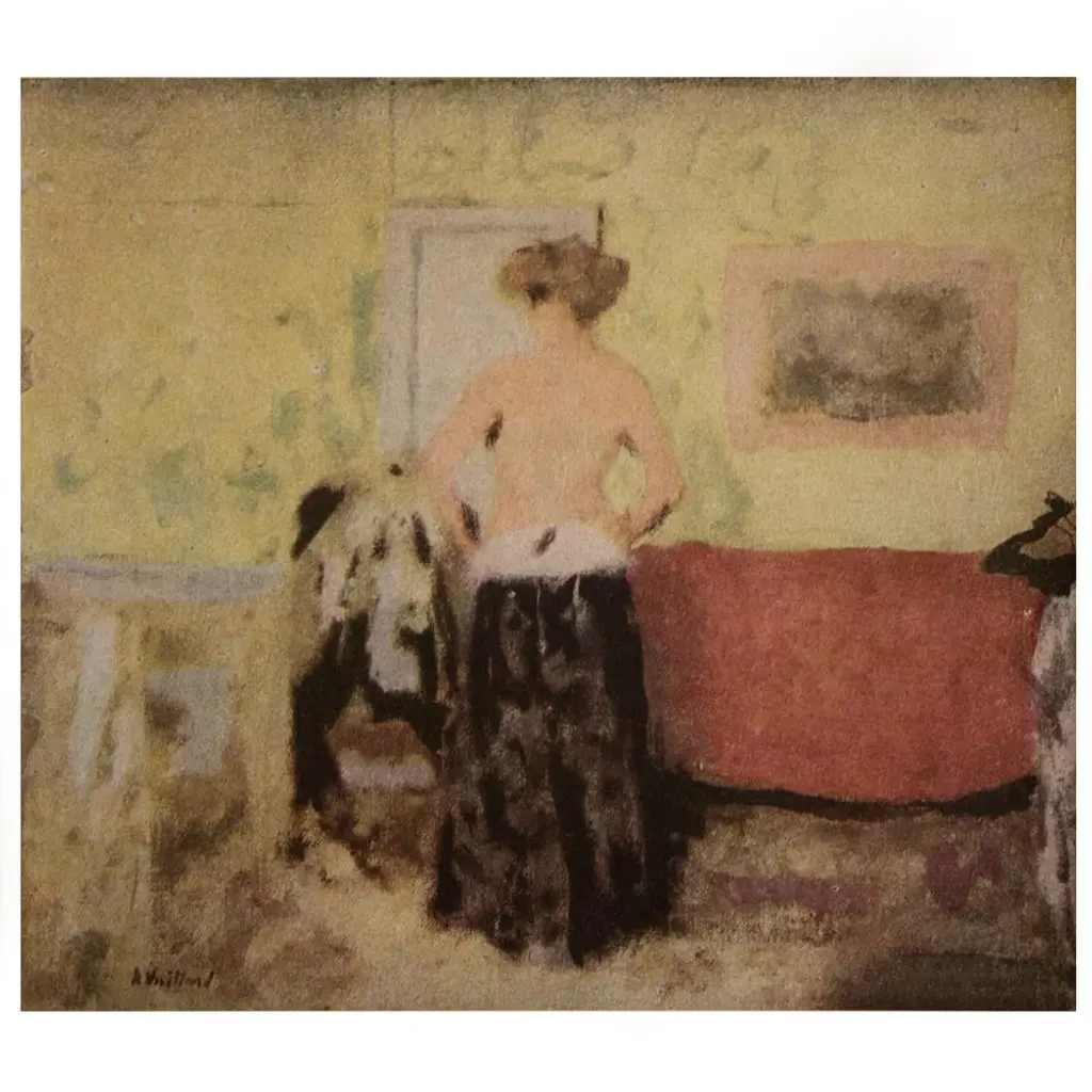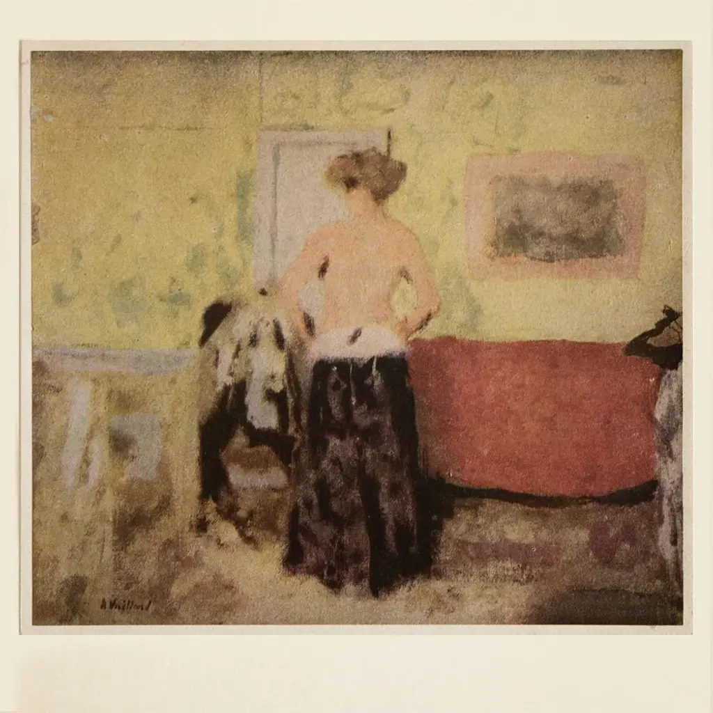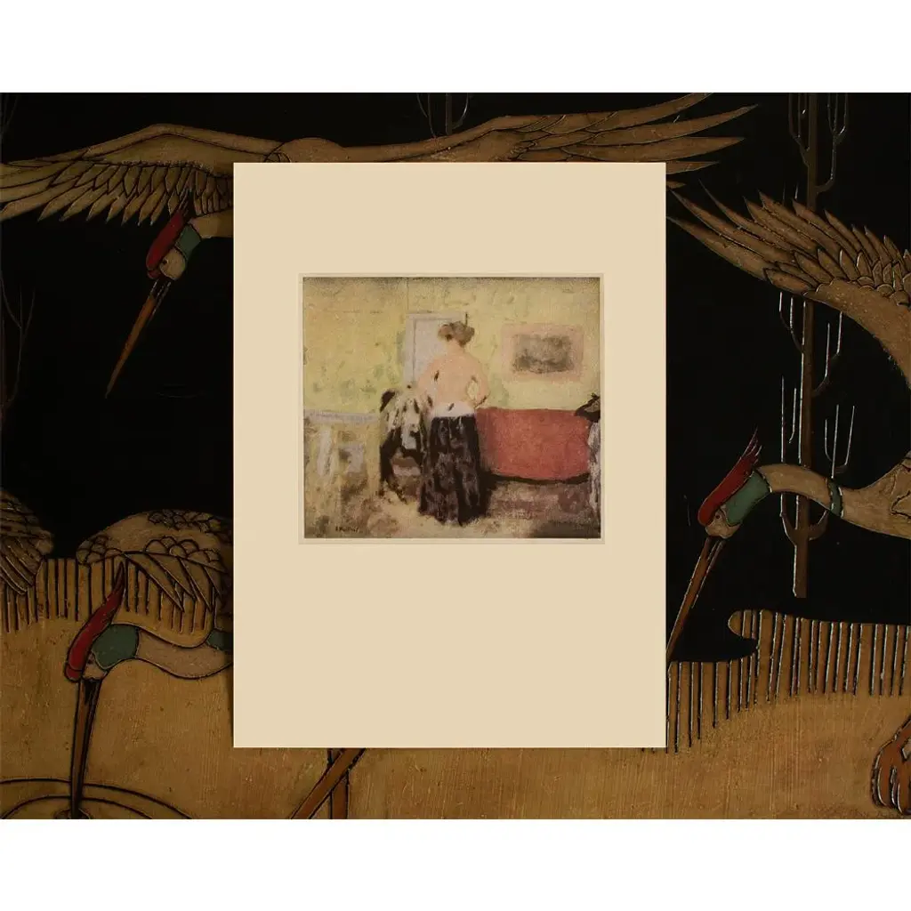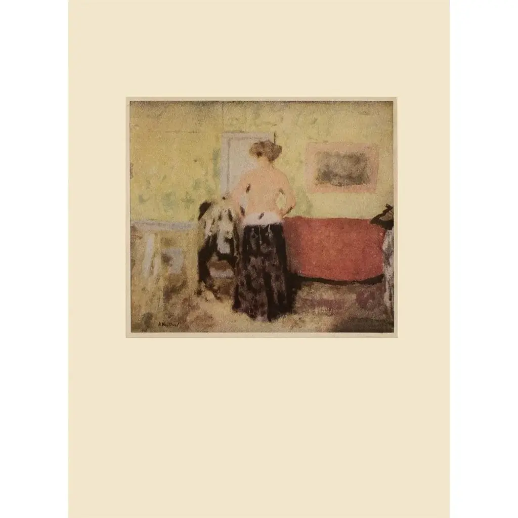A lovely vintage First Edition offset lithograph after painting "Woman Undressing" (1905) by French artist Edouard Vuillard. Comes from a rare First Limited Edition art folio published by Editions du Chene in Paris, France, in 1948. Edition N 212. Signed in the print. Printed on one side. Mounted on 2 boards of heavy vintage paper. Excellent condition - minor age wear, never framed. Overall 10.90"W x 14.95"H Image 7.5"W x 6.65"H
