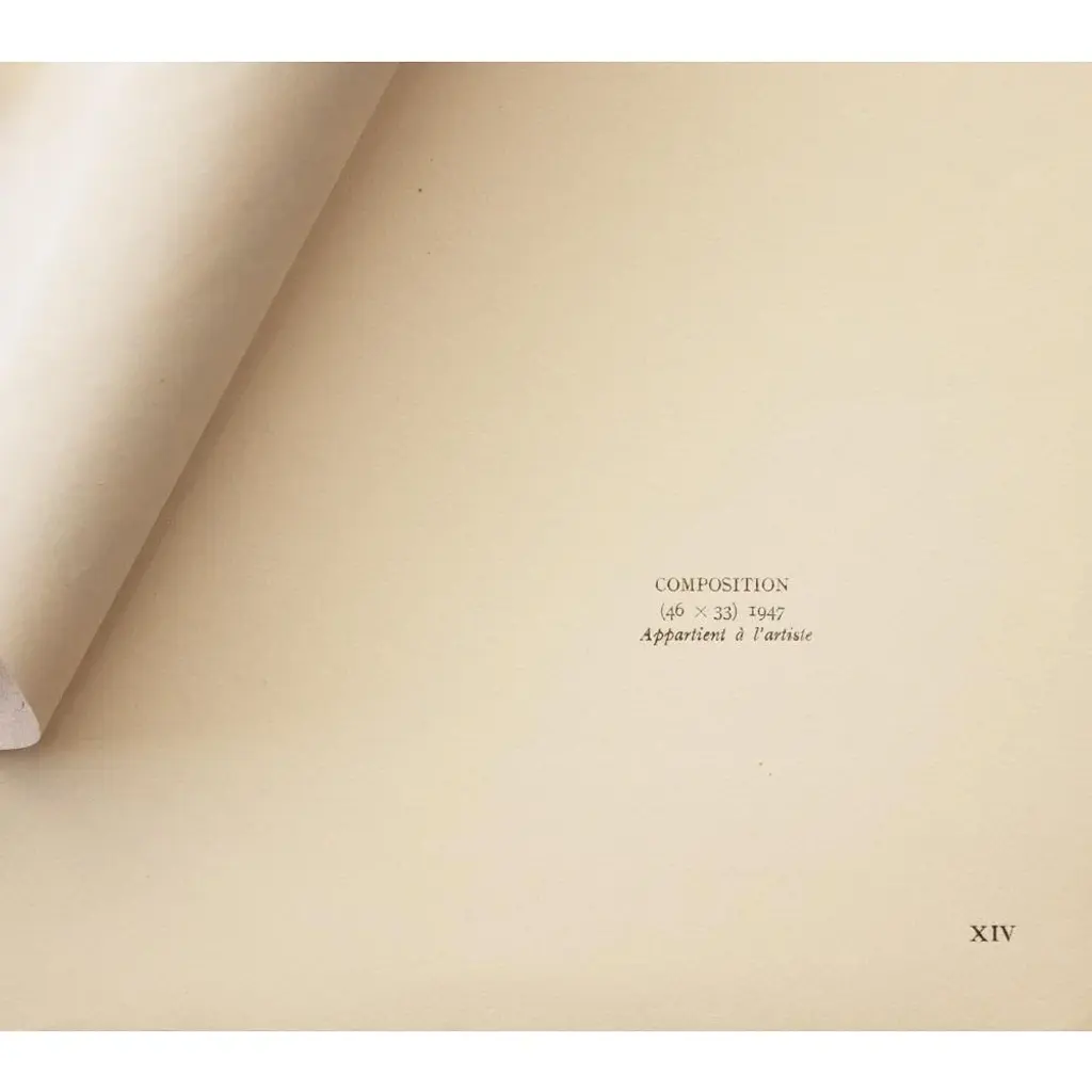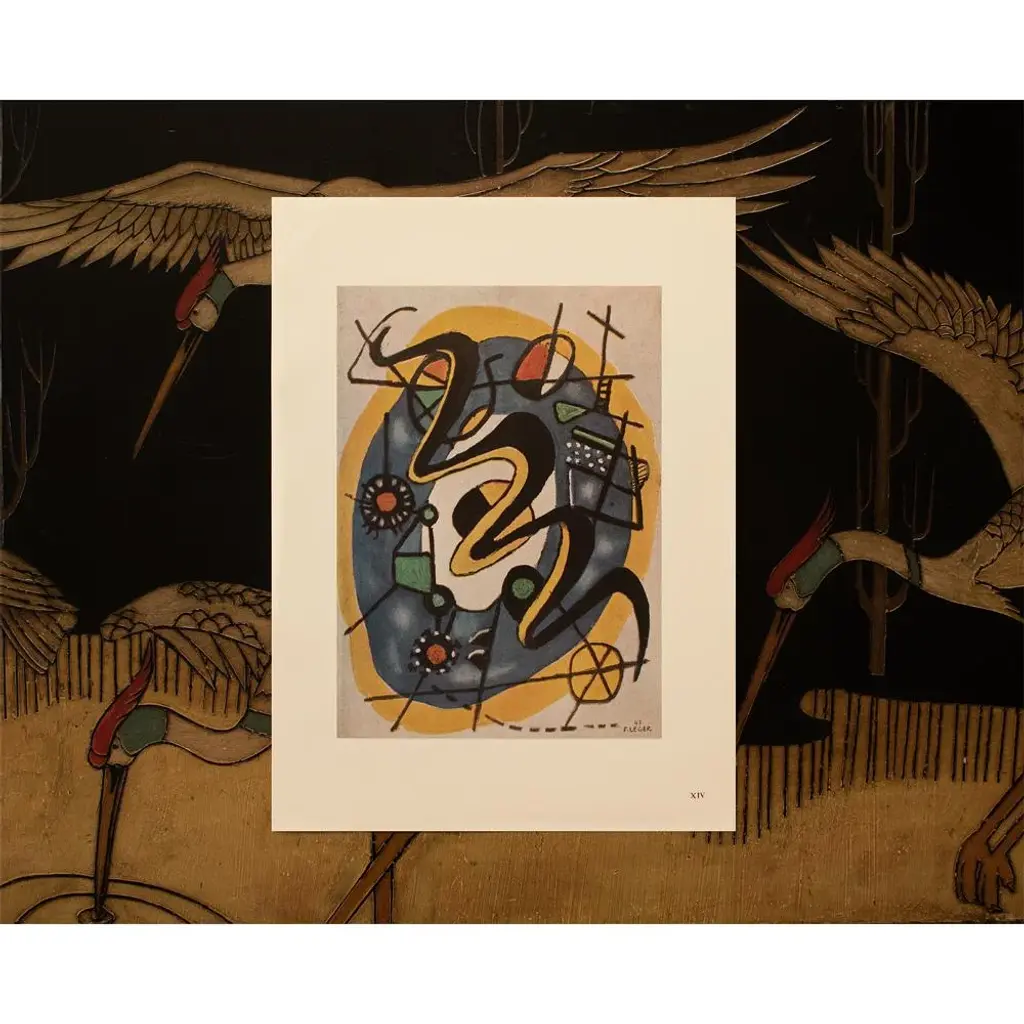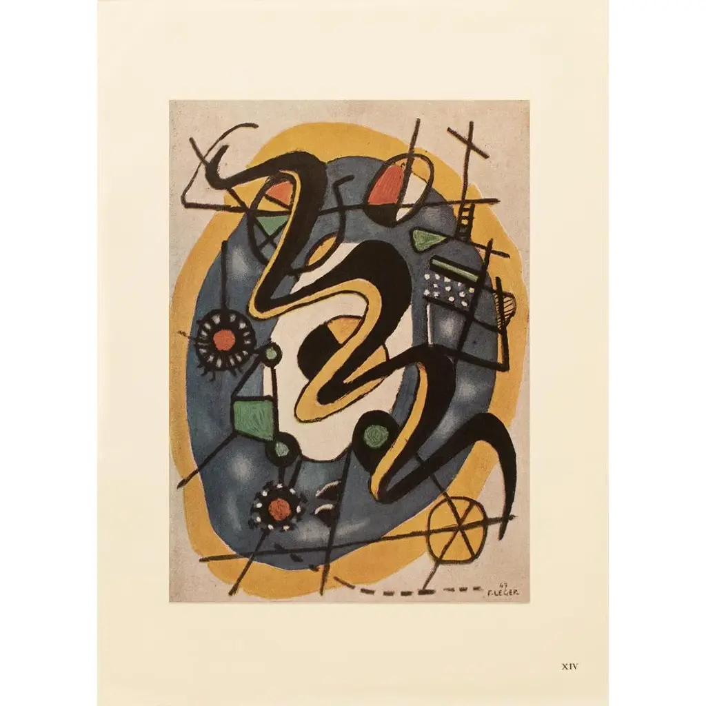 An excellent period offset lithograph, print, of painting Composition (1947) by Fernand Léger. Comes from a First Limited Edition art folio published by Editions Du Chene in Paris, France in 1948. Edition N266. Signed in the print (printed) at the lower right corner: "47 F. Leger". Printed on one side. Hand tipped-in on a board of heavy paper. Information regarding the original artwork will be found in French by lifting the piece. Numbered "XIV" in lower right corner. Excellent condition of the print; minor age and edge wear on the board; never framed. This period offset lithograph was printed a year after the original artwork was painted. Overall 11"W x 15"H Image 7.5"W x 10.60"H