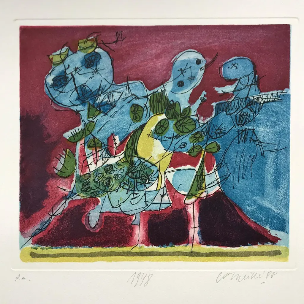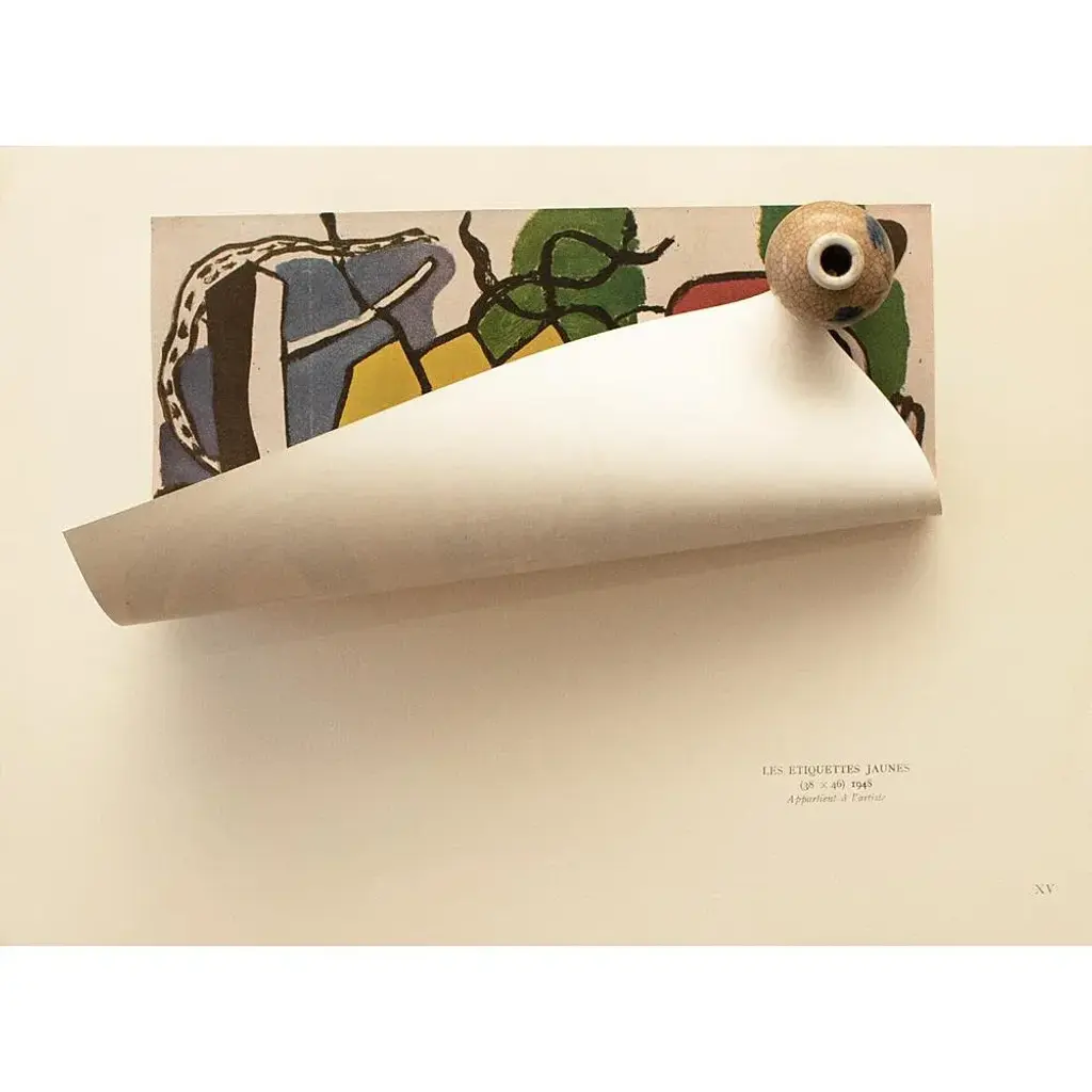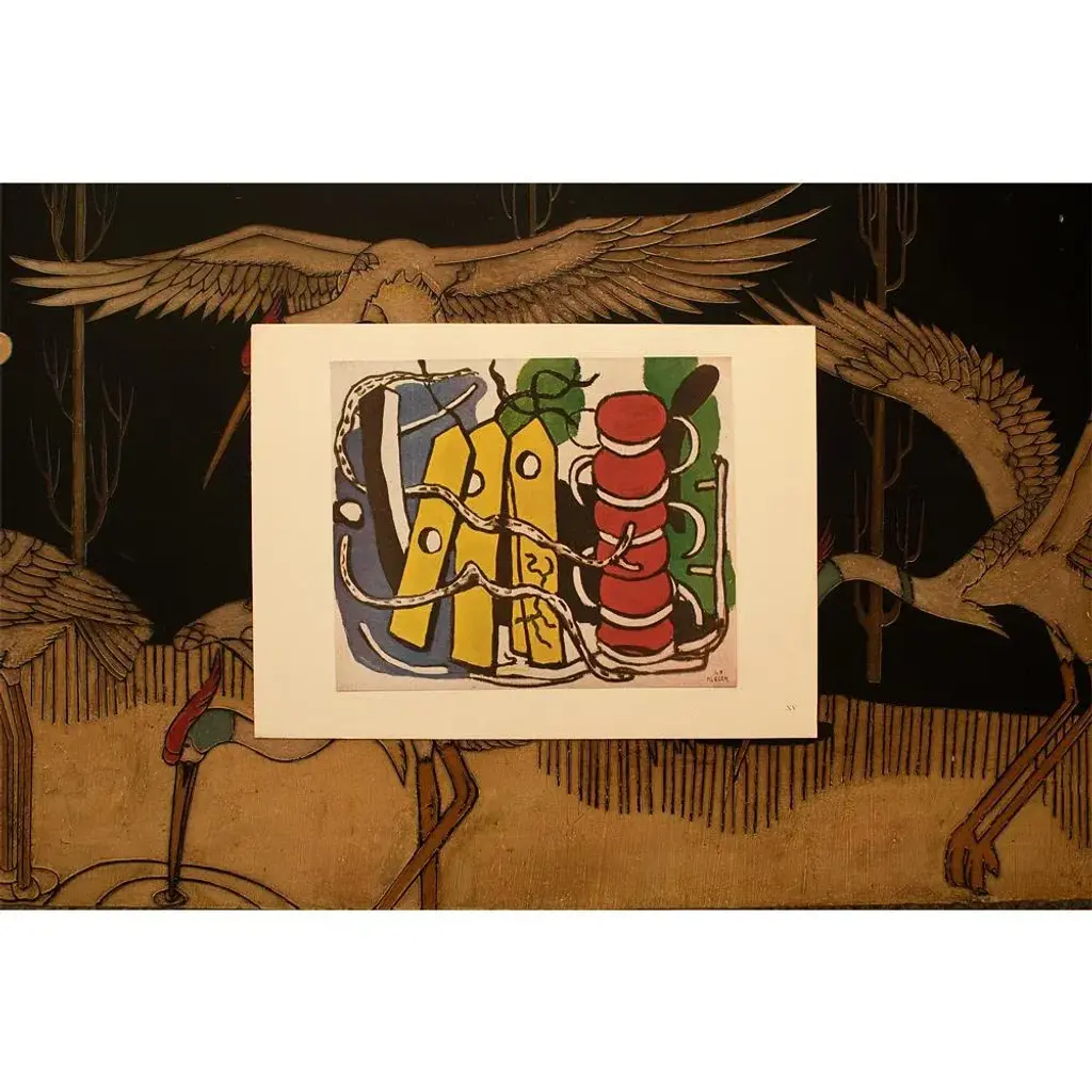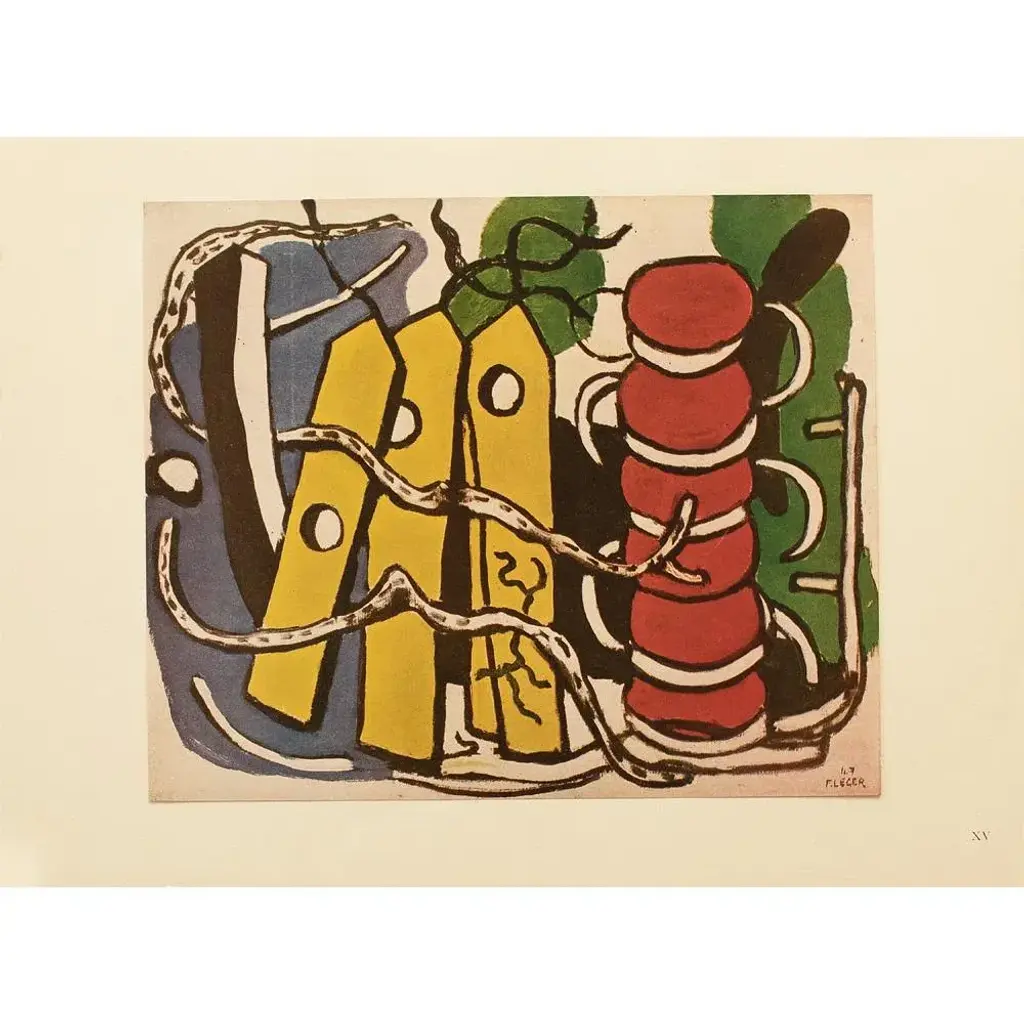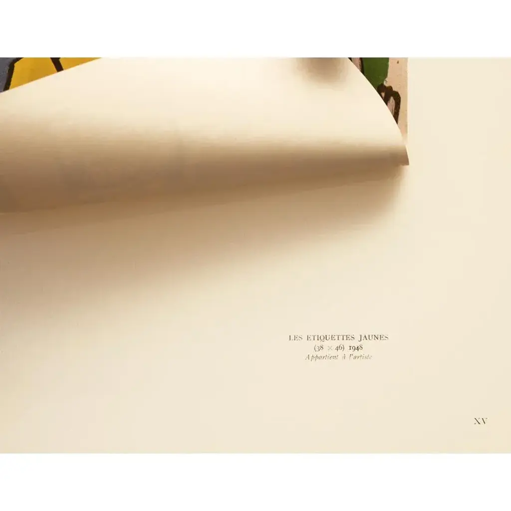 An excellent First Edition period offset lithograph, print, of painting Les Etiquettes Jaunes (The Yellow Labels, 1948) by Fernand Léger. Comes from a First Limited Edition folio published by Editions Du Chene in Paris, France in 1948. Edition N266. Signed in the print (printed) at the lower right corner: "47 F. Leger". Printed on one side. Hand tipped-in on a board of heavy paper. Information regarding the original artwork will be found in French by lifting the piece. Numbered "XV" in lower right corner. Excellent condition of the print; minor age and edge wear on the board; never framed. Overall 15"W x 11"H Image 10.5"W x 8.65"H