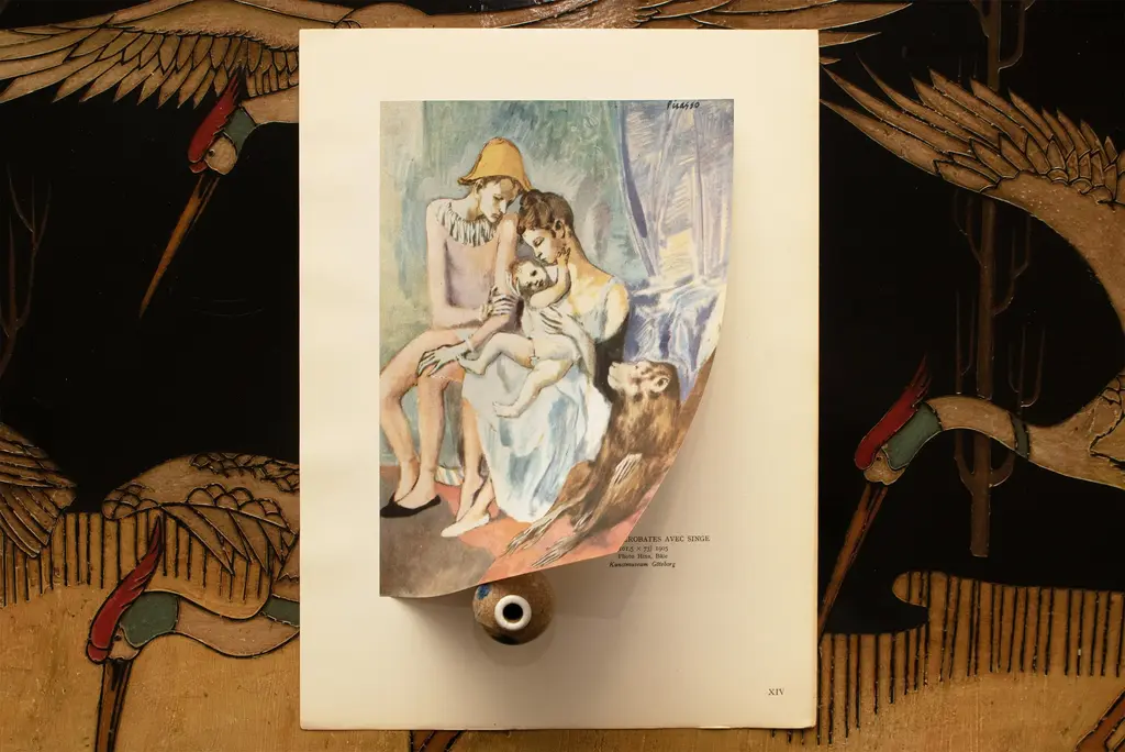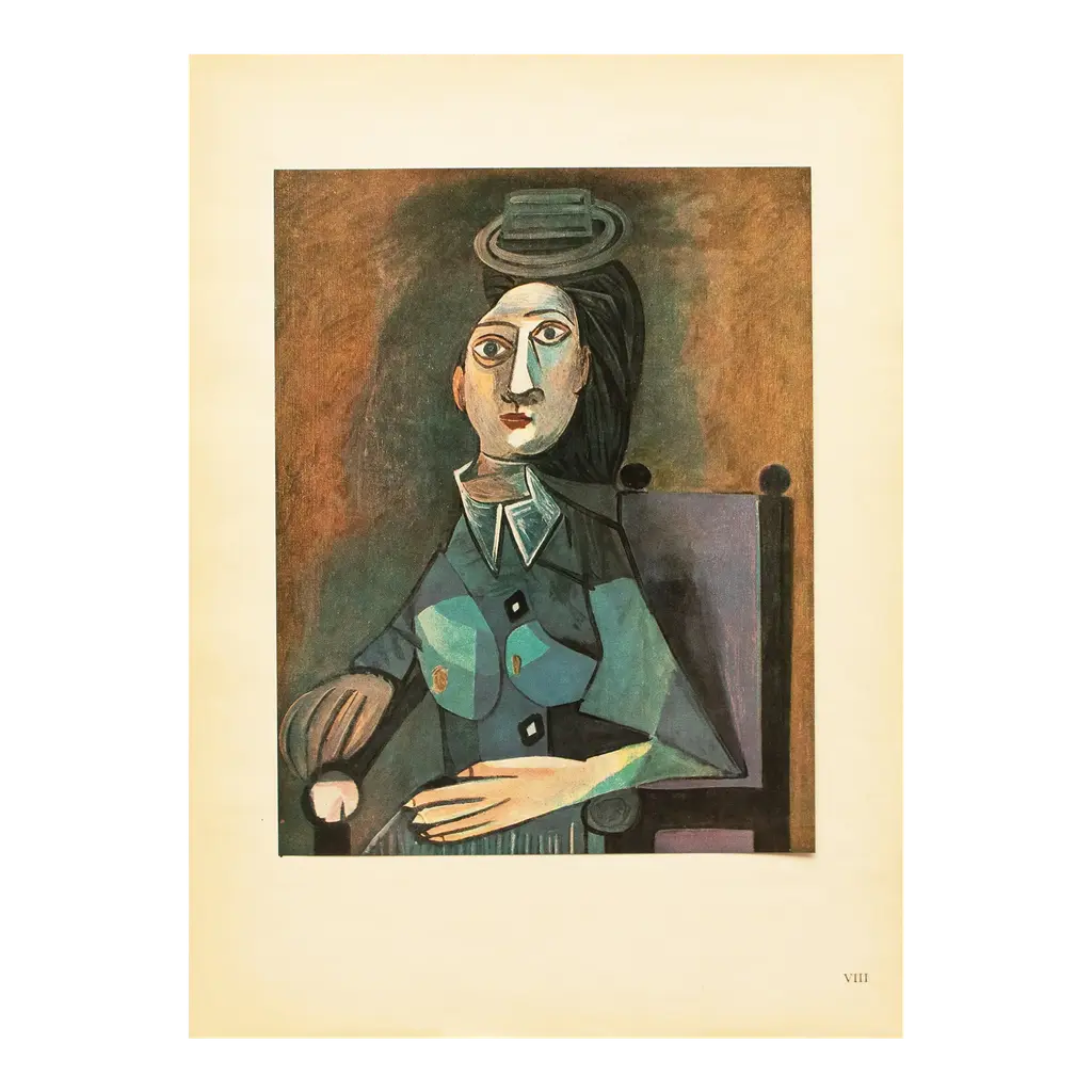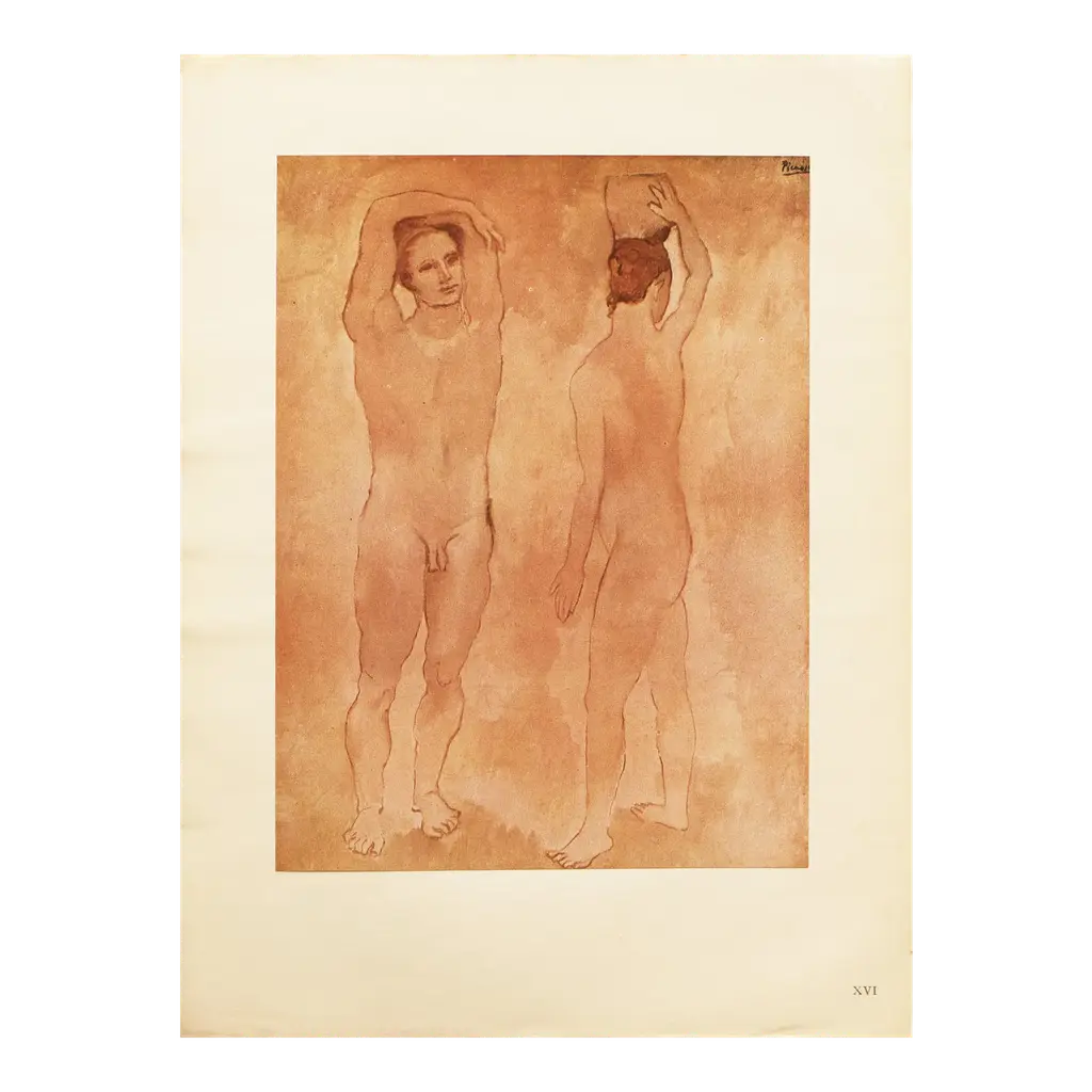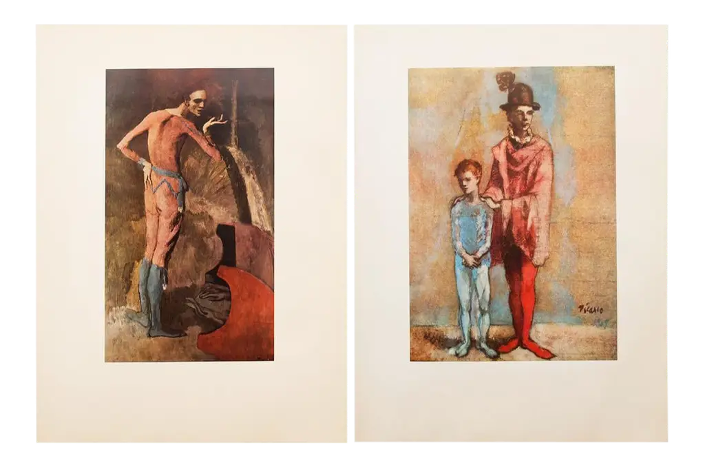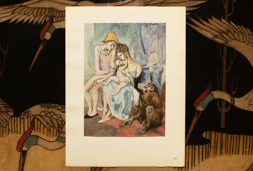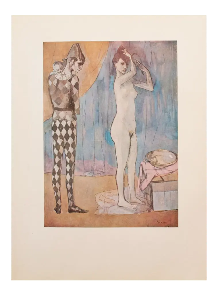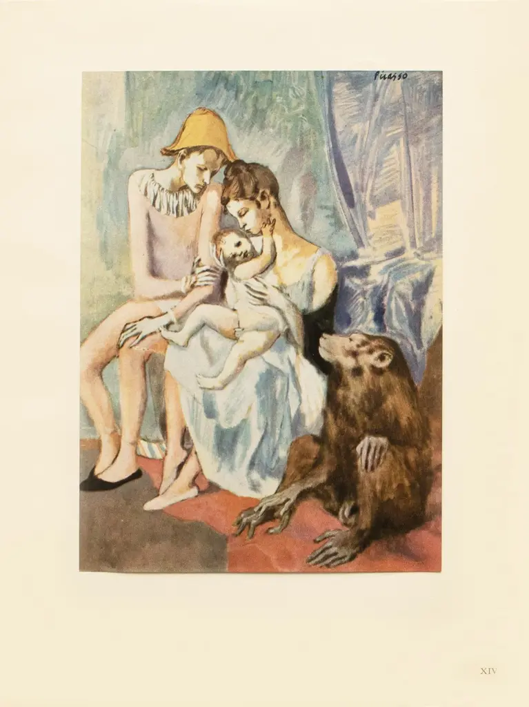 A stunning period offset lithograph, print, after painting "Famille D'Acrobates Aves Singe" (The Acrobat's Family with a Monkey, 1905) by Pablo Picasso. Comes from a First Limited Edition art folio, published by Editions du Chene in Paris, France in 1948. Edition N269. Printed on one side. Hand tipped-in on a board of heavy paper. Information regarding the original artwork, in French, will be found by lifting the piece. Numbered on the board: XIV. Excellent condition of the print; minor age wear on the board; never framed. Overall 10.95"W x 14.90"H Image 7.45"W x 10.50"H On the subject of the editor: Editions du Chêne, Paris 1941, it is an occupied Paris which witnesses the emergence, 16, place Vendôme, of the Editions du Chêne. A risky bet given that its 21-year old founder was called Maurice Kahane, an atheist Jewish man who would then adopt the name of his mother, Girodias. The Chêne specialized itself by the edition of art books and literature. The Editions du Chêne would become a branch of the Hachette group in 1951. The edition of art books would then adopt pride of place. George Herscher takes over the Hachette house with enthusiasm in 1971.