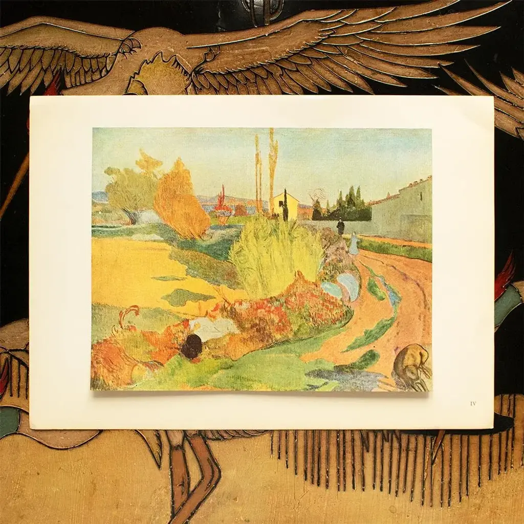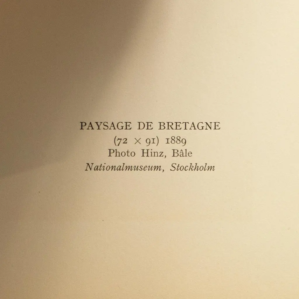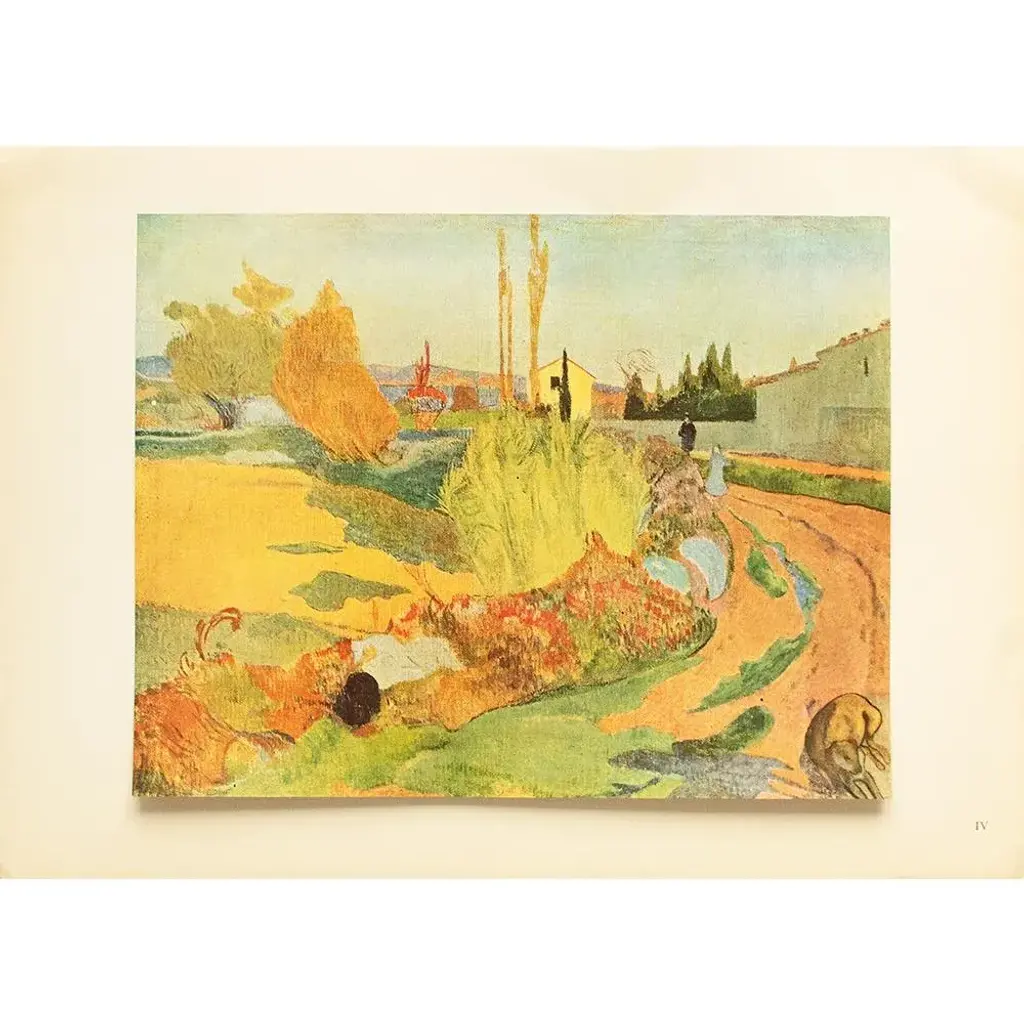 A lovely vintage offset lithograph (print) of painting "Landscape in Brittany" by a major 19th-century painter, Paul Gauguin. Comes from a rare First Limited Edition art folio published by Editions du Chene in Paris, France, in 1949. Printed on one side. Hand tipped-in on a board of heavy paper. Information regarding the original artwork will be found by lifting the print, in French. Excellent condition - minor edge wear on the board, never framed. Overall 14"W x 11"H Image 10.9"W x 8.50"H