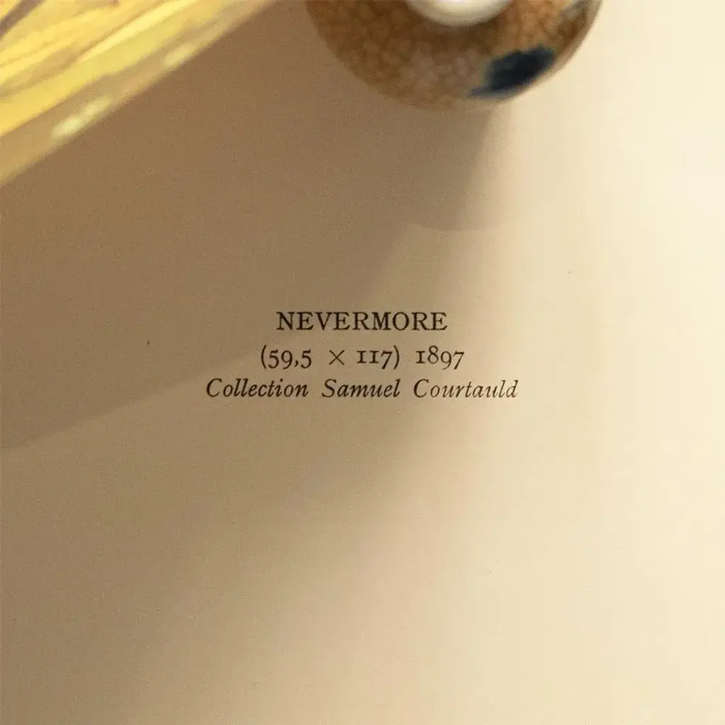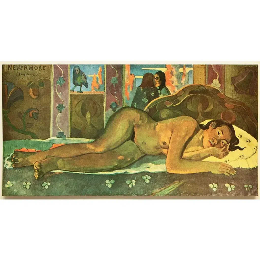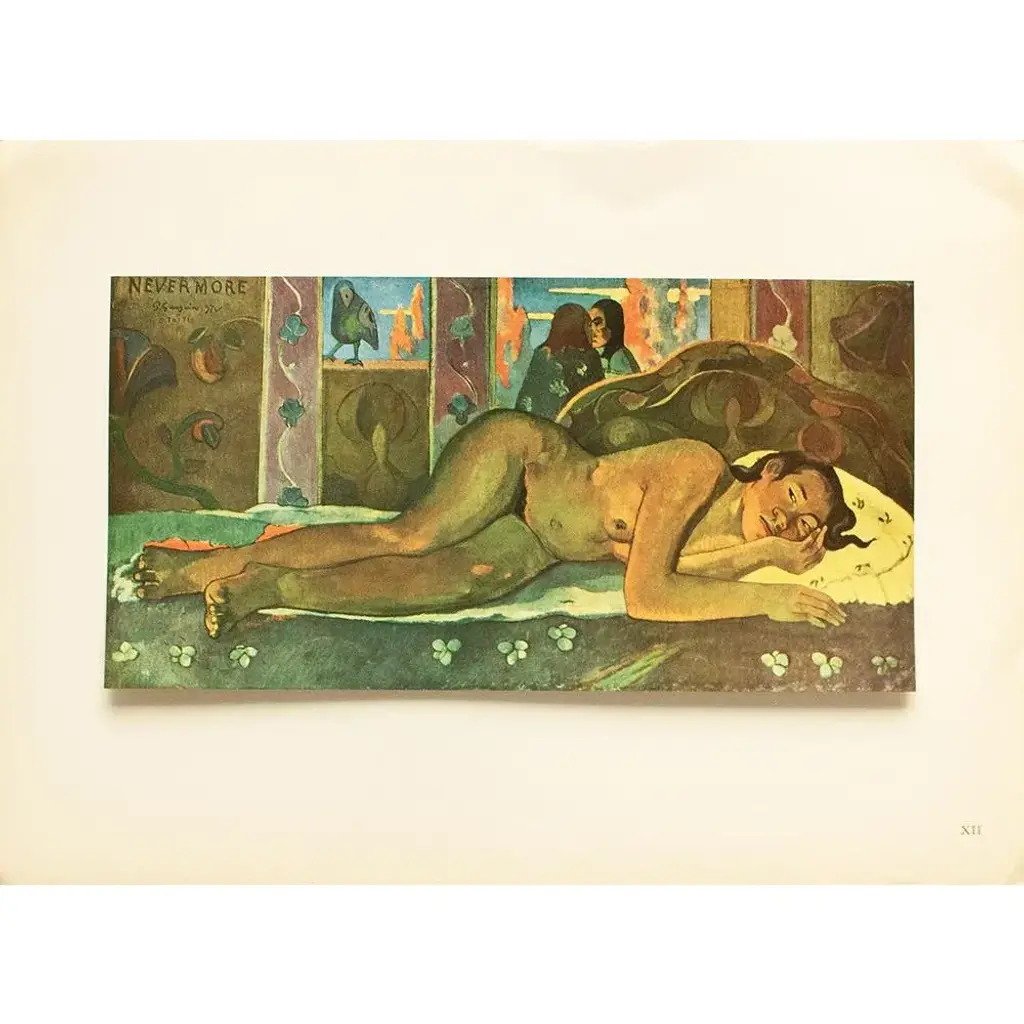 A lovely vintage offset lithograph (print) of painting "Nevermore" by a major 19th-century painter, Paul Gauguin. Comes from a rare First Limited Edition art folio published by Editions du Chene in Paris, France, in 1949. Printed on one side. Hand tipped-in on a board of heavy paper. Information regarding the original artwork will be found by lifting the print, in French. Excellent condition - minor edge wear on the board, never framed. Overall 14"W x 11"H Image 11.60"W x 6"H
