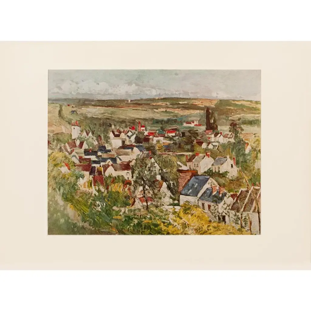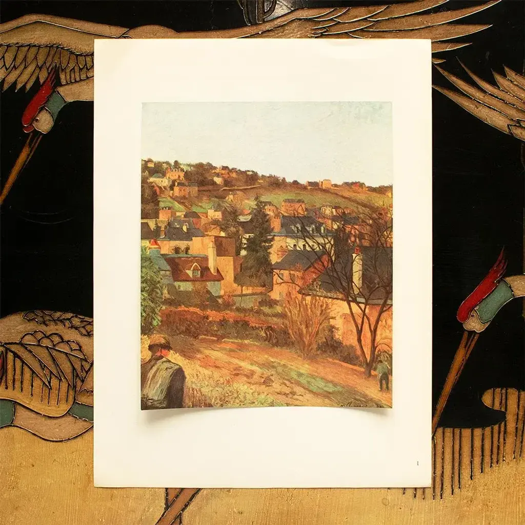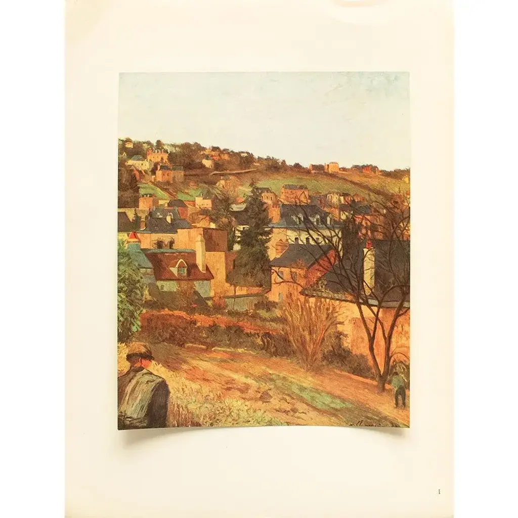 A lovely vintage offset lithograph (print) of painting "The Blue Roofs" by a major 19th-century painter, Paul Gauguin. Comes from a rare First Limited Edition art folio published by Editions du Chene in Paris, France, in 1949. Printed on one side. Hand tipped-in on a board of heavy paper. Information regarding the original artwork will be found by lifting the print, in French. Excellent condition - minor edge wear on the board, never framed. Overall 11"W x 14"H Image 8.10"W x 10.10"H